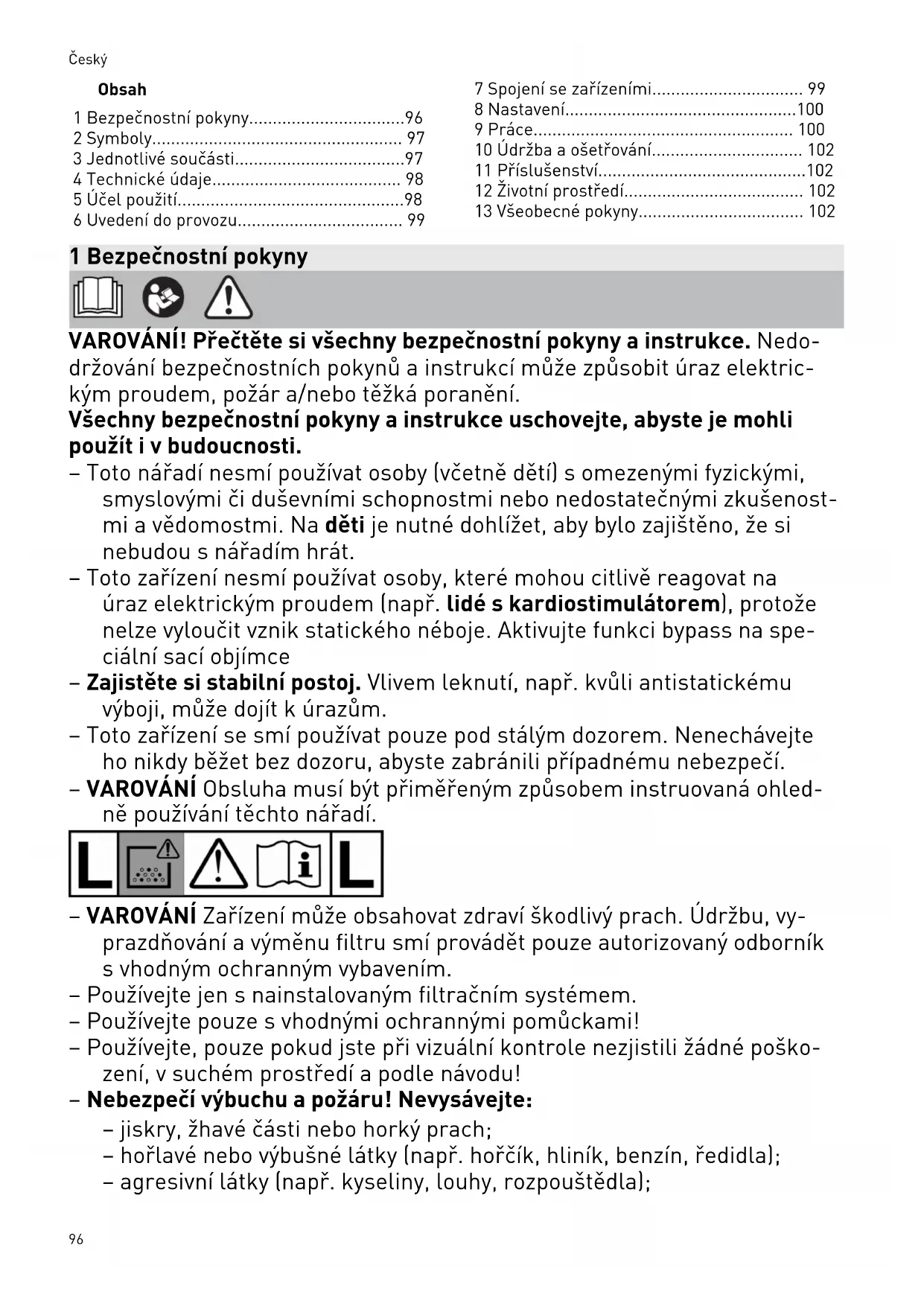 - 13 Všeobecné pokyny 1 Bezpečnostní pokyny VAROVÁNÍ! Přečtěte si všechny bezpečnostní pokyny ainstrukce. Nedo držování bezpečnostních pokynů ainstrukcí může způsobit úraz elektric kým proudem, požár a/nebo těžká poranění. Všechny bezpečnostní pokyny ainstrukce uschovejte, abyste je mohli použít ivbudoucnosti. – Toto nářadí nesmí používat osoby (včetně dětí) somezenými fyzickými, smyslovými či duševními schopnostmi nebo nedostatečnými zkušenost mi avědomostmi. Na děti je nutné dohlížet, aby bylo zajištěno, že si nebudou snářadím hrát. – Toto zařízení nesmí používat osoby, které mohou citlivě reagovat na úraz elektrickým proudem (např. lidé s kardiostimulátorem), protože nelze vyloučit vznik statického néboje. Aktivujte funkci bypass na spe ciální sací objímce – Zajistěte si stabilní postoj. Vlivem leknutí, např. kvůli antistatickému výboji, může dojít kúrazům. – Toto zařízení se smí používat pouze pod stálým dozorem. Nenechávejte ho nikdy běžet bez dozoru, abyste zabránili případnému nebezpečí. – VAROVÁNÍ Obsluha musí být přiměřeným způsobem instruovaná ohled ně používání těchto nářadí. – VAROVÁNÍ Zařízení může obsahovat zdraví škodlivý prach. Údržbu, vy prazdňování avýměnu filtru smí provádět pouze autorizovaný odborník svhodným ochranným vybavením. – Používejte jen snainstalovaným filtračním systémem. – Používejte pouze svhodnými ochrannými pomůckami! – Používejte, pouze pokud jste při vizuální kontrole nezjistili žádné poško zení, vsuchém prostředí apodle návodu! – Nebezpečí výbuchu apožáru! Nevysávejte: – jiskry, žhavé části nebo horký prach; – hořlavé nebo výbušné látky (např. hořčík, hliník, benzín, ředidla); – agresivní látky (např. kyseliny, louhy, rozpouštědla); Český 96– chemicky reaktivní látky, které vedou kvzniku tepla, kyselin/zásad, plynů atd. (např. reaktivní dvousložkové materiály, hliník avoda). – Dodržujte národní bezpečnostní předpisy ařiďte se údaji výrobce mate riálu! – VAROVÁNÍ Zásuvku na zařízení používejte pouze kúčelům, které jsou stanovené vnávodu. – Pravidelně kontrolujte zástrčku, zásuvku, kabel afiltr, abyste zabránili ohrožení. Poškozené elektrické součásti nechte vyměnit výhradně vau torizovaném zákaznickém servisu. – Před čištěním nebo výměnou opotřebovaných dílů nebo při přestavbě zařízení se musí vždy nejprve odpojit síťová zástrčka ze zásuvky. – POZOR Pravidelně čistěte zařízení omezující hladinu vody akontrolujte, zda nevykazuje známky poškození. – VAROVÁNÍ Uniká-li pěna nebo kapalina, zařízení ihned vypněte. – Používejte pouze originální sací hadici Festool. – Zohledněte příslušné pracoviště apři přepravě nebo práci se zaříze ním dávejte pozor na sebe ana ostatní. Zabráníte tak např. zakopnutí osací hadici nebo síťový kabel. – Zařízení přenášejte jen za držadlo, které je ktomu určené. – Nezvedejte anepřemisťujte pomocí háku jeřábu nebo zvedacího zaříze ní. – Balicí fólie nepatří do rukou dětem. Hrozí nebezpečí udušení. 2 Symboly Varování před všeobecným nebezpečím Varování před úrazem elektrickým pro udem Přečtěte si návod kpoužití, bezpeč nostní pokyny! Používejte respirátor. Rada, upozornění Instruktážní návod Varování! Zařízení může obsahovat zdraví škodlivý prach! Třída prachuL (nízké nebezpečí), ho dí se pro zachycení prachu smezními hodnotami expozice více než 1mg/m p. 102