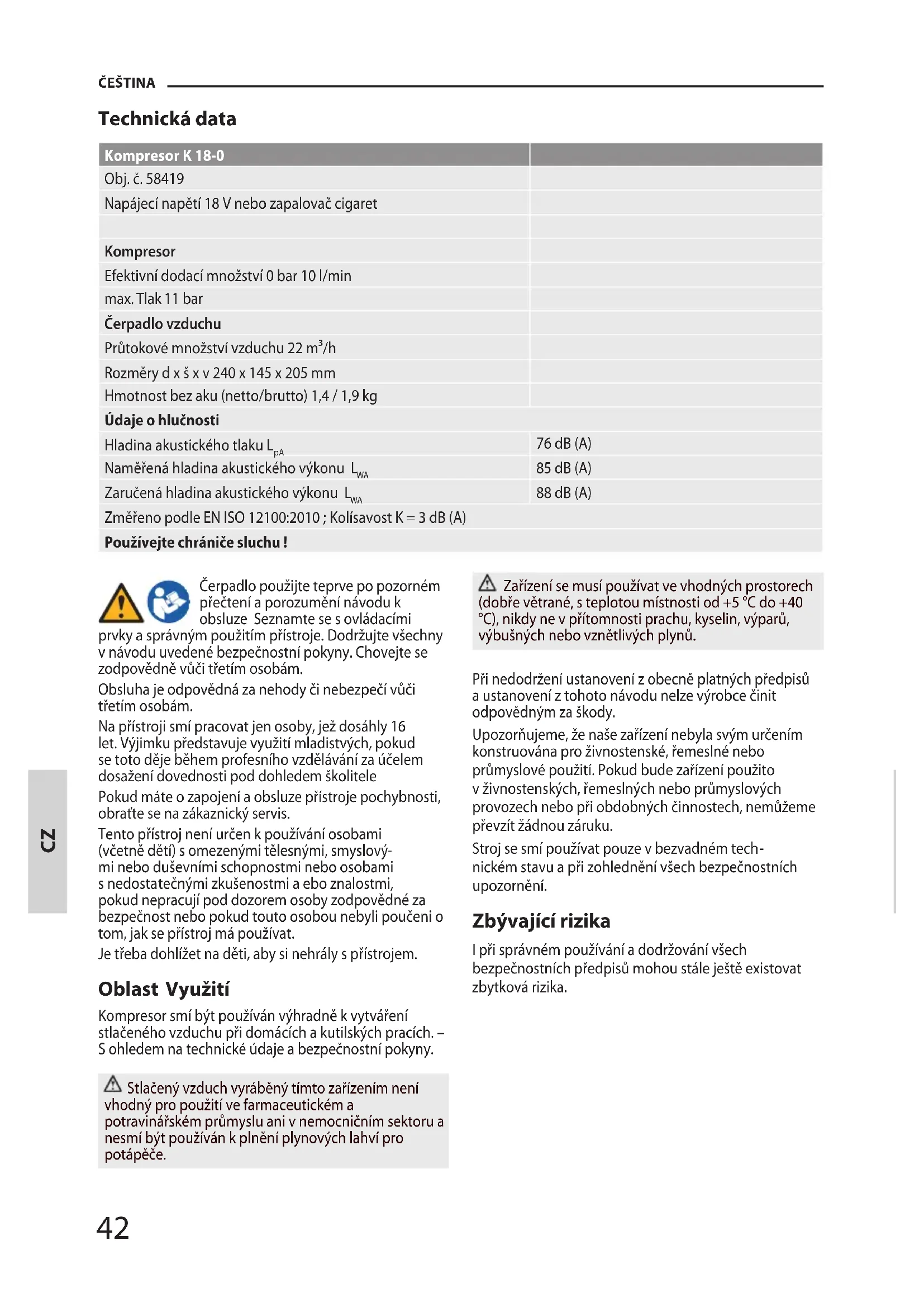 mi nebo duševními schopnostmi nebo osobami s nedosta tečnými zkušenostmi a ebo znalostmi, pokud nepracují pod dozorem osoby zodpovědné za bezpečnost nebo pokud touto osobou nebyli poučeni o tom, jak se přístroj má používat. Je třeba dohlížet na děti, aby si nehrály spřístrojem. Oblast Využití Kompresor smí být používán výhradně k vytváření stlačeného vzduchu při domácích a kutilských pracích. – S ohledem na technické údaje a bezpečnostní pokyny. Stlačený vzduch vyráběný tímto zařízením není vhodný pro použití ve farmaceutickém a potravinářském průmyslu ani v nemocničním sektoru a nesmí být používán k plnění plynových lahví pro potápěče. Zařízení se musí používat ve vhodných prostorech (dobře větrané, s teplotou místnosti od +5 °C do +40 °C), nikdy ne v přítomnosti prachu, kyselin, výparů, výbušných nebo vznětlivých plynů. Při nedodržení ustanovení z obecně platných předpisů a ustanovení z tohoto návodu nelze výrobce činit odpovědným za škody. Upozorňujeme, že naše zařízení nebyla svým určením konstruována pro živnostenské, řemeslné nebo průmyslové použití. Pokud bude zařízení použito v živnostenských, řemeslných nebo průmyslových provozech nebo při obdobných činnostech, nemůžeme převzít žádnou záruku. Stroj se smí používat pouze v bezvadném tech