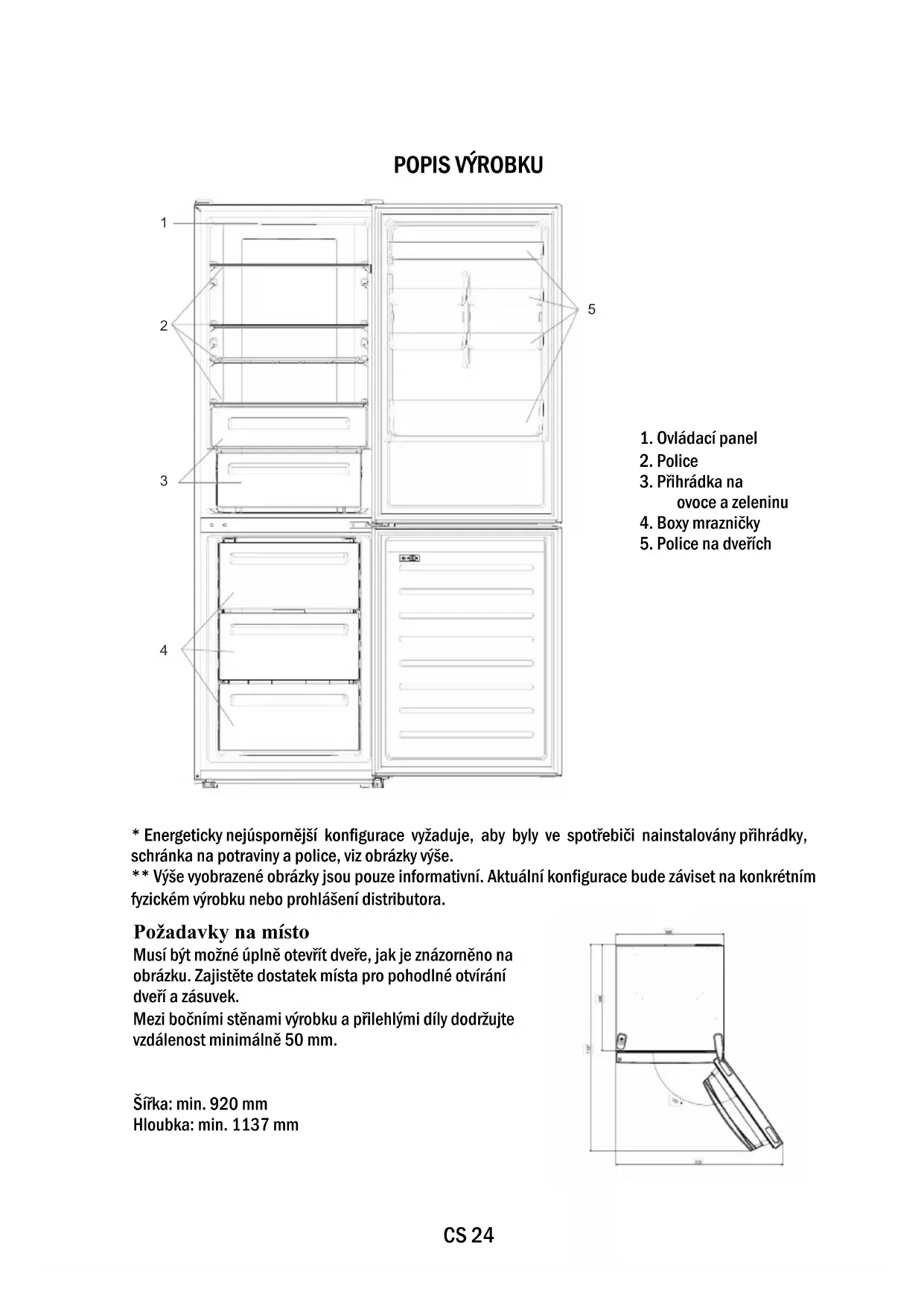 Požadavky na místo Musí být možné úplně otevřít dveře, jak je znázorněno na obrázku. Zajistěte dostatek místa pro pohodlné otvírání dveří a zásuvek. Mezi bočními stěnami výrobku a přilehlými díly dodržujte vzdálenost minimálně 50 mm. Šířka: min. 920 mm Hloubka: min. 1137 mmCS 25