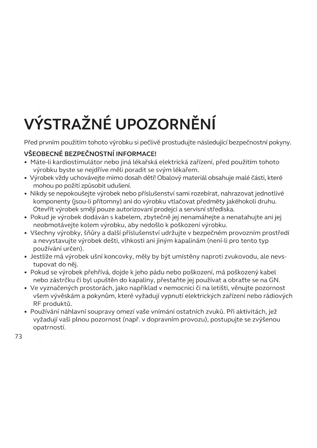 - Používání náhlavní soupravy omezí vaše vnímání ostatních zvuků. Při aktivitách, jež vyžadují vaši plnou pozornost (např. v dopravním provozu), postupujte se zvýšenou opatrností.74