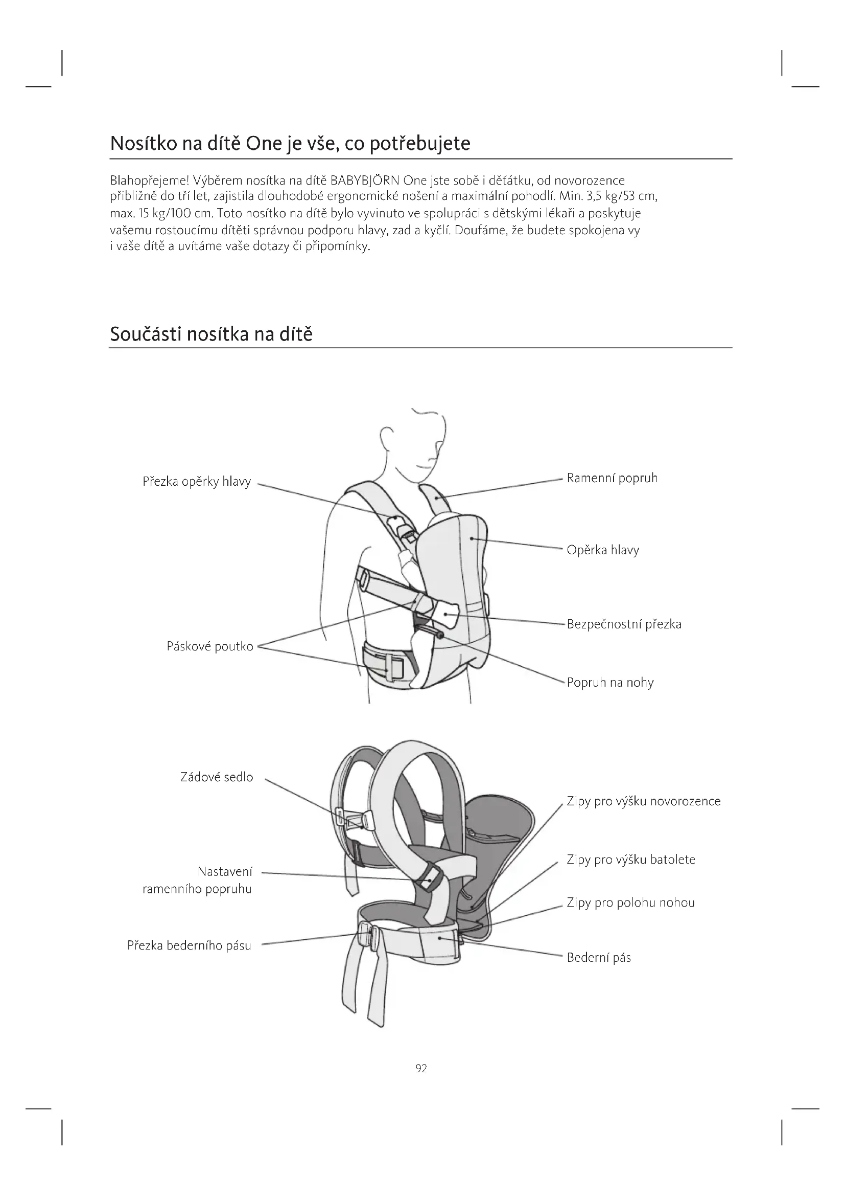 Součásti nosítka na dítě Přezka opěrky hlavy Páskové poutko Zádové sedlo Přezka bederního pásu Nastavení ramenního popruhu Ramenní popruh Opěrka hlavy Bezpečnostní přezka Popruh na nohy Zipy pro polohu nohou Bederní pás Zipy pro výšku novorozence Zipy pro výšku batolete Nosítko na dítě One je vše, co potřebujete Blahopřejeme! Výběrem nosítka na dítě BABYBJÖRN One jste sobě i děťátku, od novorozence přibližně do tří let, zajistila dlouhodobé ergonomické nošení a maximální pohodlí. Min. 3,5 kg/53 cm, max. 15 kg/100 cm. Toto nosítko na dítě bylo vyvinuto ve spolupráci s dětskými lékaři a poskytuje vašemu rostoucímu dítěti správnou podporu hlavy, zad a kyčlí. Doufáme, že budete spokojena vy i vaše dítě a uvítáme vaše dotazy či připomínky.Ny bild nr 2