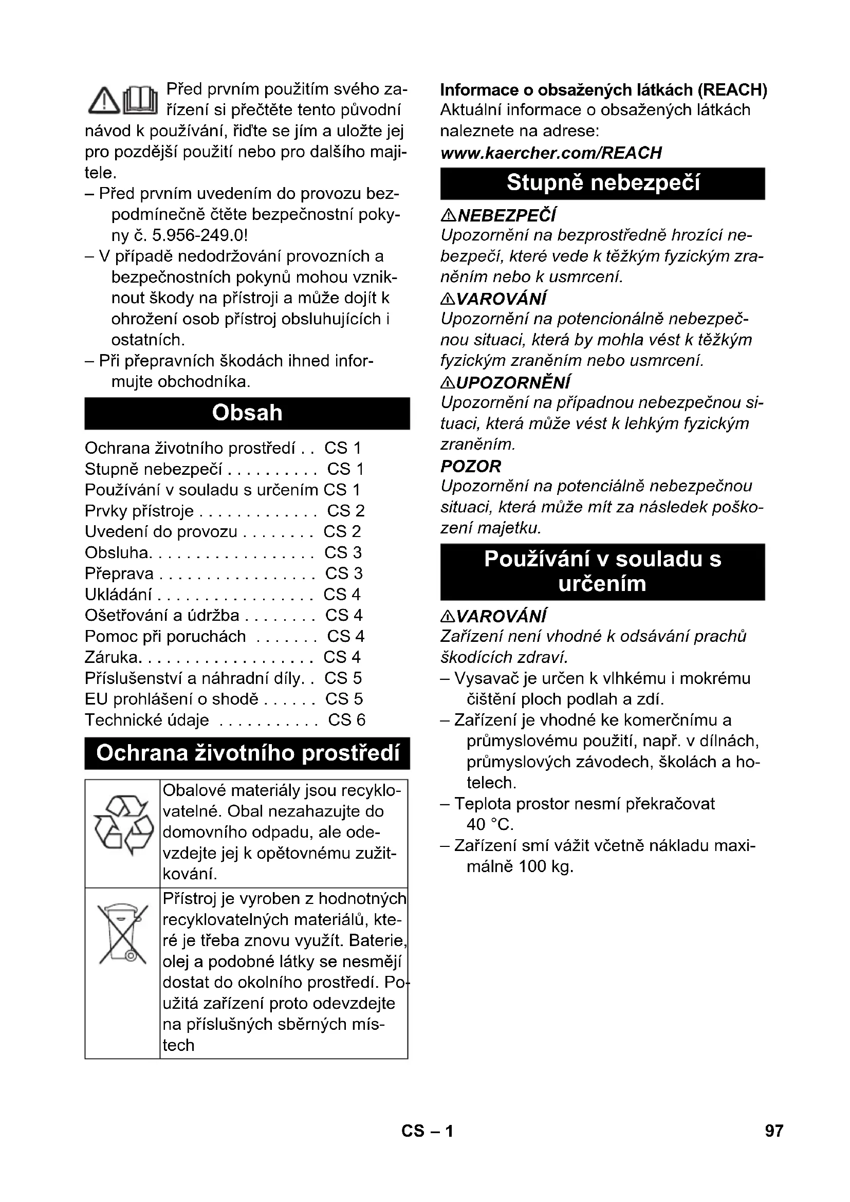 Alkatrész szám Kábelhosszú- ság EU 6.647-069.0 10 m 96 HU– 1 Před prvním použitím svého za- řízení si přečtěte tento původní návod k používání, řiďte se jím a uložte jej pro pozdější použití nebo pro dalšího maji- tele. – Před prvním uvedením do provozu bez- podmínečně čtěte bezpečnostní poky- ny č. 5.956-249.0! – V případě nedodržování provozních a bezpečnostních pokynů mohou vznik- nout škody na přístroji a může dojít k ohrožení osob přístroj obsluhujících i ostatních. – Při přepravních škodách ihned infor- mujte obchodníka. Informace o obsažených látkách (REACH) Aktuální informace o obsažených látkách naleznete na adrese: www.kaercher.com/REACH NEBEZPEČÍ Upozornění na bezprostředně hrozící ne- bezpečí, které vede k těžkým fyzickým zra- něním nebo k usmrcení. 몇 VAROVÁNÍ Upozornění na potencionálně nebezpeč- nou situaci, která by mohla vést k těžkým fyzickým zraněním nebo usmrcení. 몇 UPOZORNĚNÍ Upozornění na případnou nebezpečnou si- tuaci, která může vést k lehkým fyzickým zraněním. POZOR Upozornění na potenciálně nebezpečnou situaci, která může mít za následek poško- zení majetku. 몇 VAROVÁNÍ Zařízení není vhodné k odsávání prachů škodících zdraví. – Vysavač je určen k vlhkému i mokrému čištění ploch podlah a zdí. – Zařízení je vhodné ke komerčnímu a průmyslovému použití, např. v dílnách, průmyslových závodech, školách a ho- telech. – Teplota prostor nesmí překračovat 40 °C. – Zařízení smí vážit včetně nákladu maxi- málně 100 kg. Obsah Ochrana životního prostředí . . CS 1 Stupně nebezpečí . . . . . . . . . . CS 1 Používání v souladu s určením CS 1 Prvky přístroje . . . . . . . . . . . . . CS 2 Uvedení do provozu . . . . . . . . CS 2 Obsluha. . . . . . . . . . . . . . . . . . CS 3 Přeprava . . . . . . . . . . . . . . . . . CS 3 Ukládání . . . . . . . . . . . . . . . . . CS 4 Ošetřování a údržba . . . . . . . . CS 4 Pomoc při poruchách . . . . . . . CS 4 Záruka. . . . . . . . . . . . . . . . . . . CS 4 Příslušenství a náhradní díly. . CS 5 EU prohlášení o shodě . . . . . . CS 5 Technické údaje . . . . . . . . . . . CS 6 Ochrana životního prostředí Obalové materiály jsou recyklo- vatelné. Obal nezahazujte do domovního odpadu, ale ode- vzdejte jej k opětovnému zužit- kování. Přístroj je vyroben z hodnotných recyklovatelných materiálů, kte- ré je třeba znovu využít. Baterie, olej a podobné látky se nesmějí dostat do okolního prostředí. Po- užitá zařízení proto odevzdejte na příslušných sběrných mís- tech Stupně nebezpečí Používání v souladu s určením 97CS– 2 1 Hvězdicový šroub 2 Patronový filtr 3 Mechanická ochrana proti přeplnění 4 Vysávací hlavice 5 Sací hadice 6 Posuvné rameno 7 Kabelový hák 8 Uzamčení sací hlavy 9 Nádoba na nečistoty 10 Sací hrdlo 11 Sklopný podvozek 12 Rukojeť nádoby 13 Řídicí válec 14 Hubice na čištění podlah 15 Sací hubice 16 Držadlo 17 Násadka 18 Spínač stroje sací turbina 2 19 Spínač stroje sací turbina 1 20 Spínač stroje sací turbina 3 21 Odkládací místo pro podlahovou trysku 22 Vypouštěcí hadice 23 Držák na sací trubku 24 Držák na štěrbinovou hubici 25 Sít'ový kabel 26 typový štítek POZOR Maximální přípustná impedance sítě v bodě připojení elektřiny (viz Technická da- ta) nesmí být překročena. Nebudete-li jisti impedancí sítě ve Vašem bodě připojení, kontaktujte prosím Vašeho dodavatele elektřiny. POZOR Nebezpečí poškození! Při vysávání se ne- smí v žádném případě patronový filtr vy- jmout. – Při vysávání jemného prachu lze dále použít papírový filtrační sáček nebo membránový filtr (zvláštní příslušen- ství). ilustrace Odjistěte vysávací hlavici a sejměte ji. Nasuňte papírový filtrační sáček nebo membránový filtr (zvláštní příslušen- ství). Nasaďte vysávací hlavici a zajistěte ji. ilustrace Demontáž kartáčových pruhů. Vložte pryžové chlopně. Upozornění: Strukturovaná strana gumo- vých chlopní musí směřovat ven. – Při nasávání mokrých nečistot je třeba vždy papírový filtrační sáček nebo membránový filtr (zvláštní příslušen- ství) vyjmout. – K vysávání mokrých nečistot Vám do- poručujeme použít zvláštní filtrační sá- ček (viz filtrační systémy). POZOR Nebezpečí poškození! Při vysávání se ne- smí v žádném případě patronový filtr vy- jmout. – Po ukončení mokrého sání: Nádoby a mechanickou ochranu proti přeplnění vyčistěte vlhkým hadrem a vysušte. – Přepíná-li se zařízení na místě z mokré- ho na suché sání, je třeba nahradit mokrý patronový filtr suchým. Prvky přístroje Uvedení do provozu Přívod el. proudu Vysávání za sucha Vložení papírového filtračního sáčku (volitelné) Vysávání za mokra Vložení pryžových chlopní Vyjměte papírový filtrační sáček Mokré vysávání s patronovým filtrem 98 CS– 3 Odjistěte vysávací hlavici a sejměte ji. Odšroubujte hvězdicový šroub a sejmě- te patronový filtr. ilustrace Hvězdicový šroub pevně utáhněte. Vložte mokrý filtr. Nasaďte vysávací hlavici a zajistěte ji. POZOR Nebezpečí poškození! Při vysávání nesmí v žádném případě dojít k odstranění mok- rého filtru. – Po ukončení mokrého sání: Nádoby a mechanickou ochranu proti přeplnění vyčistěte vlhkým hadrem a vysušte. – Přepíná-li se zařízení z mokrého na su- ché vysávání, je třeba nahradit mokrý filtr patronovým filtrem. 몇 UPOZORNĚNÍ Dodržujte místní předpisy o zacházení s odpadní vodou. Přístroj s kovovým zásobníkem: ilustrace Přístroj s plastovým zásobníkem: ilustrace Špinavou vodu vyp