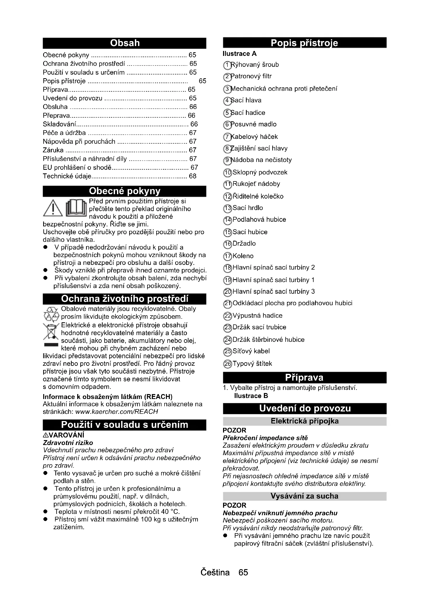 H05VV-F 2x1,5 H05VV-F 2x1,5 Alkatrészszám (EU) 6.647-069.0 6.647-069.0 Kábelhossz m 10 10Čeština 65 Obsah Obecné pokyny Před prvním použitím přístroje si přečtěte tento překlad originálního návodu k použití a přiložené bezpečnostní pokyny. Řiďte se jimi. Uschovejte obě příručky pro pozdější použití nebo pro dalšího vlastníka. V případě nedodržování návodu k použití a bezpečnostních pokynů mohou vzniknout škody na přístroji a nebezpečí pro obsluhu a další osoby. Škody vzniklé při přepravě ihned oznamte prodejci. Při vybalení zkontrolujte obsah balení, zda nechybí příslušenství a zda není obsah poškozený. Ochrana životního prostředí Obalové materiály jsou recyklovatelné. Obaly prosím likvidujte ekologickým způsobem. Elektrické a elektronické přístroje obsahují hodnotné recyklovatelné materiály a často součásti, jako baterie, akumulátory nebo olej, které mohou při chybném zacházení nebo likvidaci představovat potenciální nebezpečí pro lidské zdraví nebo pro životní prostředí. Pro řádný provoz přístroje jsou však tyto součásti nezbytné. Přístroje označené tímto symbolem se nesmí likvidovat s domovním odpadem. Informace k obsaženým látkám (REACH) Aktuální informace k obsaženým látkám naleznete na stránkách: www.kaercher.com/REACH Použití v souladu s určením 몇 VAROVÁNÍ Zdravotní riziko Vdechnutí prachu nebezpečného pro zdraví Přístroj není určen k odsávání prachu nebezpečného pro zdraví. Tento vysavač je určen pro suché a mokré čištění podlah a stěn. Tento přístroj je určen k profesionálnímu a průmyslovému použití, např. v dílnách, průmyslových podnicích, školách a hotelech. Teplota v místnosti nesmí překročit 40 °C. Přístroj smí vážit maximálně 100 kg s užitečným zatížením. Popis přístroje Ilustrace A 1 Rýhovaný šroub 2 Patronový filtr 3 Mechanická ochrana proti přetečení 4 Sací hlava 5 Sací hadice 6 Posuvné madlo 7 Kabelový háček 8 Zajištění sací hlavy 9 Nádoba na nečistoty 10 Sklopný podvozek 11 Rukojeť nádoby 12 Řiditelné kolečko 13 Sací hrdlo 14 Podlahová hubice 15 Sací hubice 16 Držadlo 17 Koleno 18 Hlavní spínač sací turbíny 2 19 Hlavní spínač sací turbíny 1 20 Hlavní spínač sací turbíny 3 21 Odkládací plocha pro podlahovou hubici 22 Výpustná hadice 23 Držák sací trubice 24 Držák štěrbinové hubice 25 Síťový kabel 26 Typový štítek Příprava