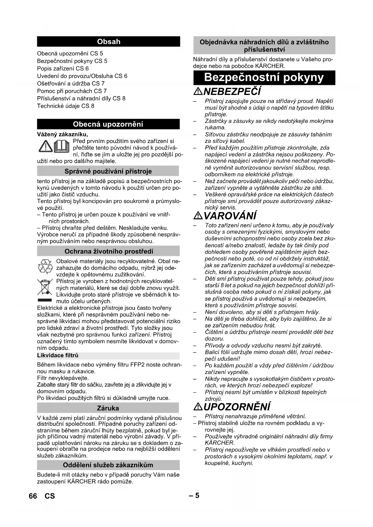 dB(A) dB(A) dB(A) 65HU– 5 Vážený zákazníku, Před prvním použitím svého zařízení si přečtěte tento původní návod k používá- ní, řiďte se jím a uložte jej pro pozdější po- užití nebo pro dalšího majitele. tento přístroj je na základě popisů a bezpečnostních po- kynů uvedených v tomto návodu k použití určen pro po- užití jako čistič vzduchu. Tento přístroj byl koncipován pro soukromé a průmyslo- vé použití. – Tento přístroj je určen pouze k používání ve vnitř- ních prostorách. – Přístroj chraňte před deštěm. Neskladujte venku. Výrobce neručí za případné škody způsobené nespráv- ným používáním nebo nesprávnou obsluhou. Obalové materiály jsou recyklovatelné. Obal ne- zahazujte do domácího odpadu, nýbrž jej ode- vzdejte k opětovnému zužitkování. Přístroj je vyroben z hodnotných recyklovatel- ných materiálů, které se dají dobře znovu využít. Likvidujte proto staré přístroje ve sběrnách k to- muto účelu určených. Elektrické a elektronické přístroje jsou často tvořeny složkami, které při nesprávném používání nebo ne- správné likvidaci mohou představovat potenciální riziko pro lidské zdraví a životní prostředí. Tyto složky jsou však nezbytné pro správnou funkci zařízení. Přístroj označený tímto symbolem nesmíte likvidovat v domov- ním odpadu. Během likvidace nebo výměny filtru FFP2 noste ochran- nou masku a rukavice. Filtr nevyklepávejte. Zabalte starý filtr do sáčku, zavřete jej a zlikvidujte jej v domovním odpadu. Po likvidaci použitých filtrů si důkladně umyjte ruce. V každé zemi platí záruční podmínky vydané příslušnou distribuční společností. Případné poruchy zařízení od- straníme během záruční lhůty bezplatně, pokud byl je- jich příčinou vadný materiál nebo výrobní závady. V pří- padě uplatňování nároku na záruku se s dokladem o za- koupení obraťte na prodejce nebo na nejbližší oddělení služeb zákazníkům. Budete-li mít otázky nebo v případě poruchy Vám naše zastoupení KÄRCHER rádo pomůže. Náhradní díly a příslušenství dostanete u Vašeho pro- dejce nebo na pobočce KÄRCHER. NEBEZPEČÍ – Přístroj zapojujte pouze na střídavý proud. Napětí musí být shodné s údaji o napětí na typovém štítku přístroje. – Zástrčky a zásuvky se nikdy nedotýkejte mokrýma rukama. – Síťovou zástrčku neodpojuje ze zásuvky taháním za síťový kabel. – Před každým použitím přístroje zkontrolujte, zda napájecí vedení a zástrčka nejsou poškozeny. Po- škozené napájecí vedení je nutné nechat neprodle- ně vyměnit autorizovanou servisní službou, resp. odborníkem na elektrické přístroje. – Než začnete provádět jakoukoliv péči nebo údržbu, zařízení vypněte a vytáhněte zástrčku ze sítě. – Veškeré opravářské práce na elektrických částech přístroje smí provádět pouze autorizovaný zákaz- nický servis. VAROVÁNÍ – Toto zařízení není určeno k tomu, aby je používaly osoby s omezenými fyzickými, smyslovými nebo duševními schopnostmi nebo osoby zcela bez zku- šeností a/nebo znalostí, ledaže by tak činily pod dohledem osoby pověřené zajištěním jejich bez- pečnosti nebo poté, co od ní obdržely instruktáž, jak se zařízením zacházet a uvědomují si nebezpe- čích, která s používáním přístroje souvisí. – Děti smí přístroj používat pouze tehdy, pokud jsou starší 8 let a pokud na jejich bezpečnost dohlíží pří- slušná osoba nebo pokud o ní získali pokyny, jak se přístroj používá a uvědomují si nebezpečím, která s používáním přístroje souvisí. – Není dovoleno, aby si děti s přístrojem hrály. – Na děti je třeba dohlížet, aby bylo zajištěno, že si se zařízením nebudou hrát. – Čištění a údržbu přístroje nesmí provádět děti bez dozoru. – Přívody a odvody vzduchu nesmí být zakryté. – Balicí fólii udržujte mimo dosah dětí, hrozí nebez- pečí udušení! – Po každém použití a vždy před čištěním / údržbou zař ízení vypněte. – Nikdy nepracujte s vysokotlakým čističem v prosto- rách, ve kterých hrozí nebezpečí exploze! – Přístroj nesmí být umístěn v blízkosti tepelných zdrojů. UPOZORNĚNÍ – Přístroj nenahrazuje přiměřené větrání. – Přístroj stabilně uložte na rovném podkladu a vy- rovnejte jej. – Používejte výhradně originální náhradní díly firmy KÄRCHER. – Přístroj nepoužívejte ve vlhkém prostředí nebo v prostorách s vysokými okolními teplotami, např. v koupelně, kuchyni. Obsah Obecná upozornění CS 5 Bezpečnostní pokyny CS 5 Popis zařízení CS 6 Uvedení do provozu/Obsluha CS 6 Ošetřování a údržba CS 7 Pomoc při poruchách CS 7 Příslušenství a náhradní díly CS 8 Technické údaje CS 8 Obecná upozornění Správné používání přístroje Ochrana životního prostředí Likvidace filtrů Záruka Oddělení služeb zákazníkům Objednávka náhradních dílů a zvláštního příslušenství Bezpečnostní pokyny 66 CS– 6 NEBEZPEČÍ Upozornění na bezprostředně hrozící nebezpečí, které vede k těžkým fyzickým zraněním nebo k usmrcení. 몇 VAROVÁNÍ Upozornění na potencionálně nebezpečnou situaci, kte- rá by mohla vést k těžkým fyzickým zraněním nebo usmrcení. 몇 UPOZORNĚNÍ Upozornění na případnou nebezpečnou situaci, která může vést k lehkým fyzickým zraněním. POZOR Upozornění na potenciálně nebezpečnou situaci, která může mít za následek poškození majetku. Při vybalení zkontrolujte obsah zásilky, zda nechybí pří- slušenství či zda dodaný přístroj není poškozen. Při škodách způsobených dopravou informujte laskavě Va- šeho obchodníka. Ilustrace najdete na rozkládací stránce! 1 Kry