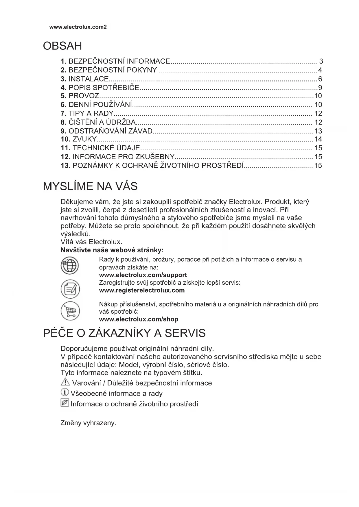 Děkujeme vám, že jste si zakoupili spotřebič značky Electrolux. Produkt, který jste si zvolili, čerpá z desetiletí profesionálních zkušeností a inovací. Při navrhování tohoto důmyslného a stylového spotřebiče jsme mysleli na vaše potřeby. Můžete se proto spolehnout, že při každém použití dosáhnete skvělých výsledků. Vítá vás Electrolux. Navštivte naše webové stránky: Rady k používání, brožury, poradce při potížích a informace o servisu a opravách získáte na: www.electrolux.com/support Zaregistrujte svůj spotřebič a získejte lepší servis: www.registerelectrolux.com Nákup příslušenství, spotřebního materiálu a originálních náhradních dílů pro váš spotřebič: www.electrolux.com/shop PÉČE O ZÁKAZNÍKY A SERVIS Doporučujeme používat originální náhradní díly. V případě kontaktování našeho autorizovaného servisního střediska mějte u sebe následující údaje: Model, výrobní číslo, sériové číslo. Tyto informace naleznete na typovém štítku. Varování / Důležité bezpečnostní informace Všeobecné informace a rady Informace o ochraně životního prostředí Zmĕny vyhrazeny. www.electrolux.com21. BEZPEČNOSTNÍ INFORMACE Tento návod si pečlivě přečtěte ještě před instalací spotřebiče a jeho prvním použitím. Výrobce nenese odpovědnost za žádný úraz ani škodu v důsledku nesprávné instalace nebo použití. Návod k použití vždy uchovávejte na bezpečném a přístupném místě pro jeho budoucí použití.