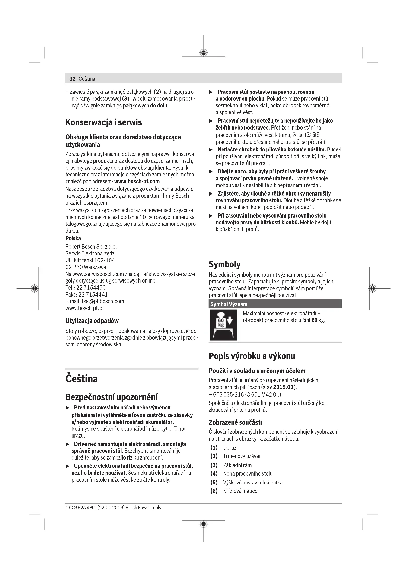 Hmotnost, cca kg 6 Montáž Obsah dodávky Před montáží pracovního stolu zkontrolujte, zda jste obdrželi všechny níže uvedené díly: – Základní rám (3) – Nohy pracovního stolu (4) (2páry, 1výškově nastavitelná noha) – Upevňovací sada (7) obsahující: šrouby svnitřním šestihranem M8 × 30 (4ks) pojistné matice M8 (4ks) Nářadí, které je zapotřebí nad rámec dodávky: – Klíč na vnitřní šestihran (5mm) – Klíč na šrouby (13mm) Montáž pracovního stolu (viz obrázky A1 − A2) – Vyjměte všechny dodané díly opatrně zobalu. – Odstraňte veškerý obalový materiál. – Otevřete třmenové uzávěry (2) aroztáhněte základní rám (3). – Zasuňte nohy pracovního stolu (4) do čtyřhranných trubek základního rámu (3) natolik, aby lícovaly montážní otvory. – Sešroubujte nohy pracovního stolu azákladní rám pomocí šroubů amatic zupevňovací sady (7). Upevnění elektronářadí (viz obrázky B1 − B2) – Pracovní stůl umístěte na pevnou, rovnou avodorovnou plochu. Výškově nastavitelná patka (5) vám pomůže pracovní stůl vyrovnat. Povolte křídlovou matici (6) apatku (5) zašroubujte nebo vyšroubujte tak, aby byl pracovní sůl vyrovnaný. Křídlovou matici znovu utáhněte. – Elektronářadí na základním rámu vycentrujte. Ktomu slouží dorazy (1). – Zahákněte třmeny obou třmenových uzávěrů (2) za rám krytu (8) apro upevnění elektronářadí sklopte páčky třmenových uzávěrů dolů. Provoz Pracovní pokyny Pracovní stůl nepřetěžujte. Vždy dbejte na maximální nosnost pracovního stolu. Obrobek držte vždy dobře apevně, zvláště dlouhé, těžké odřezky. Po proříznutí obrobku se může těžiště tak nevýhodně přemístit, že se pracovní stůl převrhne. Přeprava (viz obrázky C1 − C3) u Při skládání nebo rozkládání pracovního stolu nesmí být na pracovním stole elektronářadí. Pro přepravu můžete pracovní stůl složit. – Otevřete třmenové uzávěry (2) asejměte elektronářadí. – Složte pracovní stůl. – Zahákněte třmeny třmenových uzávěrů (2) za druhou stranu základního rámu (3) apro upevnění stiskněte páčku třmenových uzávěrů dolů. Údržba aservis Zákaznická služba aporadenství ohledně použití Zákaznická služba zodpoví vaše dotazy kopravě aúdržbě vašeho výrobku atéž knáhradním dílům. Rozkladové výkresy ainformace onáhradních dílech najdete také na: www.bosch-pt.com Vpřípadě dotazů knašim výrobkům apříslušenství vám ochotně pomůže poradenský tým Bosch. Vpřípadě veškerých otázek aobjednávek náhradních dílů bezpodmínečně uveďte 10místné věcné číslo podle typového štítku výrobku. Czech Republic Robert Bosch odbytová s.r.o. Bosch Service Center PT K Vápence 1621/16 692 01 Mikulov Na www.bosch-pt.cz si si můžete objednat opravu Vašeho stroje nebo náhradní díly online. Tel.: +420 519 305700 Fax: +420 519 305705 E-Mail: servis.naradi@cz.bosch.com www.bosch.cz Likvidace Pracovní stoly, příslušenství aobaly odevzdejte kekologické recyklaci. Slovenčina Bezpečnostné pokyny Bosch Power Tools 1 609 92A 4PC | (22.01.2019)34 | Slovenčina u Pred vykonávaním nastavení na náradí alebo výmenou príslušenstva vytiahnite zástrčku zo zásuvky a/alebo vyberte akumulátor zelektrického náradia. Neúmysel- né spustenie elektrického náradia býva zdrojom viacerých druhov úrazov. u Prv než namontujete elektrické náradie, zostavte správne pracovný stôl. Bezchybné zmontovanie je dô- ležité preto, aby sa zabránilo nebezpečenstvu zrútenia. u Pred použitím elektrické náradie bezpečne upevnite na pracovný stôl. Zošmyknutie elektrického náradia na pracovnom stole môže zapríčiniť stratu kontroly nad nára- dím. u Pracovný stôl postavte na pevnú, rovnú avodorovnú plochu. Keby sa pracovný stôl šmýkal alebo kýval, ob- robok by sa nedal rovnomerne aspoľahlivo viesť. u Nepreťažte pracovný stôl anepoužívajte ho ako rebrík alebo lešenie. Preťaženie pracovného stola alebo po- stavenie sa naň môže spôsobiť to, že sa ťažisko pracovné- ho stola presunie smerom hore astôl sa prevráti. u Obrobok nevrážajte silou do pílového kotúča. Keby ste používali pri práci stýmto elektrickým náradím príliš veľa sily, pracovný stôl by sa mohol prevrhnúť. u Dbajte na to, aby boli pri práci všetky skrutky aspája- cie prvky pevne utiahnuté. Uvoľnené spoje môžu mať za následok nestabilitu aviesť knepresným výsledkom reza- nia. u Zabezpečte, aby dlhé aťažké obrobky nevyviedli pracovný stôl zrovnováhy. Dlhé aťažké obrobky musia byť na voľnom konci podložené alebo podopreté. u Keď pracovný stôl prisúvate ksebe alebo od seba, nedávajte prsty do blízkosti kĺbov. Mohli by vám po- mliaždiť prsty. Symboly Nasledujúce symboly môžu byť pre používanie vášho pracov- ného stola dôležité. Zapamätajte si tieto symboly aich vý- znamy. Správna interpretácia týchto symbolov vám bude po- máhať používať tento pracovný stôl lepšie abezpečnejšie. Symbol Význam Maximálna nosnosť (elektrické náradie + ob- robok) pracovného stola je 60 kg. Opis výrobku avýkonu Používanie vsúlade surčením Pracovný stôl je určený na to, aby sa naň namontovali na- sledujúce stacionárne píly Bosch (stav 2019.01): – GTS635-216 (3601M420..) Spolu spríslušným ručným elektrickým náradím je tento pracovný stôl určený na skracovanie dosák aprofilového materiálu. Vyobrazené komponenty Číslovanie vyobrazených komponentov sa vzťahuje na vyob- razenia na grafických stranách na začiatku návodu. (1) Doraz (2) Strmienkový uzáver (3) Základný rám (4) Noha pracovného stola (5) Výškovo nastaviteľná pätka (6) Krídlová matica (7) Upevňovacia súprava (8) Rám telesa elektrického náradia Technické údaje Praco