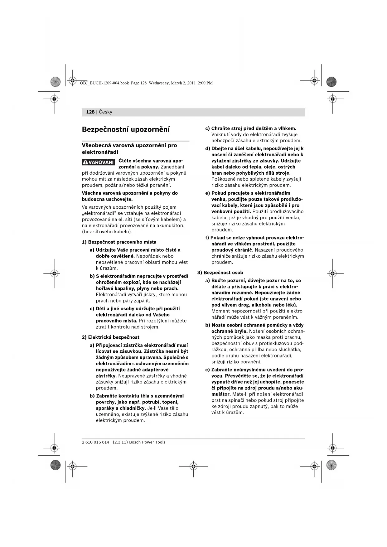 a) Buďte pozorní, dávejte pozor na to, co děláte a přistupujte k práci s elektro- nářadím rozumně. Nepoužívejte žádné elektronářadí pokud jste unaveni nebo pod vlivem drog, alkoholu nebo léků. Moment nepozornosti při použití elektro- nářadí může vést k vážným poraněním. b) Noste osobní ochranné pomůcky a vždy ochranné brýle. Nošení osobních ochran- ných pomůcek jako maska proti prachu, bezpečnostní obuv s protiskluzovou pod- rážkou, ochranná přilba nebo sluchátka, podle druhu nasazení elektronářadí, snižují riziko poranění. c) Zabraňte neúmyslnému uvedení do pro- vozu. Přesvědčte se, že je elektronářadí vypnuté dříve než jej uchopíte, ponesete či připojíte na zdroj proudu a/nebo aku- mulátor. Máte-li při nošení elektronářadí prst na spínači nebo pokud stroj připojíte ke zdroji proudu zapnutý, pak to může vést k úrazům. VAROVÁNÍ OBJ_BUCH-1209-004.book Page 128 Wednesday, March 2, 2011 2:00 PMČesky | 129 Bosch Power Tools 2 610 016 614 | (2.3.11) d) Než elektronářadí zapnete, odstraňte seřizovací nástroje nebo šroubováky. Nástroj nebo klíč, který se nachází v otá- čivém dílu stroje, může vést k poranění. e) Vyvarujte se abnormálního držení těla. Zajistěte si bezpečný postoj a udržujte vždy rovnováhu. Tím můžete elektro- nářadí v neočekávaných situacích lépe kontrolovat. f) Noste vhodný oděv. Nenoste žádný volný oděv nebo šperky. Vlasy, oděv a rukavice udržujte daleko od pohybují- cích se dílů. Volný oděv, šperky nebo dlouhé vlasy mohou být zachyceny pohy- bujícími se díly. g) Lze-li namontovat odsávací či zachycující přípravky, přesvědčte se, že jsou připo- jeny a správně použity. Použití odsávání prachu může snížit ohrožení prachem.