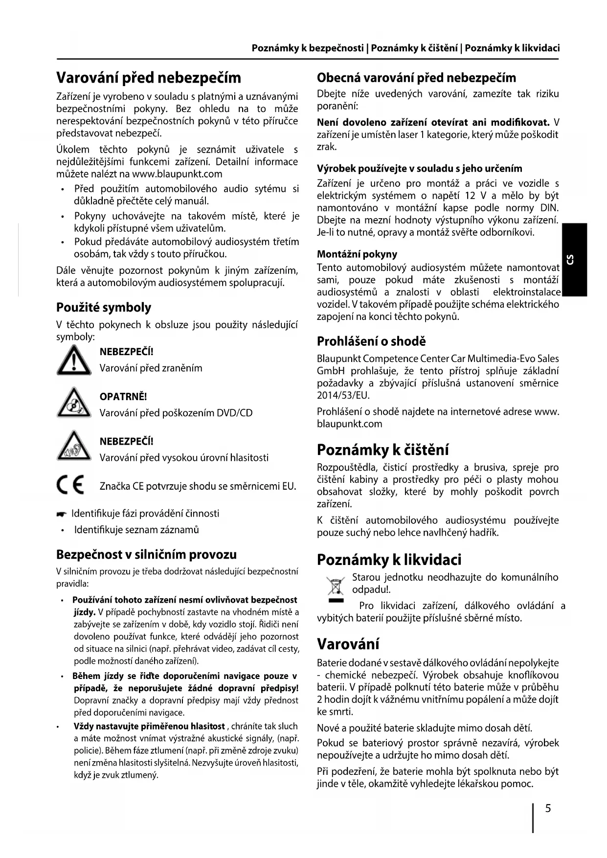 - Vnější monitor Poznámky k bezpečnosti | Poznámky k čištění | Poznámky k likvidaci Varování před nebezpečím Zařízení je vyrobeno v souladu s platnými a uznávanými bezpečnostními pokyny. Bez ohledu na to může nerespektování bezpečnostních pokynů v této příručce představovat nebezpečí. Úkolem těchto pokynů je seznámit uživatele s nejdůležitějšími funkcemi zařízení. Detailní informace můžete nalézt na www.blaupunkt.com p. 155