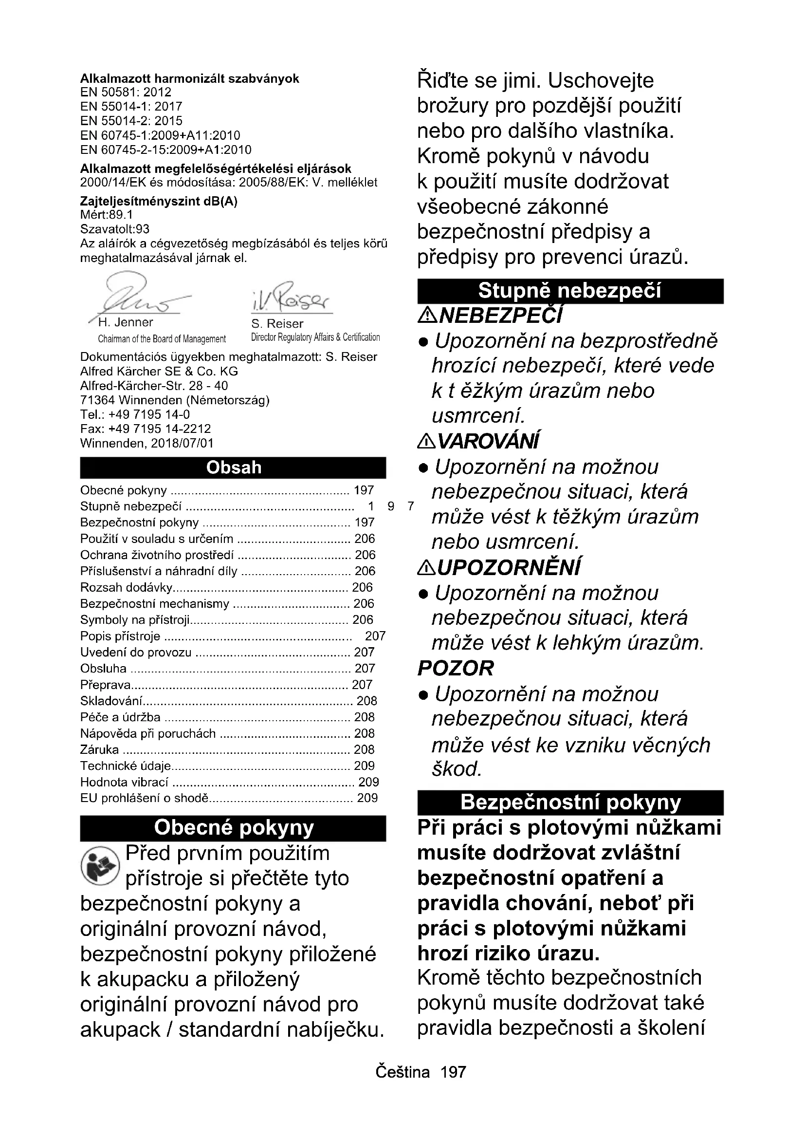 - 1,5 Méretek és súlyok Vágási hossz mm 600 Tömeg (akkuegység nélkül) kg 3,45Čeština 197 Alkalmazott harmonizált szabványok EN 50581: 2012 EN 55014-1: 2017 EN 55014-2: 2015 EN 60745-1:2009+A11:2010 EN 60745-2-15:2009+A1:2010 Alkalmazott megfelelőségértékelési eljárások 2000/14/EK és módosítása: 2005/88/EK: V. melléklet Zajteljesítményszint dB(A) Mért:89.1 Szavatolt:93 Az aláírók a cégvezetőség megbízásából és teljes körű meghatalmazásával járnak el. Dokumentációs ügyekben meghatalmazott: S. Reiser Alfred Kärcher SE & Co. KG Alfred-Kärcher-Str. 28 - 40 71364 Winnenden (Németország) Tel.: +49 7195 14-0 Fax: +49 7195 14-2212 Winnenden, 2018/07/01 Obsah Obecné pokyny Před prvním použitím přístroje si přečtěte tyto bezpečnostní pokyny a originální provozní návod, bezpečnostní pokyny přiložené k akupacku a přiložený originální provozní návod pro akupack / standardní nabíječku. Řiďte se jimi. Uschovejte brožury pro pozdější použití nebo pro dalšího vlastníka. Kromě pokynů v návodu k použití musíte dodržovat všeobecné zákonné bezpečnostní předpisy a předpisy pro prevenci úrazů. Stupně nebezpečí NEBEZPEČÍ ● Upozornění na bezprostředně hrozící nebezpečí, které vede ktěžkým úrazům nebo usmrcení. 몇 VAROVÁNÍ ● Upozornění na možnou nebezpečnou situaci, která může vést k těžkým úrazům nebo usmrcení. 몇 UPOZORNĚNÍ ● Upozornění na možnou nebezpečnou situaci, která může vést k lehkým úrazům. POZOR ● Upozornění na možnou nebezpečnou situaci, která může vést ke vzniku věcných škod. Bezpečnostní pokyny Při práci s plotovými nůžkami musíte dodržovat zvláštní bezpečnostní opatření a pravidla chování, neboť při práci s plotovými nůžkami hrozí riziko úrazu. Kromě těchto bezpečnostních pokynů musíte dodržovat také pravidla bezpečnosti a školení Obecné pokyny p. 197