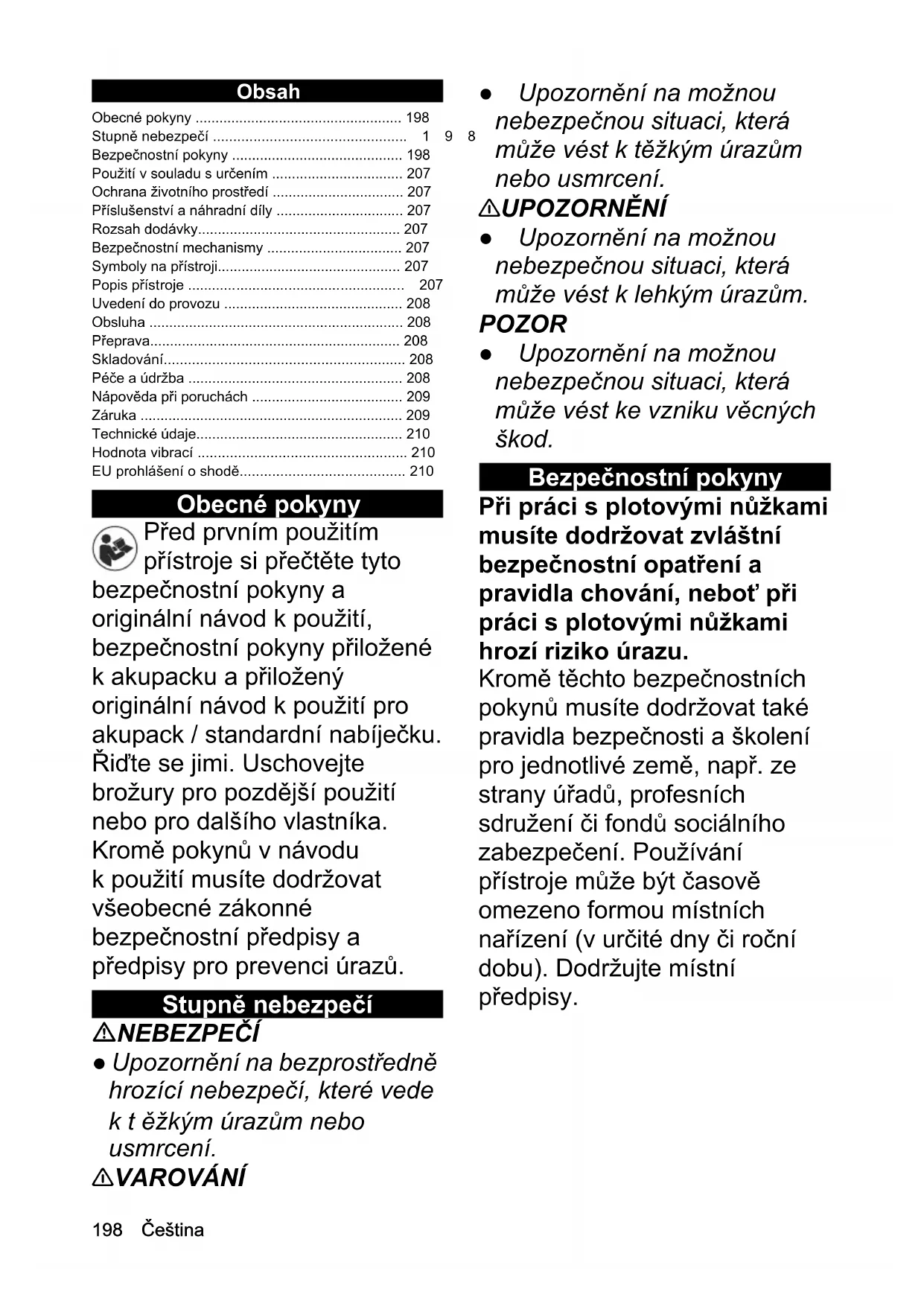 - A vágókés hossza mm 500 Tömeg (akkuegység nélkül) kg 2,7 Chairman of the Board of ManagementDirector Regulatory Affairs & Certification H. Jenner S. Reiser198 Čeština Obsah Obecné pokyny Před prvním použitím přístroje si přečtěte tyto bezpečnostní pokyny a originální návod k použití, bezpečnostní pokyny přiložené k akupacku a přiložený originální návod k použití pro akupack / standardní nabíječku. Řiďte se jimi. Uschovejte brožury pro pozdější použití nebo pro dalšího vlastníka. Kromě pokynů v návodu k použití musíte dodržovat všeobecné zákonné bezpečnostní předpisy a předpisy pro prevenci úrazů. Stupně nebezpečí NEBEZPEČÍ ● Upozornění na bezprostředně hrozící nebezpečí, které vede ktěžkým úrazům nebo usmrcení. 몇 VAROVÁNÍ ● Upozornění na možnou nebezpečnou situaci, která může vést k těžkým úrazům nebo usmrcení. 몇 UPOZORNĚNÍ ● Upozornění na možnou nebezpečnou situaci, která může vést k lehkým úrazům. POZOR ● Upozornění na možnou nebezpečnou situaci, která může vést ke vzniku věcných škod. Bezpečnostní pokyny Při práci s plotovými nůžkami musíte dodržovat zvláštní bezpečnostní opatření a pravidla chování, neboť při práci s plotovými nůžkami hrozí riziko úrazu. Kromě těchto bezpečnostních pokynů musíte dodržovat také pravidla bezpečnosti a školení pro jednotlivé země, např. ze strany úřadů, profesních sdružení či fondů sociálního zabezpečení. Používání přístroje může být časově omezeno formou místních nařízení (v určité dny či roční dobu). Dodržujte místní předpisy. Obecné pokyny p. 198