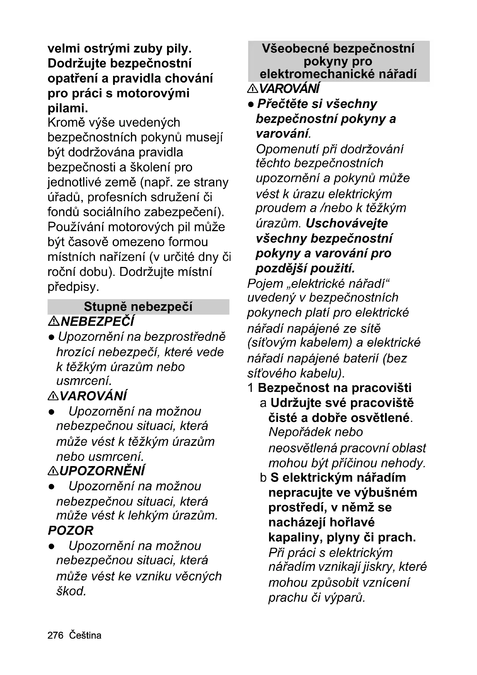 - EU prohlášení o shodě 76 Čeština velmi ostrými zuby pily. Dodržujte bezpečnostní opatření a pravidla chování pro práci s motorovými pilami. Kromě výše uvedených bezpečnostních pokynů musejí být dodržována pravidla bezpečnosti a školení pro jednotlivé země (např. ze strany úřadů, profesních sdružení či fondů sociálního zabezpečení). Používání motorových pil může být časově omezeno formou místních nařízení (v určité dny či roční dobu). Dodržujte místní předpisy. Stupně nebezpečí NEBEZPEČÍ ● Upozornění na bezprostředně hrozící nebezpečí, které vede k těžkým úrazům nebo usmrcení. 몇 VAROVÁNÍ ● Upozornění na možnou nebezpečnou situaci, která může vést k těžkým úrazům nebo usmrcení. 몇 UPOZORNĚNÍ ● Upozornění na možnou nebezpečnou situaci, která může vést k lehkým úrazům. POZOR ● Upozornění na možnou nebezpečnou situaci, která může vést ke vzniku věcných škod. Všeobecné bezpečnostní pokyny pro elektromechanické nářadí 몇 VAROVÁNÍ ● Přečtěte si všechny bezpečnostní pokyny a varování. Opomenutí při dodržování těchto bezpečnostních upozornění a pokynů může vést k úrazu elektrickým proudem a /nebo k těžkým úrazům. Uschovávejte všechny bezpečnostní pokyny a varování pro pozdější použití. Pojem „elektrické nářadí“ uvedený v bezpečnostních pokynech platí pro elektrické nářadí napájené ze sítě (síťovým kabelem) a elektrické nářadí napájené baterií (bez síťového kabelu). 1 Bezpečnost na pracovišti a Udržujte své pracoviště čisté a dobře osvětlené. Nepořádek nebo neosvětlená pracovní oblast mohou být příčinou nehody. b S elektrickým nářadím nepracujte ve výbušném prostředí, v němž se nacházejí hořlavé kapaliny, plyny či prach. Při práci s elektrickým nářadím vznikají jiskry, které mohou způsobit vznícení prachu či výparů.Čeština 277 c Udržujte děti a ostatní osoby při používání elektrického nářadí mimo vymezenou pracovní oblast. Vlivem nepozornosti může dojít ke ztrátě kontroly nad používaným přístrojem. 2 Elektrická bezpečnost a Připojovací zástrčka elektrického nářadí musí odpovídat velikosti zásuvky. Zástrčku nijak neupravujte. U elektrického nářadí s ochranným uzemněním nepoužívejte žádné upravené zástrčky. Tím, že používáte neupravené zástrčky a příslušné zásuvky, se snižuje riziko úrazu elektrickým proudem. b Zabraňte tělesnému kontaktu s uzemněnými povrchy, jako jsou potrubí, topení, sporáky a ledničky. Existuje zvýšené riziko úrazu elektrickým proudem, pokud je vaše tělo uzemněno. c Chraňte elektrické nářadí před deštěm nebo mokrem. Vniknutí vody do elektrického nářadí zvyšuje riziko úrazu elektrickým proudem. d Nepoužívejte kabel k nošení elektrického nářadí, jeho zavěšení nebo vytahování zástrčky ze zásuvky. Udržujte kabel v dostatečně vzdálenosti od zdrojů horka, oleje, ostrých hran nebo od pohybujících se částí přístroje. Poškozené nebo zamotané připojovací kabely zvyšují riziko úrazu elektrickým proudem. e Pokud pracujete s elektrickým nářadím venku, používejte pouze prodlužovací kabel určený i do venkovních prostor. Použití prodlužovacího kabelu určeného do venkovních prostor snižuje riziko úrazu elektrickým proudem. f Pokud je práce s elektrickým nářadím ve vlhkém prostředí nevyhnutelná, používejte proudový chránič. Použití proudového chrániče zmenšuje riziko úrazu elektrickým proudem. 3 Bezpečnost osob a Buďte opatrní, dávejte pozor při tom, co děláte, a při práci s elektrickým nářadím používejte zdravý rozum. Nepoužívejte elektrické nářadí, jste-li unavení či pod vlivem omamných látek, alkoholu nebo léků. Jediný okamžik nepozornosti při používání elektrického nářadí může278 Čeština vést k utrpění vážného zranění. b Používejte osobní ochranné pracovní prostředky a vždy ochranné brýle. Používání osobních ochranných pracovních prostředků, např. prachové masky, protiskluzové obuvi, ochranné přilby či ochrany sluchu, vždy v závislosti na druhu a použití elektrického nářadí, snižuje riziko zranění. c Zabraňte náhodnému uvedení do provozu. Než jej zapojíte do elektrického napájení anebo baterie, budete zvedat či přenášet, ujistěte se, že je elektrické nářadí vypnuto. Pokud máte u elektrického nářadí při jeho přenášení prst na spínači či máte přístroj zapnut v elektrickém napájení, můžete tím způsobit úrazy. d Než elektrické nářadí zapnete, dejte pryč seřizovací nářadí nebo klíč. Nářadí či klíč, které se nacházejí v rotující části přístroje, může způsobit zranění. e Vyvarujte se abnormálnímu držení těla. Zaujměte bezpečný postoj a udržujte vždy rovnováhu. Díky tomu budete schopni elektrické nářadí lépe zvládnout v neočekávaných situacích. f Používejte vhodné oblečení. Nenoste volné oblečení nebo šperky. Udržujte vlasy, oblečení a rukavice pryč od pohybujících se dílů. Volné oblečení, rukavice, šperky nebo dlouhé vlasy mohou být zachyceny pohybujícími se díly. g V případě, že lze připojit zařízení na odsávání a zachycování prachu, ujistěte se, že jsou tato zařízení připojena a správně používána. Použití odsávání prachu může snížit ohrožení prachem. 4 Použití elektrického nářadí a zacházení s ním a Nepřetěžujte přístroj. Používejte ke své práci pouze k tomu určené elektrické nářadí. S odpovídajícím elektrickým nářadím se vám bude v dané oblasti výkonu pracovat lépe a bezpečněji. b Nepoužívejte elektrické nářadí, které má závadu na spínači. Elektrické ná