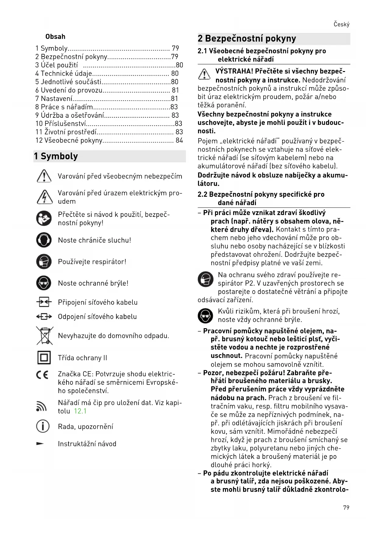- 12 Všeobecné pokyny 1 Symboly Varování před všeobecným nebezpečím Varování před úrazem elektrickým pro udem Přečtěte si návod k použití, bezpeč nostní pokyny! Noste chrániče sluchu! Používejte respirátor! Noste ochranné brýle! Připojení síťového kabelu Odpojení síťového kabelu Nevyhazujte do domovního odpadu. Třída ochrany II Značka CE: Potvrzuje shodu elektric kého nářadí se směrnicemi Evropské ho společenství. Nářadí má čip pro uložení dat. Viz kapi tolu 12.1 Rada, upozornění Instruktážní návod 2 Bezpečnostní pokyny p. 84