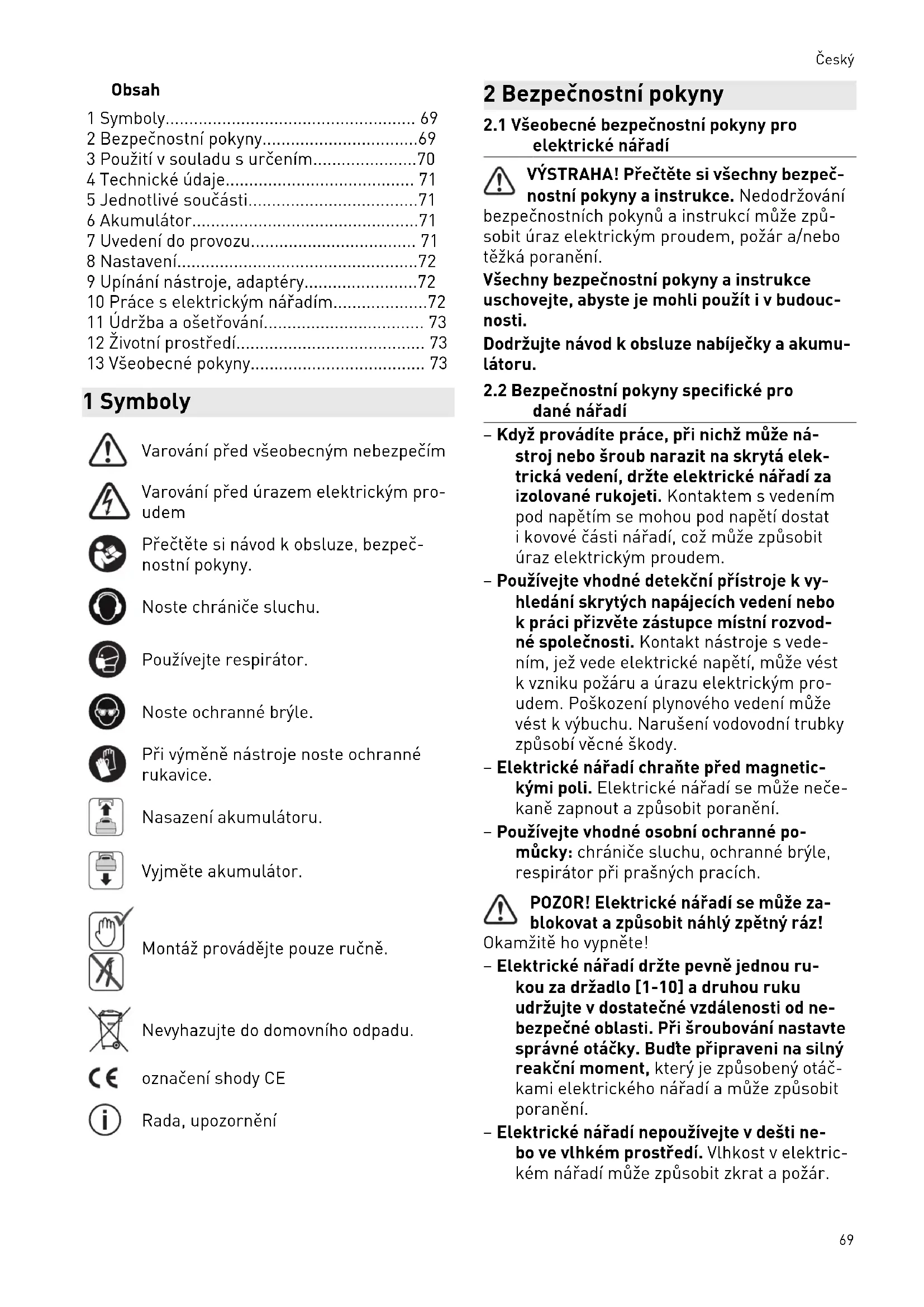 - 13 Všeobecné pokyny 1 Symboly Varování před všeobecným nebezpečím Varování před úrazem elektrickým pro udem Přečtěte si návod kobsluze, bezpeč nostní pokyny. Noste chrániče sluchu. Používejte respirátor. Noste ochranné brýle. Při výměně nástroje noste ochranné rukavice. Nasazení akumulátoru. Vyjměte akumulátor. Montáž provádějte pouze ručně. Nevyhazujte do domovního odpadu. označení shody CE Rada, upozornění 2 Bezpečnostní pokyny p. 73