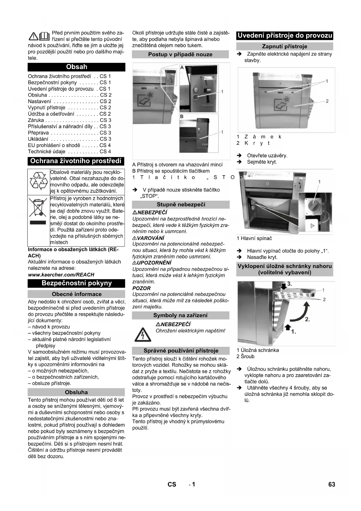 dB(A) 63 Méretek Hossz mm 1092 szélesség mm 531 magasság mm 1094 Tömeg kg 70 62 HU- 1 Před prvním použitím svého za- řízení si přečtěte tento původní návod k používání, řiďte se jím a uložte jej pro pozdější použití nebo pro dalšího maji- tele. Informace o obsažených látkách (RE- ACH) Aktuální informace o obsažených látkách naleznete na adrese: www.kaercher.com/REACH Aby nedošlo k ohrožení osob, zvířat a věcí, bezpodmínečně si před uvedením přístroje do provozu přečtěte a respektujte následu- jící dokumenty: – návod k provozu – všechny bezpečnostní pokyny – aktuálně platné národní legislativní předpisy V samoobslužném režimu musí provozova- tel zajistit, aby byli uživatelé viditelnými štít- ky s upozorněními informováni na – o možných nebezpečích, – o bezpečnostních zařízeních, – obsluze přístroje. Tento přístroj mohou používat děti od 8 let a osoby se sníženými tělesnými, vjemový- mi a duševními schopnostmi nebo osoby s nedostatečnými zkušenostmi nebo zna- lostmi, pokud přístroj používají s dohledem nebo pokud byly seznámeny s bezpečným používáním přístroje a s ním spojenými ne- bezpečími. Děti si s přístrojem nesmí hrát. Čištění a údržbu přístroje nesmí provádět děti bez dozoru. Okolí přístroje udržujte stále čisté a zajistě- te, aby podlaha nebyla špinavá a/nebo znečištěná olejem nebo tukem. A Přístroj s otvorem na vhazování mincí B Přístroj se spouštěcím tlačítkem 1Tlačítko „STOP“ V případě nouze stiskněte tlačítko „STOP“. NEBEZPEČÍ Upozornění na bezprostředně hrozící ne- bezpečí, které vede k těžkým fyzickým zra- něním nebo k usmrcení. 몇 VAROVÁNÍ Upozornění na potencionálně nebezpeč- nou situaci, která by mohla vést k těžkým fyzickým zraněním nebo usmrcení. 몇 UPOZORNĚNÍ Upozornění na případnou nebezpečnou si- tuaci, která může vést k lehkým fyzickým zraněním. POZOR Upozornění na potenciálně nebezpečnou situaci, která může mít za následek poško- zení majetku. Tento přístroj slouží k čištění rohožek mo- torových vozidel. Rohožky se mohou sklá- dat z pryže a textilu. Nečistota se z rohožky odstraňuje pomocí rotujícího kartáčového válce a shromažďuje se v nádobě na nečis- toty. Provoz v prostředí s nebezpečím výbuchu je zakázáno. Při provozu musí být zavřená všechna dvíř- ka a připevněné všechny kryty. Tento přístroj je vhodný k průmyslovému použití. Zapněte elektrické napájení ze strany stavby. 1Zámek 2Kryt Otevřete uzávěry. Sejměte kryt. 1 Hlavní spínač Hlavní vypínač otočte do polohy „1“. Nasaďte kryt. 1 Úložná schránka 2 Šroub Úložnou schránku potáhněte nahoru, vyklopte nahoru a pro zaaretování za- tlačte dolů. Utáhněte všechny 4 šrouby, aby se úložná schránka již nemohla sklopit do- lů. Obsah Ochrana životního prostředí . . CS 1 Bezpečnostní pokyny . . . . . . . CS 1 Uvedení přístroje do provozu . CS 1 Obsluha . . . . . . . . . . . . . . . . . . CS 2 Nastavení . . . . . . . . . . . . . . . . CS 2 Vypnutí přístroje . . . . . . . . . . . CS 2 Údržba a ošetřování . . . . . . . . CS 2 Záruka . . . . . . . . . . . . . . . . . . . CS 3 Příslušenství a náhradní díly . . CS 3 Přeprava . . . . . . . . . . . . . . . . . CS 3 Ukládání . . . . . . . . . . . . . . . . . CS 3 EU prohlášení o shodě . . . . . . CS 4 Technické údaje . . . . . . . . . . . CS 4 Ochrana životního prostředí Obalové materiály jsou recyklo- vatelné. Obal nezahazujte do do- movního odpadu, ale odevzdejte jej k opětovnému zužitkování. Přístroj je vyroben z hodnotných recyklovatelných materiálů, které se dají dobře znovu využít. Bate- rie, olej a podobné látky se ne- smějí dostat do okolního prostře- dí. Použitá zařízení proto ode- vzdejte na příslušných sběrných místech Bezpečnostní pokyny Obecné informace Obsluha Postup v případě nouze Stupně nebezpečí Symboly na zařízení NEBEZPEČÍ Ohrožení elektrickým napětím! Správné používání přístroje Uvedení přístroje do provozu Zapnutí přístroje Vyklopení úložné schránky nahoru (volitelné vybavení) 63CS- 2 A Přístroj s otvorem na vhazování mincí B Přístroj se spouštěcím tlačítkem 1 Vhazování mincí 2 Světelná kontrolka 3Navrácení mince 4 Spouštěcí tlačítko 5 Vstup rohožky 6 Výstup rohožky Upozornění: Jestliže rohožku pustíte, projde přístrojem a bude vysunuta na výstupu rohožky. Upozornění: Nastavitelná doba chodu platí pro vhození jedné z následujících mincí: – 50 eurocentů – 50 britských pencí – 1 švýcarský frank – 1 polský zlotý – 5 norských korun Sejměte víko (viz „Údržba a ošetřování/ Údržbové práce/Sejmutí víka“). 1Tlačítko„PRG“ 2LED 3 3LED 1 4 Tlačítko „P1“ 5 Řízení Stiskněte tlačítko „PRG“ a přidržte do- kud se nerozsvítí LED 3. Je aktivován provozní režim Seřizová- ní. Upozornění: Provozní režim Seřizování se ukončí, když 10 sekund není stisknuto žádné tlačítko. Nastavení začíná dobou chodu 0 sekund. Maximální doba chodu je 10 minut. Jestliže se dosáhne tohoto nastavení, bliká LED 1 rychle. Krátce stiskněte tlačítko „P1“. LED 1 bliká rychle a doba chodu se zvýší o 5 sekund. Dlouze stiskněte tlačítko „P1“. LED 1 bliká pomalu a doba chodu se zvýší o 30 sekund. Požadovanou dobu chodu nastavte opakovaným stisknutím tlačítka „P1“. Pro potvrzení nastavené doby chodu stiskněte tlačítko „PRG“, dokud neza- čne LED 3 rychle blikat: Doba chodu se uloží. Hlavní vypínač nastavte na „0“. NEBEZPEČÍ Nebezpečí úrazu následkem neúmyslného rozběhu přístroje a zasažením elektrickým proudem. Před zahájením všech