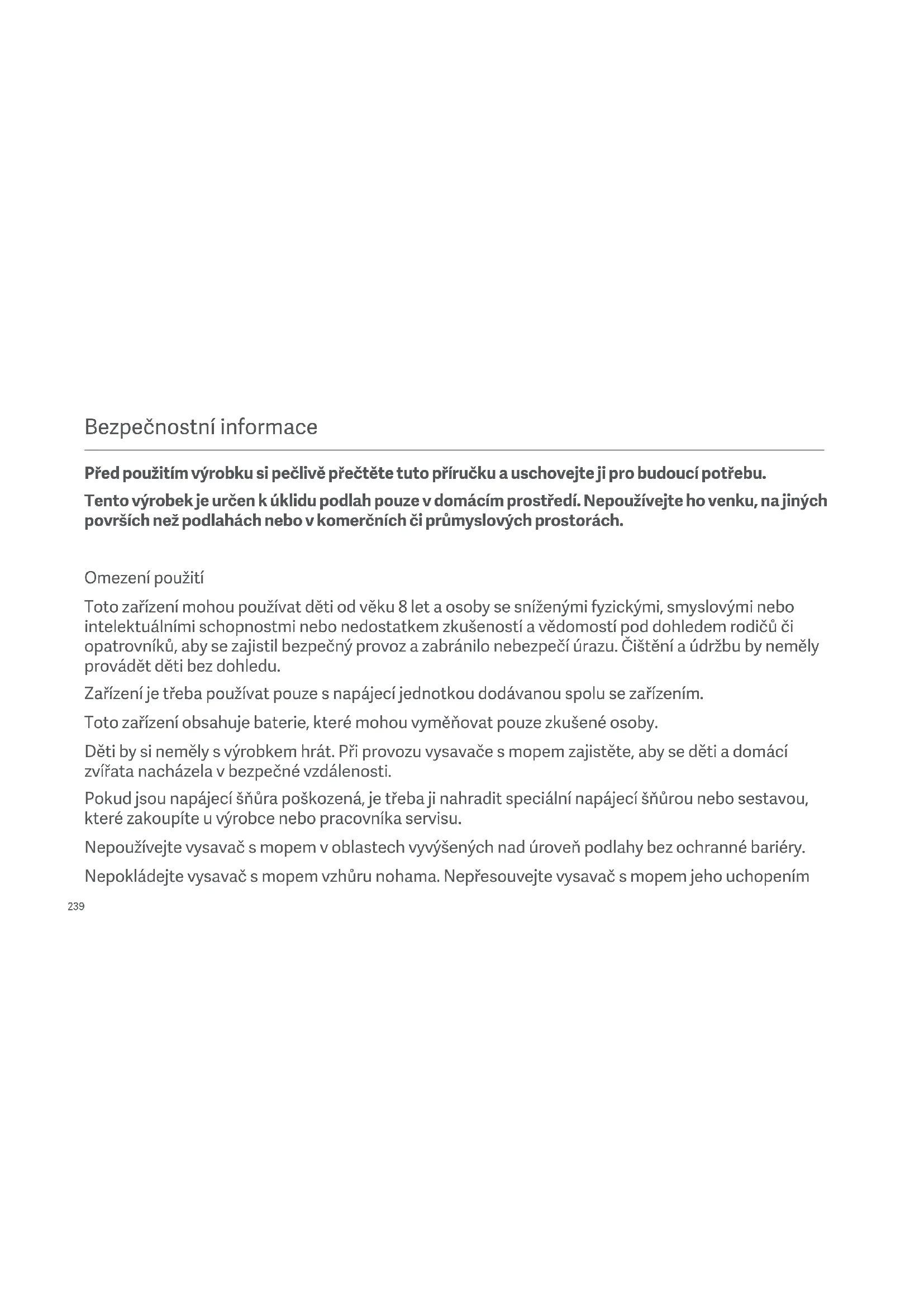 Bez ohledu na to, zda vysavač s mopem stojí, nebo je v pohybu, neusazujte na nej děti, domáci zviřata ani na nej neumistujte zhadné prédměty.