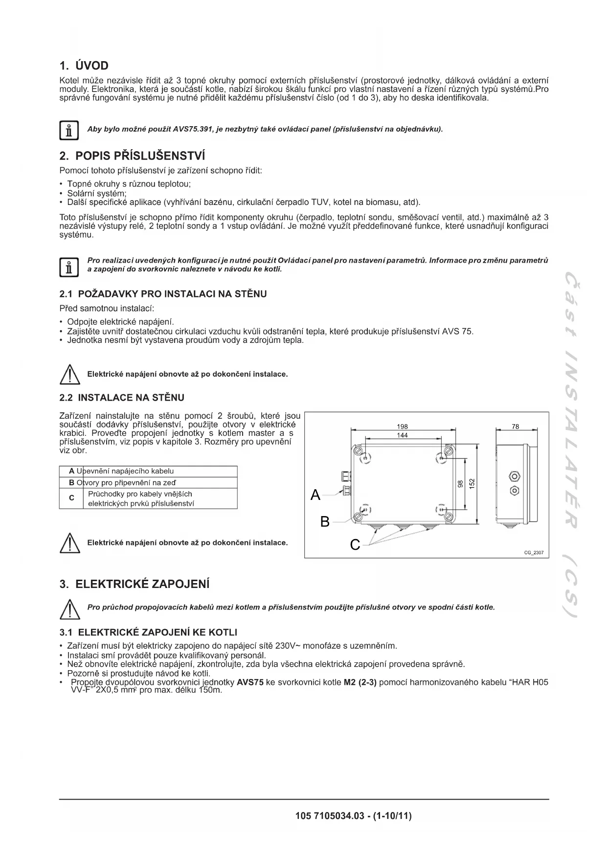 Zařízení nainstalujte na stěnu pomocí 2 šroubů, které jsou součástí dodávky příslušenství, použijte otvory v elektrické krabici. Proveďte propojení jednotky s kotlem master a s příslušenstvím, viz popis v kapitole 3. Rozměry pro upevnění viz obr. A Upevnění napájecího kabeluB Otvory pro připevnění na zeď Průchodky pro kabely vnějších elektrických prvků příslušenstvíElektrické napájení obnovte až po dokončení instalace.