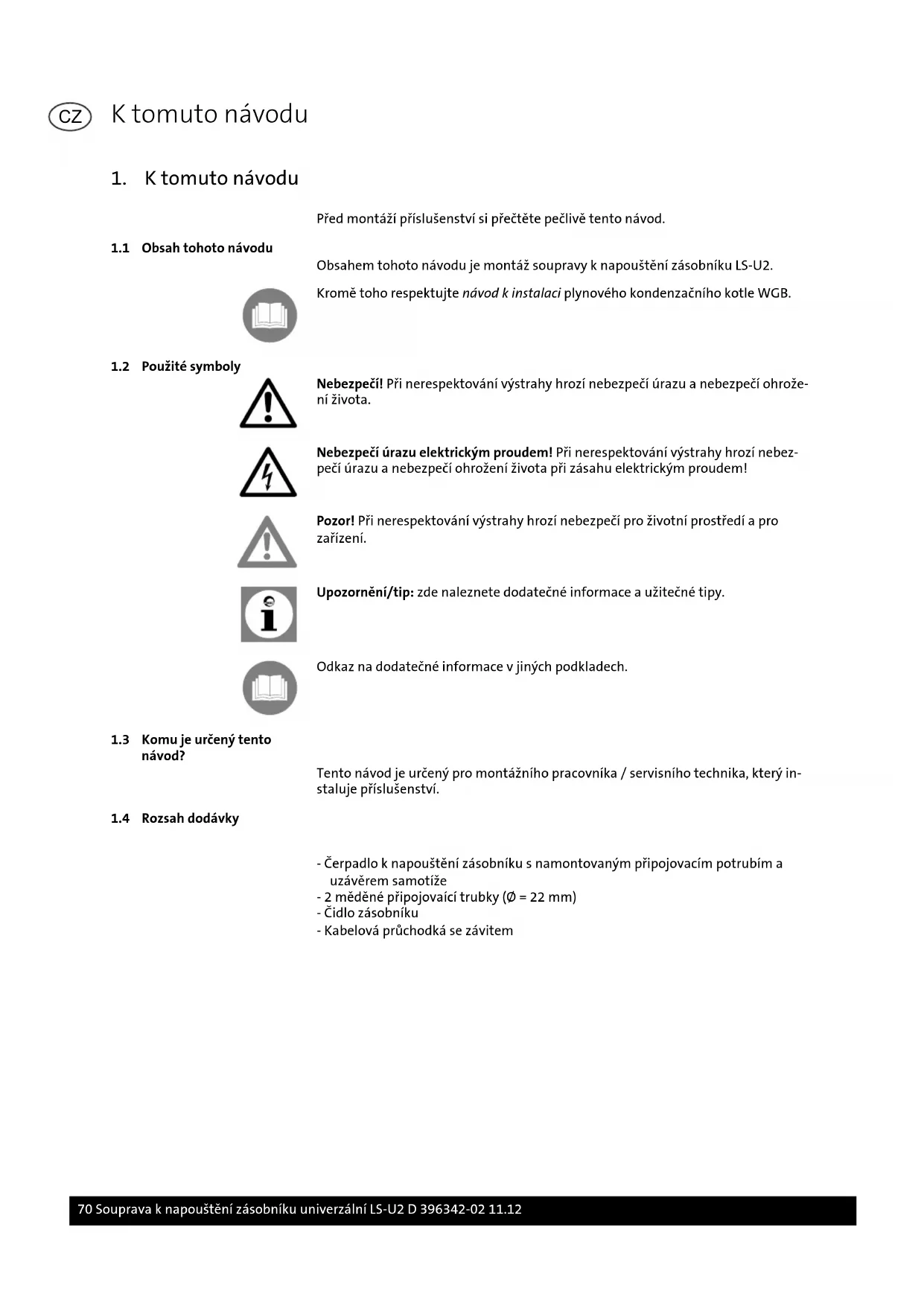 - Čerpadlo k napouštění zásobníku s namontovaným připojovacím potrubím a uzávěrem samotíže - 2 měděné připojovaící trubky (Ø = 22 mm) - Čidlo zásobníku - Kabelová průchodká se závitem K tomuto návodu 70 Souprava k napouštění zásobníku univerzální LS-U2 D 396342-02 11.12 CZ2. Bezpečnost
