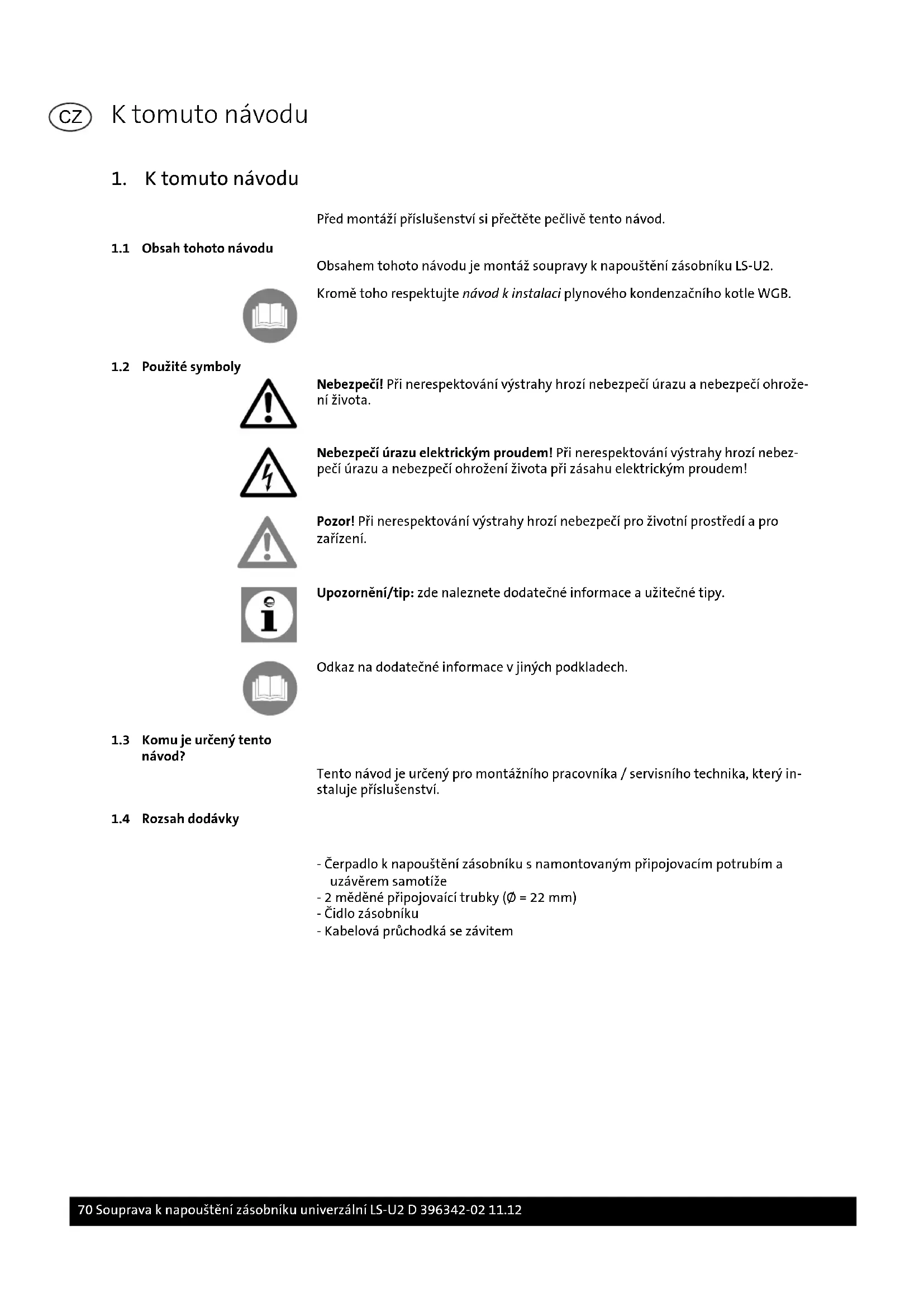 - Čerpadlo k napouštění zásobníku s namontovaným připojovacím potrubím a uzávěrem samotíže - 2 měděné připojovaící trubky (Ø = 22 mm) - Čidlo zásobníku - Kabelová průchodká se závitem K tomuto návodu 70 Souprava k napouštění zásobníku univerzální LS-U2 D 396342-02 11.12 CZ2. Bezpečnost