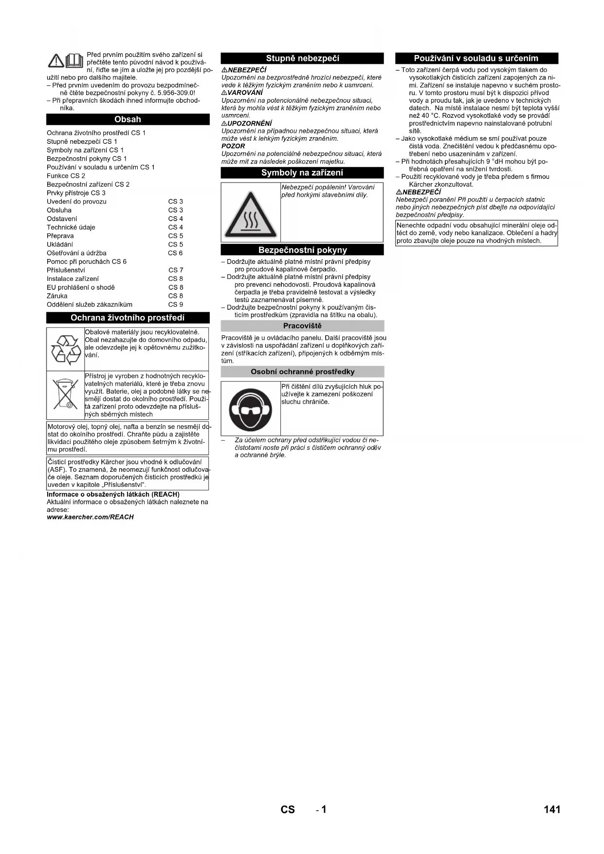 Kontrolky Uvedení do provozu Obsluha Bezpečnostní pokyny 143CS- 4 NEBEZPEČÍNebezpečí smrtelného úrazu elektrickým proudem! Vodním paprskem nemiřte na tato zařízení: – elektrické přístroje a zařízení, – toto zařízení, – součásti po proudem v pracovním prostoru. Vodní paprsek vycházející z proudnice vytváří zpětný ná-raz. Vlivem zahnutí proudnice působí síla směrem nahoru. NEBEZPEČÍ – Nebezpečí úrazu! Působením zpětného nárazu proudnice můžete ztratit rovnováhu. Může dojít k pádu. Proudnice se může volně pohybovat a zranit osoby. Zvolte bezpečné stanoviště a pistoli pevně držte. Páku ruční stříkací pistole nikdy neupevňujte. – Paprsek nikdy nesměřujte na sebe či na jiné osoby za účelem očištění oděvu či obuvi. – Nebezpečí úrazu odlétávajícími díly! Odlétávající úlomky nebo předměty mohou zranit osoby nebo zvířata. Vodním paprskem nikdy nemiřte na křehké nebo volné předměty. – Nebezpečí úrazu při poškození! Pneumatiky a ven- tily čistěte z minimální vzdálenosti 30 cm. NEBEZPEČÍ Nebezpečí ohrožení škodlivými látkami! Nestříkejte na tyto materiály, protože může dojít ke zvíření zdraví škodlivých látek:– materiály obsahující azbest,– materiály, které mohou obsahovat zdraví škodlivé látky. NEBEZPEČÍ – Nebezpečí úrazu unikajícím vodním paprskem, který může být horký! Pro zařízení jsou optimálně dimenzovány pouze originální vysokotlaké hadice Kärcher. Za používání jiných hadic se neručí. – Nebezpečí ohrožení zdraví čisticími prostředky! Při eventuálním přidání čisticího prostředku nemá voda vycházející z přístroje kvalitu pitné vody. – Nebezpečí poškození sluchu při práci na dílech zvyšujících hluk! V těchto případech používejte chrániče sluchu.몇 VAROVÁNÍ Delší doba používání zařízení může vést k poruchám prokrvení rukou následkem vibrací.Obecně platná doba užívání nemůže být stanovena, protože závisí na více faktorech.– Sklony ke špatnému průtoku krve (často studené prsty, brnění prstů).– Nízká teplota okolí. Nostě teplé rukavice k ochraně rukou.– Pevné uchopení zabraňuje průtoku krve.– Nepřerušovaný provoz je horší než provoz přeru-šovaný pauzami.Při pravidelném, dlouhodobém používání přístroje a při opětovném objevení se odpovídajících příznaků (napří-klad brnění prstů, studené prsty) doporučujeme lékař-ské vyšetření. NEBEZPEČÍ Nebezpeční poranění vycházejícím, případně horkým vodním paprskem! NEBEZPEČÍ Vždy než začnete s přístrojem pracovat, zkontrolujte vy- sokotlakou hadici, zda není poškozená. Poškozenou hadici ihned vyměňte. Před každým použitím zkontrolujte nepoškozený stav vysokotlaké hadice, potrubí, armatur a proud-nice. Zkontrolujte správné upevnění a těsnost spojek ha-dice. Hlavní vypínač otočte do polohy "0". Zavřete vodovodní přívod. Aktivujte ruční stříkací pistoli, dokud přístroj není bez tlaku. Otevřete přívod vody. Hlavní vypínač otočte do polohy "1". Stiskněte tlačítko pro odblokování.Kontrolka připravenosti svítí. Provést čištění.Upozornění:Při přestávce v čištění trvající déle než 30 vteřin se čerpadlo zastaví. Současně se spouští doba provozní připravenosti v trvání 6 hodin. V rámci doby provozní připravenosti se zařízení spouští automaticky při poklesu tlaku následkem otevření ruční stříkací pis-tole. Stiskněte tlačítko pro odblokování.Kontrolka připravenosti svítí. Hlavní vypínač otočte do polohy "0". Zavřete vodovodní přívod. Aktivujte ruční stříkací pistoli, dokud přístroj není bez tlaku. Ruční stříkací pistoli zajistěte pomocí pojistné zá- padky proti neúmyslnému otevření.Při delších provozních přestávkách nebo když nelze in-stalovat v prostoru chráněném před mrazem, proveďte tato opatření (viz kapitolu „Péče o zařízení a údržba“, odstavec „Ochrana před mrazem“): Vypusťte vodu. Přístroj vypláchněte nemrznoucí směsí. Vypněte hlavní spínač a zajistěte ho.