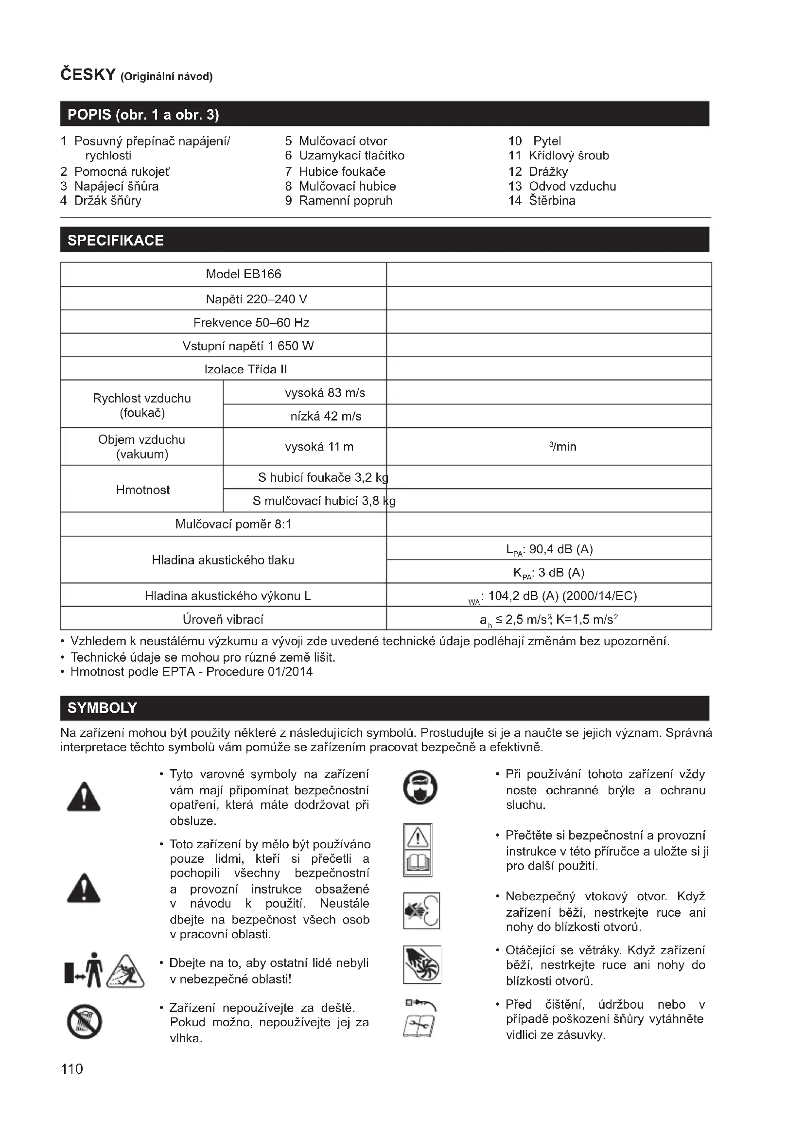 to potrebné. VYHLÁSENIE O ZHODE V RÁMCI ES Len pre krajiny Európy Vyhlásenie o zhode v rámci ES je do tohto návodu na používanie zahrnuté ako Príloha A.110 ČESKY (Originální návod) POPIS (obr. 1 a obr. 3) 1 Posuvný přepínač napájení/ rychlosti 2 Pomocná rukojeť 3 Napájecí šňůra 4 Držák šňůry 5 Mulčovací otvor 6 Uzamykací tlačítko 7 Hubice foukače 8 Mulčovací hubice 9 Ramenní popruh 10 Pytel 11 Křídlový šroub 12 Drážky 13 Odvod vzduchu 14 Štěrbina SPECIFIKACE Model EB166 Napětí 220–240 V Frekvence 50–60 Hz Vstupní napětí 1 650 W Izolace Třída II Rychlost vzduchu (foukač) vysoká 83 m/s nízká 42 m/s Objem vzduchu (vakuum) vysoká 11 m