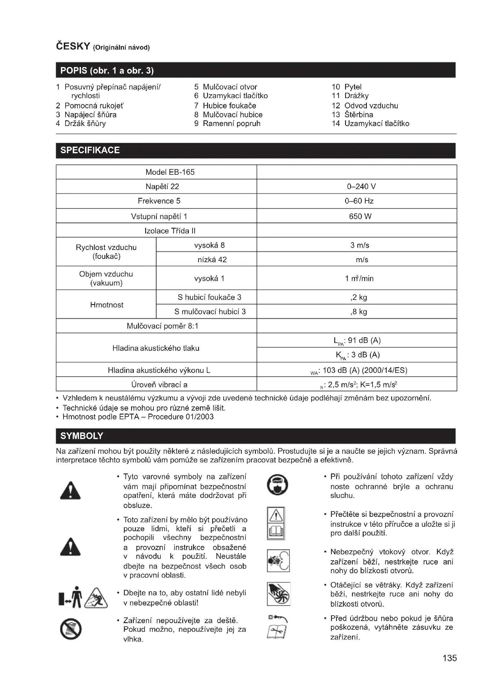 1 Drážky 12 Odvod vzduchu 13 Štěrbina 14 Uzamykací tlačítko SPECIFIKACE Model EB-165 Napětí 22 0–240 V Frekvence 5 0–60 Hz Vstupní napětí 1 650 W Izolace Třída II Rychlost vzduchu (foukač) vysoká 8 3 m/s nízká 42 m/s Objem vzduchu (vakuum) vysoká 1 1 m