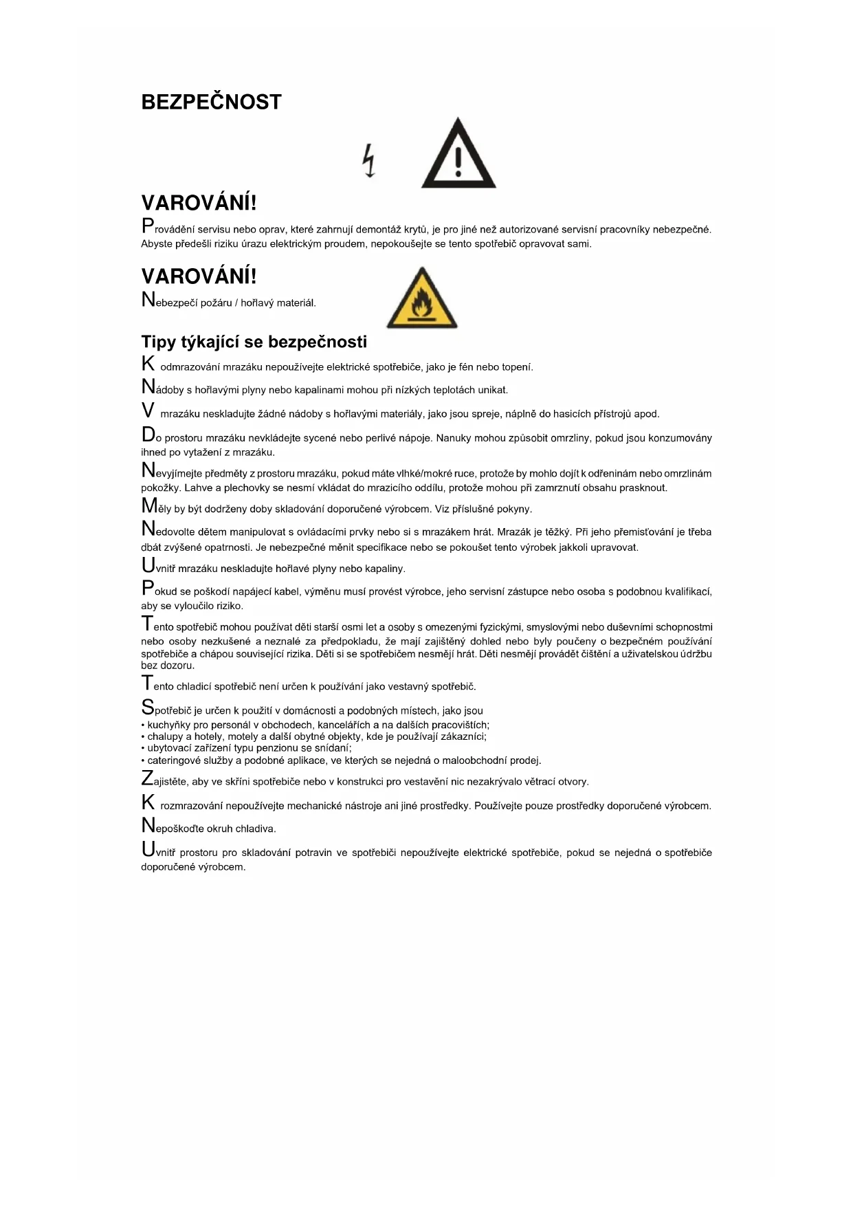 Tipy týkající se bezpečnosti K odmrazování mrazáku nepoužívejte elektrické spotřebiče, jako je fén nebo topení. Nádoby s hořlavými plyny nebo kapalinami mohou při nízkých teplotách unikat. V mrazáku neskladujte žádné nádoby s hořlavými materiály, jako jsou spreje, náplně do hasicích přístrojů apod. Do prostoru mrazáku nevkládejte sycené nebo perlivé nápoje. Nanuky mohou způsobit omrzliny, pokud jsou konzumovány ihned po vytažení z mrazáku. Nevyjímejte předměty z prostoru mrazáku, pokud máte vlhké/mokré ruce, protože by mohlo dojít k odřeninám nebo omrzlinám pokožky. Lahve a plechovky se nesmí vkládat do mrazicího oddílu, protože mohou při zamrznutí obsahu prasknout. Měly by být dodrženy doby skladování doporučené výrobcem. Viz příslušné pokyny. Nedovolte dětem manipulovat s ovládacími prvky nebo si s mrazákem hrát. Mrazák je těžký. Při jeho přemisťování je třeba dbát zvýšené opatrnosti. Je nebezpečné měnit specifikace nebo se pokoušet tento výrobek jakkoli upravovat. Uvnitř mrazáku neskladujte hořlavé plyny nebo kapaliny. Pokud se poškodí napájecí kabel, výměnu musí provést výrobce, jeho servisní zástupce nebo osoba s podobnou kvalifikací, aby se vyloučilo riziko. Tento spotřebič mohou používat děti starší osmi let a osoby s omezenými fyzickými, smyslovými nebo duševními schopnostmi nebo osoby nezkušené a neznalé za předpokladu, že mají zajištěný dohled nebo byly poučeny o bezpečném používání spotřebiče a chápou související rizika. Děti si se spotřebičem nesmějí hrát. Děti nesmějí provádět čištění a uživatelskou údržbu bez dozoru. Tento chladicí spotřebič není určen k používání jako vestavný spotřebič. Spotřebič je určen k použití v domácnosti a podobných místech, jako jsou