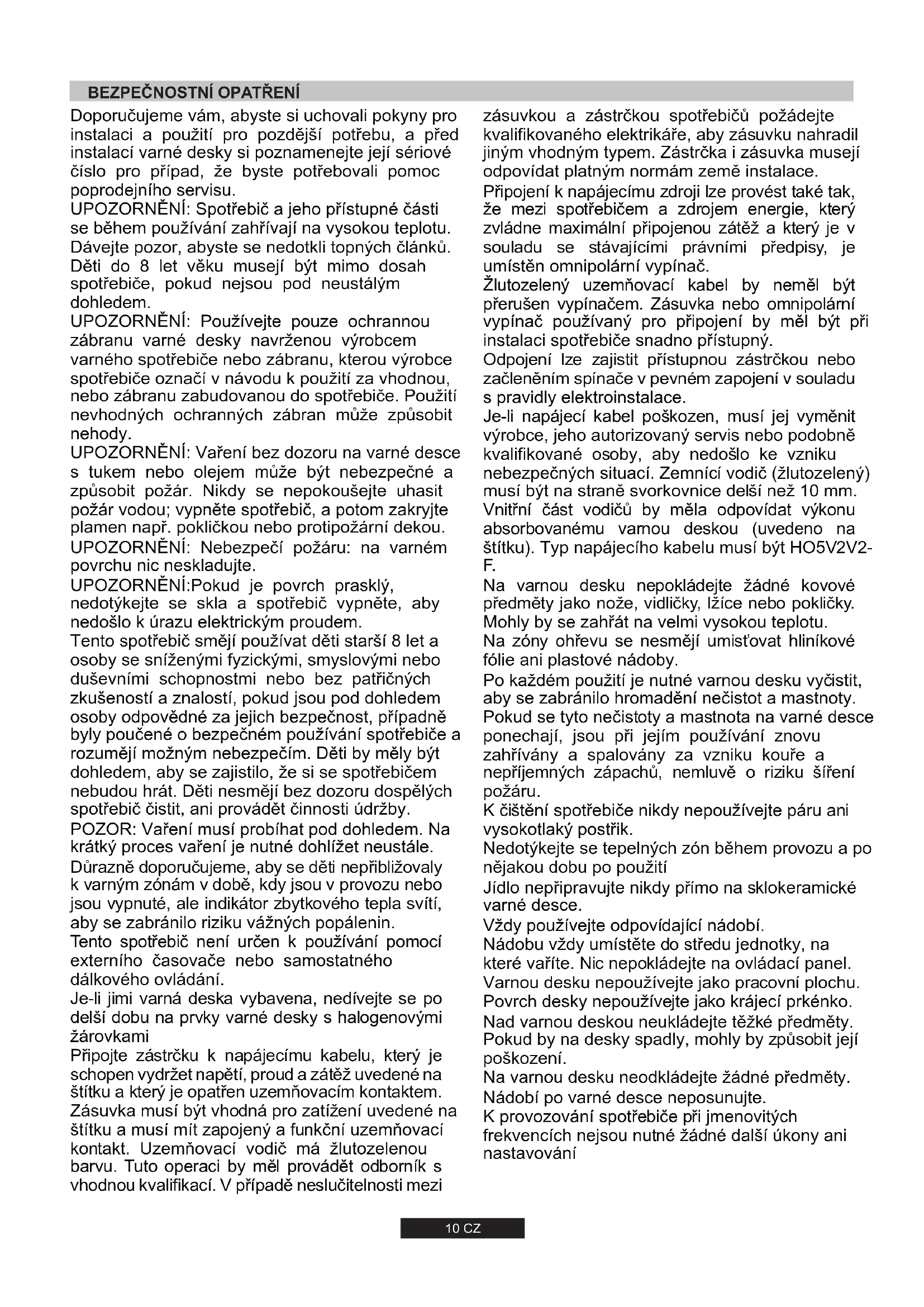 zásuvkou a zástrčkou spotřebičů požádejte kvalifikovaného elektrikáře, aby zásuvku nahradil jiným vhodným typem. Zástrčka i zásuvka musejí odpovídat platným normám země instalace. Připojení k napájecímu zdroji lze provést také tak, že mezi spotřebičem a zdrojem energie, který zvládne maximální připojenou zátěž a který je v souladu se stávajícími právními předpisy, je umístěn omnipolární vypínač. Žlutozelený uzemňovací kabel by neměl být přerušen vypínačem. Zásuvka nebo omnipolární vypínač používaný pro připojení by měl být při instalaci spotřebiče snadno přístupný. Odpojení lze zajistit přístupnou zástrčkou nebo začleněním spínače v pevném zapojení v souladu s pravidly elektroinstalace. Je-li napájecí kabel poškozen, musí jej vyměnit výrobce, jeho autorizovaný servis nebo podobně kvalifikované osoby, aby nedošlo ke vzniku nebezpečných situací. Zemnící vodič (žlutozelený) musí být na straně svorkovnice delší než 10 mm. Vnitřní část vodičů by měla odpovídat výkonu absorbovanému varnou deskou (uvedeno na štítku). Typ napájecího kabelu musí být HO5V2V2-