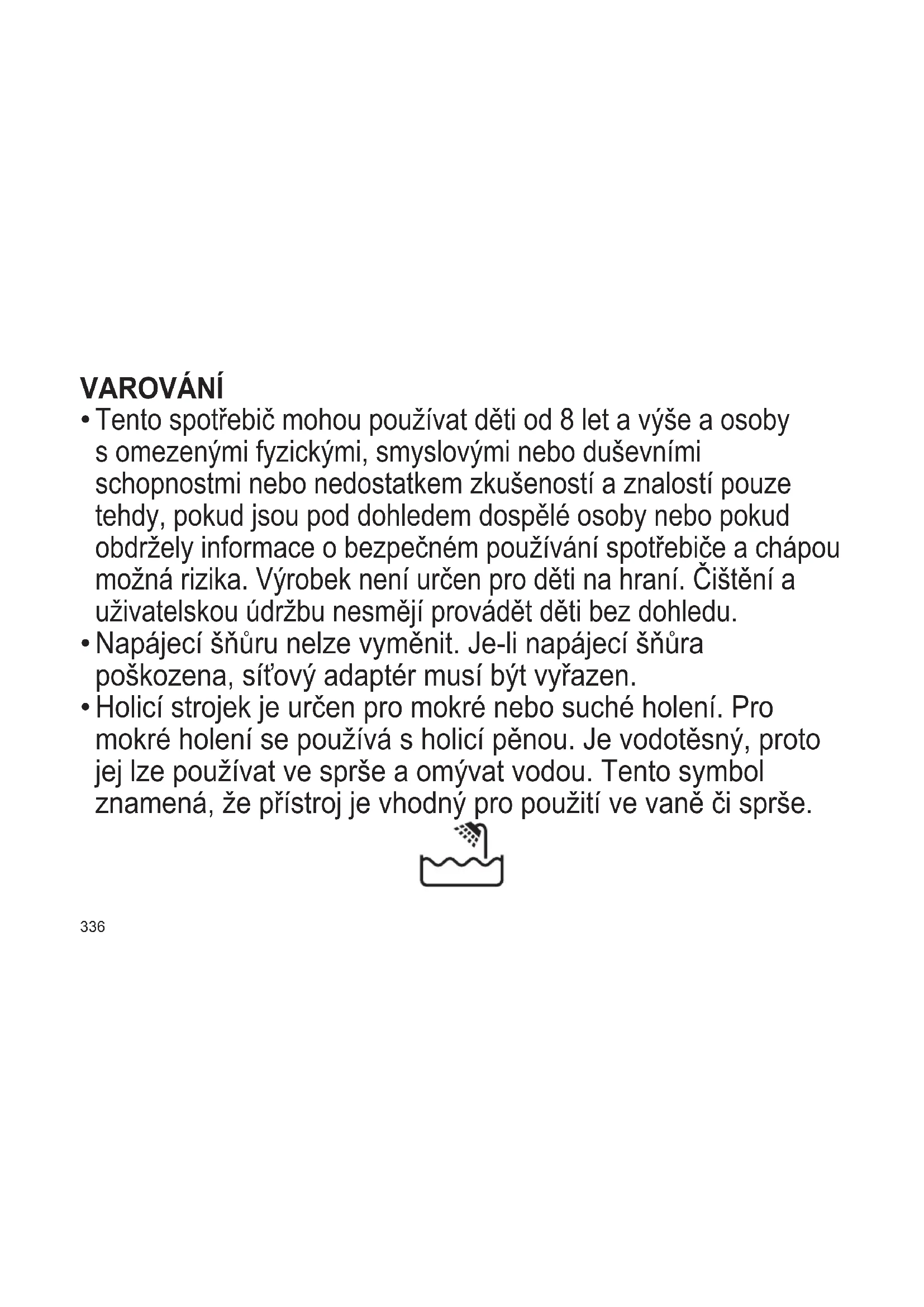 Holicí strojek je určen pro mokré nebo suché holení. Pro mokré holení se používá s holicí pěnou. Je vodotěsný, proto jej lze používat ve sprše a omývat vodou. Tento symbol znamená, že přístroj je vhodný pro použití ve vaně či sprše.337 TR RO H SK CZ PL FIN S N P DK E NL I F D GB