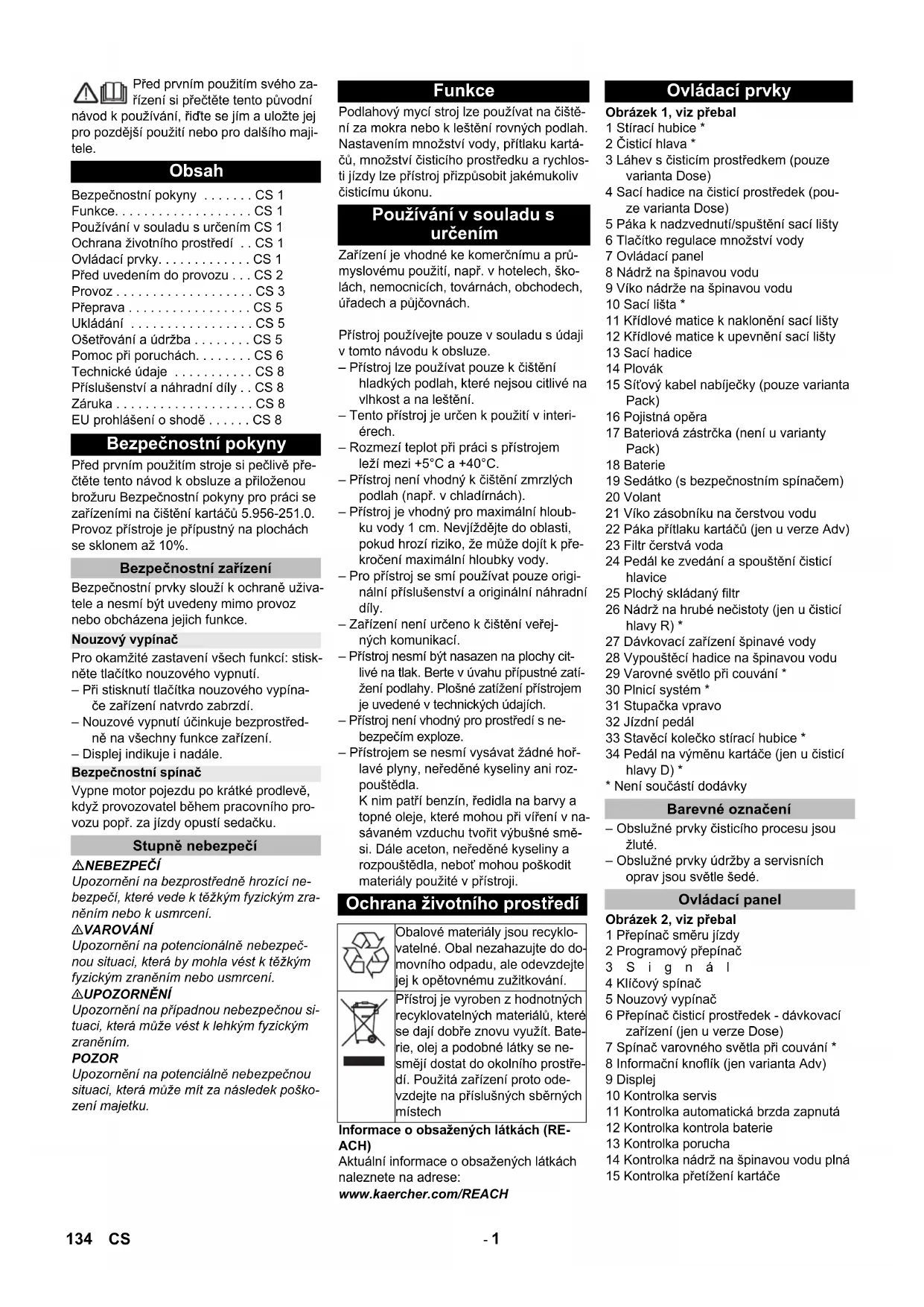 Chairman of the Board of Management Director Regulatory Affairs & Certification 133HU- 1 Před prvním použitím svého za- řízení si přečtěte tento původní návod k používání, řiďte se jím a uložte jej pro pozdější použití nebo pro dalšího maji- tele. Před prvním použitím stroje si pečlivě pře- čtěte tento návod k obsluze a přiloženou brožuru Bezpečnostní pokyny pro práci se zařízeními na čištění kartáčů 5.956-251.0. Provoz přístroje je přípustný na plochách se sklonem až 10%. Bezpečnostní prvky slouží k ochraně uživa- tele a nesmí být uvedeny mimo provoz nebo obcházena jejich funkce. Pro okamžité zastavení všech funkcí: stisk- něte tlačítko nouzového vypnutí. – Při stisknutí tlačítka nouzového vypína- če zařízení natvrdo zabrzdí. – Nouzové vypnutí účinkuje bezprostřed- ně na všechny funkce zařízení. – Displej indikuje i nadále. Vypne motor pojezdu po krátké prodlevě, když provozovatel během pracovního pro- vozu popř. za jízdy opustí sedačku. NEBEZPEČÍ Upozornění na bezprostředně hrozící ne- bezpečí, které vede k těžkým fyzickým zra- něním nebo k usmrcení. 몇 VAROVÁNÍ Upozornění na potencionálně nebezpeč- nou situaci, která by mohla vést k těžkým fyzickým zraněním nebo usmrcení. 몇 UPOZORNĚNÍ Upozornění na případnou nebezpečnou si- tuaci, která může vést k lehkým fyzickým zraněním. POZOR Upozornění na potenciálně nebezpečnou situaci, která může mít za následek poško- zení majetku. Podlahový mycí stroj lze používat na čiště- ní za mokra nebo k leštění rovných podlah. Nastavením množství vody, přítlaku kartá- čů, množství čisticího prostředku a rychlos- ti jízdy lze přístroj přizpůsobit jakémukoliv čisticímu úkonu. Zařízení je vhodné ke komerčnímu a prů- myslovému použití, např. v hotelech, ško- lách, nemocnicích, továrnách, obchodech, úřadech a půjčovnách. Přístroj používejte pouze v souladu s údaji v tomto návodu k obsluze. – Přístroj lze používat pouze k čištění hladkých podlah, které nejsou citlivé na vlhkost a na leštění. – Tento přístroj je určen k použití v interi- érech. – Rozmezí teplot při práci s přístrojem leží mezi +5°C a +40°C. – Přístroj není vhodný k čištění zmrzlých podlah (např. v chladírnách). – Přístroj je vhodný pro maximální hloub- ku vody 1 cm. Nevjíždějte do oblasti, pokud hrozí riziko, že může dojít k pře- kročení maximální hloubky vody. – Pro přístroj se smí používat pouze origi- nální příslušenství a originální náhradní díly. – Zařízení není určeno k čištění veřej- ných komunikací. – Přístroj nesmí být nasazen na plochy cit- livé na tlak. Berte v úvahu přípustné zatí- žení podlahy. Plošné zatížení přístrojem je uvedené v technických údajích. – Přístroj není vhodný pro prostředí s ne- bezpečím exploze. – Přístrojem se nesmí vysávat žádné hoř- lavé plyny, neředěné kyseliny ani roz- pouštědla. K nim patří benzín, ředidla na barvy a topné oleje, které mohou při víření v na- sávaném vzduchu tvořit výbušné smě- si. Dále aceton, neředěné kyseliny a rozpouštědla, neboť mohou poškodit materiály použité v přístroji. Informace o obsažených látkách (RE- ACH) Aktuální informace o obsažených látkách naleznete na adrese: www.kaercher.com/REACH Obrázek 1, viz přebal 1 Stírací hubice * 2 Čisticí hlava * 3 Láhev s čisticím prostředkem (pouze varianta Dose) 4 Sací hadice na čisticí prostředek (pou- ze varianta Dose) 5 Páka k nadzvednutí/spuštění sací lišty 6 Tlačítko regulace množství vody 7 Ovládací panel 8 Nádrž na špinavou vodu 9 Víko nádrže na špinavou vodu 10 Sací lišta * 11 Křídlové matice k naklonění sací lišty 12 Křídlové matice k upevnění sací lišty 13 Sací hadice 14 Plovák 15 Síťový kabel nabíječky (pouze varianta Pack) 16 Pojistná opěra 17 Bateriová zástrčka (není u varianty Pack) 18 Baterie 19 Sedátko (s bezpečnostním spínačem) 20 Volant 21 Víko zásobníku na čerstvou vodu 22 Páka přítlaku kartáčů (jen u verze Adv) 23 Filtr čerstvá voda 24 Pedál ke zvedání a spouštění čisticí hlavice 25 Plochý skládaný filtr 26 Nádrž na hrubé nečistoty (jen u čisticí hlavy R) * 27 Dávkovací zařízení špinavé vody 28 Vypouštěcí hadice na špinavou vodu 29 Varovné světlo při couvání * 30 Plnicí systém * 31 Stupačka vpravo 32 Jízdní pedál 33 Stavěcí kolečko stírací hubice * 34 Pedál na výměnu kartáče (jen u čisticí hlavy D) *