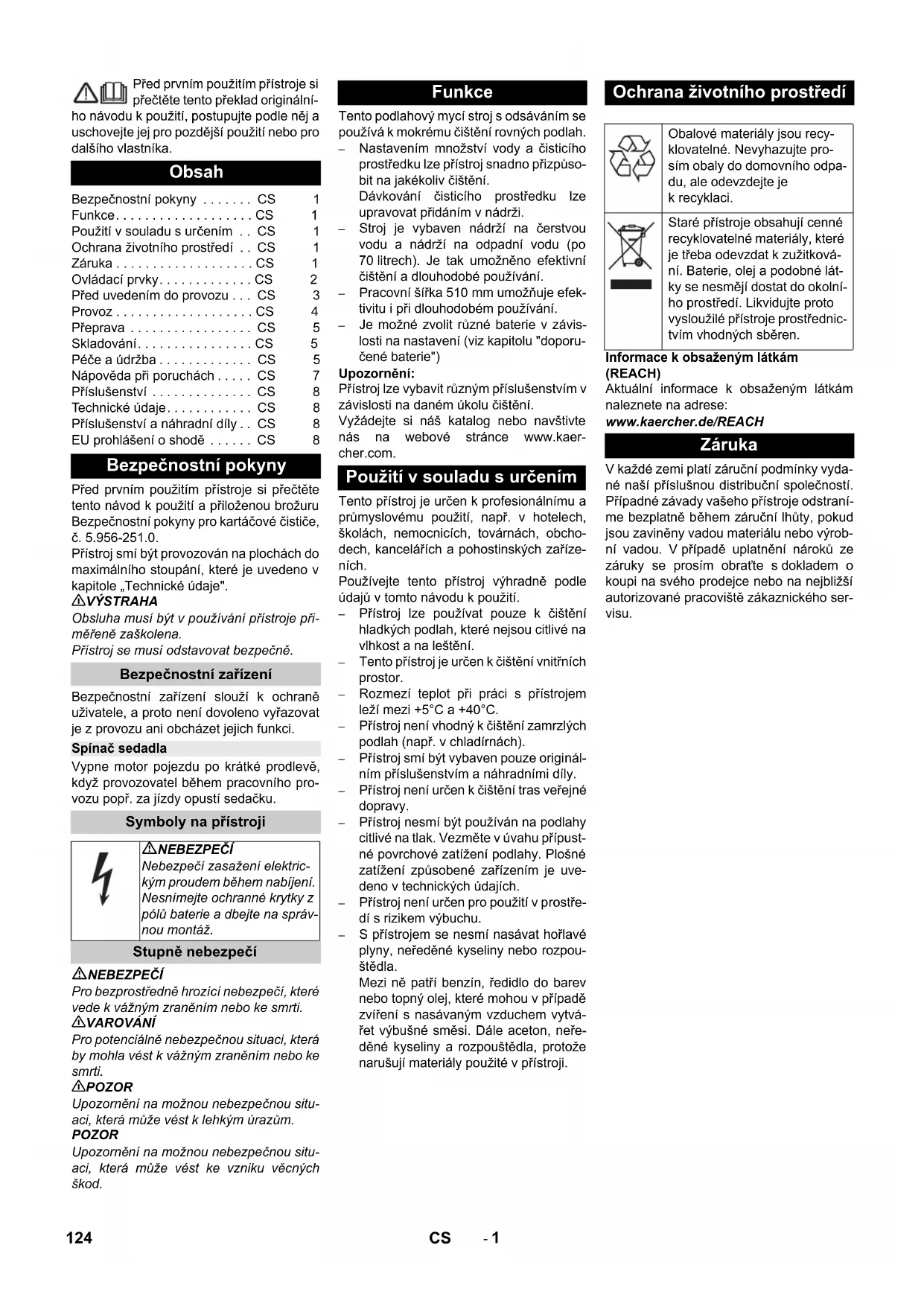 Chairman of the Board of Management Director Regulatory Affairs & Certification 123HU- 1 Před prvním použitím přístroje si přečtěte tento překlad originální- ho návodu k použití, postupujte podle něj a uschovejte jej pro pozdější použití nebo pro dalšího vlastníka. Před prvním použitím přístroje si přečtěte tento návod k použití a přiloženou brožuru Bezpečnostní pokyny pro kartáčové čističe, č. 5.956-251.0. Přístroj smí být provozován na plochách do maximálního stoupání, které je uvedeno v kapitole „Technické údaje". 몇 VÝSTRAHA Obsluha musí být v používání přístroje při- měřeně zaškolena. Přístroj se musí odstavovat bezpečně. Bezpečnostní zařízení slouží k ochraně uživatele, a proto není dovoleno vyřazovat je z provozu ani obcházet jejich funkci. Vypne motor pojezdu po krátké prodlevě, když provozovatel během pracovního pro- vozu popř. za jízdy opustí sedačku. NEBEZPEČÍ Pro bezprostředně hrozící nebezpečí, které vede k vážným zraněním nebo ke smrti. 몇 VAROVÁNÍ Pro potenciálně nebezpečnou situaci, která by mohla vést k vážným zraněním nebo ke smrti. 몇 POZOR Upozornění na možnou nebezpečnou situ- aci, která může vést k lehkým úrazům. POZOR Upozornění na možnou nebezpečnou situ- aci, která může vést ke vzniku věcných škod. Tento podlahový mycí stroj s odsáváním se používá k mokrému čištění rovných podlah. – Nastavením množství vody a čisticího prostředku lze přístroj snadno přizpůso- bit na jakékoliv čištění. Dávkování čisticího prostředku lze upravovat přidáním v nádrži. – Stroj je vybaven nádrží na čerstvou vodu a nádrží na odpadní vodu (po 70 litrech). Je tak umožněno efektivní čištění a dlouhodobé používání. – Pracovní šířka 510 mm umožňuje efek- tivitu i při dlouhodobém používání. – Je možné zvolit různé baterie v závis- losti na nastavení (viz kapitolu "doporu- čené baterie") Upozornění: Přístroj lze vybavit různým příslušenstvím v závislosti na daném úkolu čištění. Vyžádejte si náš katalog nebo navštivte nás na webové stránce www.kaer- cher.com. Tento přístroj je určen k profesionálnímu a průmyslovému použití, např. v hotelech, školách, nemocnicích, továrnách, obcho- dech, kancelářích a pohostinských zaříze- ních. Používejte tento přístroj výhradně podle údajů v tomto návodu k použití. – Přístroj lze používat pouze k čištění hladkých podlah, které nejsou citlivé na vlhkost a na leštění. – Tento přístroj je určen k čištění vnitřních prostor. – Rozmezí teplot při práci s přístrojem leží mezi +5°C a +40°C. – Přístroj není vhodný k čištění zamrzlých podlah (např. v chladírnách). – Přístroj smí být vybaven pouze originál- ním příslušenstvím a náhradními díly. – Přístroj není určen k čištění tras veřejné dopravy. – Přístroj nesmí být používán na podlahy citlivé na tlak. Vezměte v úvahu přípust- né povrchové zatížení podlahy. Plošné zatížení způsobené zařízením je uve- deno v technických údajích. – Přístroj není určen pro použití v prostře- dí s rizikem výbuchu. – S přístrojem se nesmí nasávat hořlavé plyny, neředěné kyseliny nebo rozpou- štědla. Mezi ně patří benzín, ředidlo do barev nebo topný olej, které mohou v případě zvíření s nasávaným vzduchem vytvá- řet výbušné směsi. Dále aceton, neře- děné kyseliny a rozpouštědla, protože narušují materiály použité v přístroji. Informace k obsaženým látkám (REACH) Aktuální informace k obsaženým látkám naleznete na adrese: www.kaercher.de/REACH V každé zemi platí záruční podmínky vyda- né naší příslušnou distribuční společností. Případné závady vašeho přístroje odstraní- me bezplatně během záruční lhůty, pokud jsou zaviněny vadou materiálu nebo výrob- ní vadou. V případě uplatnění nároků ze záruky se prosím obraťte s dokladem o koupi na svého prodejce nebo na nejbližší autorizované pracoviště zákaznického ser- visu. Obsah Bezpečnostní pokyny . . . . . . . CS 1 Funkce. . . . . . . . . . . . . . . . . . . CS 1 Použití v souladu s určením . . CS 1 Ochrana životního prostředí . . CS 1 Záruka . . . . . . . . . . . . . . . . . . . CS 1 Ovládací prvky. . . . . . . . . . . . . CS 2 Před uvedením do provozu . . . CS 3 Provoz . . . . . . . . . . . . . . . . . . . CS 4 Přeprava . . . . . . . . . . . . . . . . . CS 5 Skladování. . . . . . . . . . . . . . . . CS 5 Péče a údržba . . . . . . . . . . . . . CS 5 Nápověda při poruchách . . . . . CS 7 Příslušenství . . . . . . . . . . . . . . CS 8 Technické údaje. . . . . . . . . . . . CS 8 Příslušenství a náhradní díly . . CS 8 EU prohlášení o shodě . . . . . . CS 8 Bezpečnostní pokyny Bezpečnostní zařízení Spínač sedadla Symboly na přístroji NEBEZPEČÍ Nebezpečí zasažení elektric- kým proudem během nabíjení. Nesnímejte ochranné krytky z pólů baterie a dbejte na správ- nou montáž. Stupně nebezpečí Funkce Použití v souladu s určením Ochrana životního prostředí Obalové materiály jsou recy- klovatelné. Nevyhazujte pro- sím obaly do domovního odpa- du, ale odevzdejte je k recyklaci. Staré přístroje obsahují cenné recyklovatelné materiály, které je třeba odevzdat k zužitková- ní. Baterie, olej a podobné lát- ky se nesmějí dostat do okolní- ho prostředí. Likvidujte proto vysloužilé přístroje prostřednic- tvím vhodných sběren. Záruka 124 CS- 2 1 Sedadlo 2 Víko nádrže na odpadní vodu 3 Dávkovací zařízení odpadní vody 4 Volant 5Tlačítko klaksonu 6 Spínač směru jízdy 7Otočný knoflík pracovní rychlosti 8Klíčový spínač 9 Displej 10 Páka sací lišty 11 Regulačn