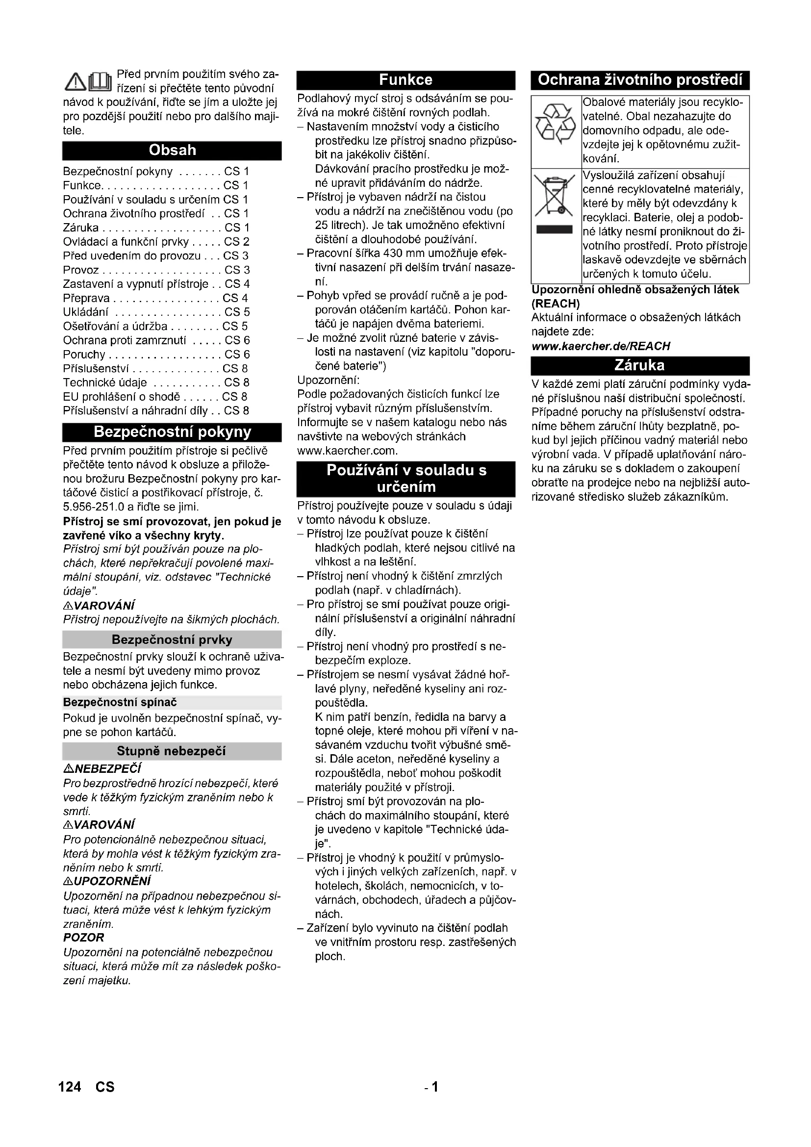 Tartozékok és alkatrészek Chairman of the Board of Management Director Regulatory Affairs & Certification 123HU- 1 Před prvním použitím svého za- řízení si přečtěte tento původní návod k používání, řiďte se jím a uložte jej pro pozdější použití nebo pro dalšího maji- tele. Před prvním použitím přístroje si pečlivě přečtěte tento návod k obsluze a přilože- nou brožuru Bezpečnostní pokyny pro kar- táčové čisticí a postřikovací přístroje, č. 5.956-251.0 a řiďte se jimi. Přístroj se smí provozovat, jen pokud je zavřené víko a všechny kryty. Přístroj smí být používán pouze na plo- chách, které nepřekračují povolené maxi- mální stoupání, viz. odstavec "Technické údaje". 몇 VAROVÁNÍ Přístroj nepoužívejte na šikmých plochách. Bezpečnostní prvky slouží k ochraně uživa- tele a nesmí být uvedeny mimo provoz nebo obcházena jejich funkce. Pokud je uvolněn bezpečnostní spínač, vy- pne se pohon kartáčů. NEBEZPEČÍ Pro bezprostředně hrozící nebezpečí, které vede k těžkým fyzickým zraněním nebo k smrti. 몇 VAROVÁNÍ Pro potencionálně nebezpečnou situaci, která by mohla vést k těžkým fyzickým zra- něním nebo k smrti. 몇 UPOZORNĚNÍ Upozornění na případnou nebezpečnou si- tuaci, která může vést k lehkým fyzickým zraněním. POZOR Upozornění na potenciálně nebezpečnou situaci, která může mít za následek poško- zení majetku. Podlahový mycí stroj s odsáváním se pou- žívá na mokré čištění rovných podlah. – Nastavením množství vody a čisticího prostředku lze přístroj snadno přizpůso- bit na jakékoliv čištění. Dávkování pracího prostředku je mož- né upravit přidáváním do nádrže. – Přístroj je vybaven nádrží na čistou vodu a nádrží na znečištěnou vodu (po 25 litrech). Je tak umožněno efektivní čištění a dlouhodobé používání. – Pracovní šířka 430 mm umožňuje efek- tivní nasazení při delším trvání nasaze- ní. – Pohyb vpřed se provádí ručně a je pod- porován otáčením kartáčů. Pohon kar- táčů je napájen dvěma bateriemi. – Je možné zvolit různé baterie v závis- losti na nastavení (viz kapitolu "doporu- čené baterie") Upozornění: Podle požadovaných čisticích funkcí lze přístroj vybavit různým příslušenstvím. Informujte se v našem katalogu nebo nás navštivte na webových stránkách www.kaercher.com. Přístroj používejte pouze v souladu s údaji v tomto návodu k obsluze. – Přístroj lze používat pouze k čištění hladkých podlah, které nejsou citlivé na vlhkost a na leštění. – Přístroj není vhodný k čištění zmrzlých podlah (např. v chladírnách). – Pro přístroj se smí používat pouze origi- nální příslušenství a originální náhradní díly. – Přístroj není vhodný pro prostředí s ne- bezpečím exploze. – Přístrojem se nesmí vysávat žádné hoř- lavé plyny, neředěné kyseliny ani roz- pouštědla. K nim patří benzín, ředidla na barvy a topné oleje, které mohou při víření v na- sávaném vzduchu tvořit výbušné smě- si. Dále aceton, neředěné kyseliny a rozpouštědla, neboť mohou poškodit materiály použité v přístroji. – Přístroj smí být provozován na plo- chách do maximálního stoupání, které je uvedeno v kapitole "Technické úda- je". – Přístroj je vhodný k použití v průmyslo- vých i jiných velkých zařízeních, např. v hotelech, školách, nemocnicích, v to- várnách, obchodech, úřadech a půjčov- nách. – Zařízení bylo vyvinuto na čištění podlah ve vnitřním prostoru resp. zastřešených ploch. Upozornění ohledně obsažených látek (REACH) Aktuální informace o obsažených látkách najdete zde: www.kaercher.de/REACH V každé zemi platí záruční podmínky vyda- né příslušnou naší distribuční společností. Případné poruchy na příslušenství odstra- níme během záruční lhůty bezplatně, po- kud byl jejich příčinou vadný materiál nebo výrobní vada. V případě uplatňování náro- ku na záruku se s dokladem o zakoupení obraťte na prodejce nebo na nejbližší auto- rizované středisko služeb zákazníkům. Obsah Bezpečnostní pokyny . . . . . . . CS 1 Funkce. . . . . . . . . . . . . . . . . . . CS 1 Používání v souladu s určením CS 1 Ochrana životního prostředí . . CS 1 Záruka . . . . . . . . . . . . . . . . . . . CS 1 Ovládací a funkční prvky . . . . . CS 2 Před uvedením do provozu . . . CS 3 Provoz . . . . . . . . . . . . . . . . . . . CS 3 Zastavení a vypnutí přístroje . . CS 4 Přeprava . . . . . . . . . . . . . . . . . CS 4 Ukládání . . . . . . . . . . . . . . . . . CS 5 Ošetřování a údržba . . . . . . . . CS 5 Ochrana proti zamrznutí . . . . . CS 6 Poruchy . . . . . . . . . . . . . . . . . . CS 6 Příslušenství . . . . . . . . . . . . . . CS 8 Technické údaje . . . . . . . . . . . CS 8 EU prohlášení o shodě . . . . . . CS 8 Příslušenství a náhradní díly . . CS 8 Bezpečnostní pokyny Bezpečnostní prvky Bezpečnostní spínač Stupně nebezpečí Funkce Používání v souladu s určením Ochrana životního prostředí Obalové materiály jsou recyklo- vatelné. Obal nezahazujte do domovního odpadu, ale ode- vzdejte jej k opětovnému zužit- kování. Vysloužilá zařízení obsahují cenné recyklovatelné materiály, které by měly být odevzdány k recyklaci. Baterie, olej a podob- né látky nesmí proniknout do ži- votního prostředí. Proto přístroje laskavě odevzdejte ve sběrnách určených k tomuto účelu. Záruka 124 CS- 2 1 Sítko na vlákna 2 bezpečnostní vypínač 3 Baterie * 4 Vypouštěcí hadice na znečištěnou vodu s dávkovacím zařízením 5 Přídržná lišta pro Homebase 6Plovák 7 Nádrž na čistou vodu 8 Uzávěr nádrže na čistou vodu 9 Čisticí hlavice 10 K