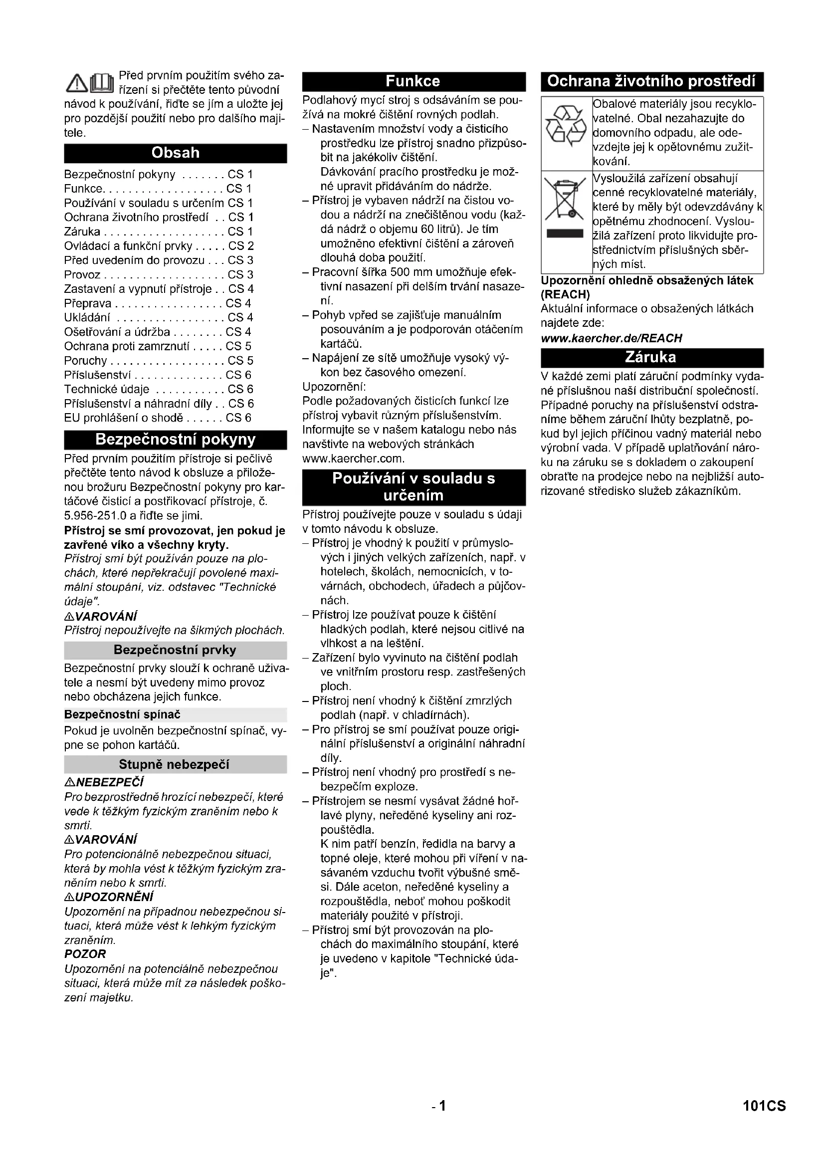 Chairman of the Board of Management Director Regulatory Affairs & Certification 100 HU- 1 Před prvním použitím svého za- řízení si přečtěte tento původní návod k používání, řiďte se jím a uložte jej pro pozdější použití nebo pro dalšího maji- tele. Před prvním použitím přístroje si pečlivě přečtěte tento návod k obsluze a přilože- nou brožuru Bezpečnostní pokyny pro kar- táčové čisticí a postřikovací přístroje, č. 5.956-251.0 a řiďte se jimi. Přístroj se smí provozovat, jen pokud je zavřené víko a všechny kryty. Přístroj smí být používán pouze na plo- chách, které nepřekračují povolené maxi- mální stoupání, viz. odstavec "Technické údaje". 몇 VAROVÁNÍ Přístroj nepoužívejte na šikmých plochách. Bezpečnostní prvky slouží k ochraně uživa- tele a nesmí být uvedeny mimo provoz nebo obcházena jejich funkce. Pokud je uvolněn bezpečnostní spínač, vy- pne se pohon kartáčů. NEBEZPEČÍ Pro bezprostředně hrozící nebezpečí, které vede k těžkým fyzickým zraněním nebo k smrti. 몇 VAROVÁNÍ Pro potencionálně nebezpečnou situaci, která by mohla vést k těžkým fyzickým zra- něním nebo k smrti. 몇 UPOZORNĚNÍ Upozornění na případnou nebezpečnou si- tuaci, která může vést k lehkým fyzickým zraněním. POZOR Upozornění na potenciálně nebezpečnou situaci, která může mít za následek poško- zení majetku. Podlahový mycí stroj s odsáváním se pou- žívá na mokré čištění rovných podlah. – Nastavením množství vody a čisticího prostředku lze přístroj snadno přizpůso- bit na jakékoliv čištění. Dávkování pracího prostředku je mož- né upravit přidáváním do nádrže. – Přístroj je vybaven nádrží na čistou vo- dou a nádrží na znečištěnou vodu (kaž- dá nádrž o objemu 60 litrů). Je tím umožněno efektivní čištění a zároveň dlouhá doba použití. – Pracovní šířka 500 mm umožňuje efek- tivní nasazení při delším trvání nasaze- ní. – Pohyb vpřed se zajišťuje manuálním posouváním a je podporován otáčením kartáčů. – Napájení ze sítě umožňuje vysoký vý- kon bez časového omezení. Upozornění: Podle požadovaných čisticích funkcí lze přístroj vybavit různým příslušenstvím. Informujte se v našem katalogu nebo nás navštivte na webových stránkách www.kaercher.com. Přístroj používejte pouze v souladu s údaji v tomto návodu k obsluze. – Přístroj je vhodný k použití v průmyslo- vých i jiných velkých zařízeních, např. v hotelech, školách, nemocnicích, v to- várnách, obchodech, úřadech a půjčov- nách. – Přístroj lze používat pouze k čištění hladkých podlah, které nejsou citlivé na vlhkost a na leštění. – Zařízení bylo vyvinuto na čištění podlah ve vnitřním prostoru resp. zastřešených ploch. – Přístroj není vhodný k čištění zmrzlých podlah (např. v chladírnách). – Pro přístroj se smí používat pouze origi- nální příslušenství a originální náhradní díly. – Přístroj není vhodný pro prostředí s ne- bezpečím exploze. – Přístrojem se nesmí vysávat žádné hoř- lavé plyny, neředěné kyseliny ani roz- pouštědla. K nim patří benzín, ředidla na barvy a topné oleje, které mohou při víření v na- sávaném vzduchu tvořit výbušné smě- si. Dále aceton, neředěné kyseliny a rozpouštědla, neboť mohou poškodit materiály použité v přístroji. – Přístroj smí být provozován na plo- chách do maximálního stoupání, které je uvedeno v kapitole "Technické úda- je". Upozornění ohledně obsažených látek (REACH) Aktuální informace o obsažených látkách najdete zde: www.kaercher.de/REACH V každé zemi platí záruční podmínky vyda- né příslušnou naší distribuční společností. Případné poruchy na příslušenství odstra- níme během záruční lhůty bezplatně, po- kud byl jejich příčinou vadný materiál nebo výrobní vada. V případě uplatňování náro- ku na záruku se s dokladem o zakoupení obraťte na prodejce nebo na nejbližší auto- rizované středisko služeb zákazníkům. Obsah Bezpečnostní pokyny . . . . . . . CS 1 Funkce. . . . . . . . . . . . . . . . . . . CS 1 Používání v souladu s určením CS 1 Ochrana životního prostředí . . CS 1 Záruka . . . . . . . . . . . . . . . . . . . CS 1 Ovládací a funkční prvky . . . . . CS 2 Před uvedením do provozu . . . CS 3 Provoz . . . . . . . . . . . . . . . . . . . CS 3 Zastavení a vypnutí přístroje . . CS 4 Přeprava . . . . . . . . . . . . . . . . . CS 4 Ukládání . . . . . . . . . . . . . . . . . CS 4 Ošetřování a údržba . . . . . . . . CS 4 Ochrana proti zamrznutí . . . . . CS 5 Poruchy . . . . . . . . . . . . . . . . . . CS 5 Příslušenství . . . . . . . . . . . . . . CS 6 Technické údaje . . . . . . . . . . . CS 6 Příslušenství a náhradní díly . . CS 6 EU prohlášení o shodě . . . . . . CS 6 Bezpečnostní pokyny Bezpečnostní prvky Bezpečnostní spínač Stupně nebezpečí Funkce Používání v souladu s určením Ochrana životního prostředí Obalové materiály jsou recyklo- vatelné. Obal nezahazujte do domovního odpadu, ale ode- vzdejte jej k opětovnému zužit- kování. Vysloužilá zařízení obsahují cenné recyklovatelné materiály, které by měly být odevzdávány k opětnému zhodnocení. Vyslou- žilá zařízení proto likvidujte pro- střednictvím příslušných sběr- ných míst. Záruka 101CS- 2 1 Sítko na vlákna 2 bezpečnostní vypínač 3 Vypouštěcí hadice na znečištěnou vodu s dávkovacím zařízením 4 Přídržná lišta pro Homebase 5 Plovák 6 Nádrž na čistou vodu 7 Uzávěr nádrže na čistou vodu 8 Úchopová zaoblina 9 Čisticí hlavice 10 Kotoučový kartáč 11 Plnicí otvor nádrže na čistou vodu 12 Držák pro výměnu kartá