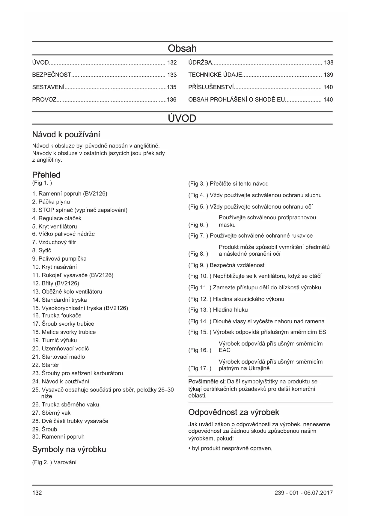 Symboly na výrobku (Fig 2. ) Varování (Fig 3. ) Přečtěte si tento návod (Fig 4. ) Vždy používejte schválenou ochranu sluchu (Fig 5. ) Vždy používejte schválenou ochranu očí (Fig 6. ) Používejte schválenou protiprachovou masku (Fig 7. ) Používejte schválené ochranné rukavice (Fig 8. ) Produkt může způsobit vymrštění předmětů a následné poranění očí (Fig 9. ) Bezpečná vzdálenost (Fig 10. ) Nepřibližujte se k ventilátoru, když se otáčí (Fig 11. ) Zamezte přístupu dětí do blízkosti výrobku (Fig 12. ) Hladina akustického výkonu (Fig 13. ) Hladina hluku (Fig 14. ) Dlouhé vlasy si vyčešte nahoru nad ramena (Fig 15. ) Výrobek odpovídá příslušným směrnicím ES (Fig 16. ) Výrobek odpovídá příslušným směrnicím EAC (Fig 17. ) Výrobek odpovídá příslušným směrnicím platným na Ukrajině Povšimněte si: Další symboly/štítky na produktu se týkají certifikačních požadavků pro další komerční oblasti. Odpovědnost za výrobek Jak uvádí zákon o odpovědnosti za výrobek, neneseme odpovědnost za žádnou škodu způsobenou našim výrobkem, pokud: