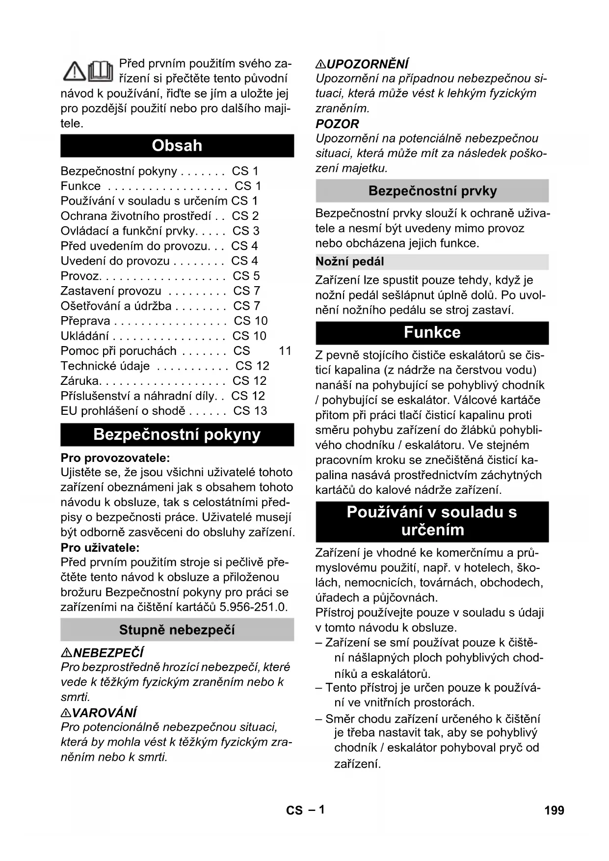 Chairman of the Board of Management Director Regulatory Affairs & Certification 198 HU– 1 Před prvním použitím svého za- řízení si přečtěte tento původní návod k používání, řiďte se jím a uložte jej pro pozdější použití nebo pro dalšího maji- tele. Pro provozovatele: Ujistěte se, že jsou všichni uživatelé tohoto zařízení obeznámeni jak s obsahem tohoto návodu k obsluze, tak s celostátními před- pisy o bezpečnosti práce. Uživatelé musejí být odborně zasvěceni do obsluhy zařízení. Pro uživatele: Před prvním použitím stroje si pečlivě pře- čtěte tento návod k obsluze a přiloženou brožuru Bezpečnostní pokyny pro práci se zařízeními na čištění kartáčů 5.956-251.0. NEBEZPEČÍ Pro bezprostředně hrozící nebezpečí, které vede k těžkým fyzickým zraněním nebo k smrti. 몇 VAROVÁNÍ Pro potencionálně nebezpečnou situaci, která by mohla vést k těžkým fyzickým zra- něním nebo k smrti. 몇 UPOZORNĚNÍ Upozornění na případnou nebezpečnou si- tuaci, která může vést k lehkým fyzickým zraněním. POZOR Upozornění na potenciálně nebezpečnou situaci, která může mít za následek poško- zení majetku. Bezpečnostní prvky slouží k ochraně uživa- tele a nesmí být uvedeny mimo provoz nebo obcházena jejich funkce. Zařízení lze spustit pouze tehdy, když je nožní pedál sešlápnut úplně dolů. Po uvol- nění nožního pedálu se stroj zastaví. Z pevně stojícího čističe eskalátorů se čis- ticí kapalina (z nádrže na čerstvou vodu) nanáší na pohybující se pohyblivý chodník / pohybující se eskalátor. Válcové kartáče přitom při práci tlačí čisticí kapalinu proti směru pohybu zařízení do žlábků pohybli- vého chodníku / eskalátoru. Ve stejném pracovním kroku se znečištěná čisticí ka- palina nasává prostřednictvím záchytných kartáčů do kalové nádrže zařízení. Zařízení je vhodné ke komerčnímu a prů- myslovému použití, např. v hotelech, ško- lách, nemocnicích, továrnách, obchodech, úřadech a půjčovnách. Přístroj používejte pouze v souladu s údaji v tomto návodu k obsluze. – Zařízení se smí používat pouze k čiště- ní nášlapných ploch pohyblivých chod- níků a eskalátorů. – Tento přístroj je určen pouze k používá- ní ve vnitřních prostorách. – Směr chodu zařízení určeného k čištění je třeba nastavit tak, aby se pohyblivý chodník / eskalátor pohyboval pryč od zařízení. Obsah Bezpečnostní pokyny . . . . . . . CS 1 Funkce . . . . . . . . . . . . . . . . . . CS 1 Používání v souladu s určením CS 1 Ochrana životního prostředí . . CS 2 Ovládací a funkční prvky. . . . . CS 3 Před uvedením do provozu. . . CS 4 Uvedení do provozu . . . . . . . . CS 4 Provoz. . . . . . . . . . . . . . . . . . . CS 5 Zastavení provozu . . . . . . . . . CS 7 Ošetřování a údržba . . . . . . . . CS 7 Přeprava . . . . . . . . . . . . . . . . . CS 10 Ukládání . . . . . . . . . . . . . . . . . CS 10 Pomoc při poruchách . . . . . . . CS 11 Technické údaje . . . . . . . . . . . CS 12 Záruka. . . . . . . . . . . . . . . . . . . CS 12 Příslušenství a náhradní díly. . CS 12 EU prohlášení o shodě . . . . . . CS 13 Bezpečnostní pokyny Stupně nebezpečí Bezpečnostní prvky Nožní pedál Funkce Používání v souladu s určením 199CS– 2 – K čištění eskalátorů se smí zařízení po- užít pouze na dolním konci eskalátoru. – Pro přístroj se smí používat pouze origi- nální příslušenství a originální náhradní díly. Informace o obsažených látkách (RE- ACH) Aktuální informace o obsažených látkách naleznete na adrese: www.kaercher.com/REACH Ochrana životního prostředí Obalové materiály jsou recyklo- vatelné. Obal nezahazujte do domovního odpadu, ale ode- vzdejte jej k opětovnému zužit- kování. Přístroj je vyroben z hodnotných recyklovatelných materiálů, kte- ré je třeba znovu využít. Baterie, olej a podobné látky se nesmějí dostat do okolního prostředí. Po- užitá zařízení proto odevzdejte na příslušných sběrných mís- tech 200 CS– 3 1 Posuvné rameno 2 Vypouštěcí hadice na čerstvou vodu 3 Vypouštěcí hadice na špinavou vodu 4 Síťová zástrčka 5 Hák na odlehčení tahu 6 Nožní pedál 7 Zadní kola se zádržnou pákou 8 Víko nádrže na špinavou vodu 9 Přední kola 10 Nádrž na špinavou vodu 11 Plnicí otvor nádrže na čistou vodu 12 Pedál na spuštění / zvednutí kartáčova- cí hlavy 13 Páka na aretaci tlačítka kartáče 1 Počítadlo provozních hodin 2 Údaj o čerpacím tlaku 3 Spínač přístroje 4 Kontrolka "kalová nádrž plná" 5 Kontrolka "přetížení motoru kartáčů" Ovládací a funkční prvky Ovládací panel 201CS– 4 Odstraňte obaly s výjimkou dřevěné pa- lety. Posuvné rameno vsaďte do vybrání v zařízení. Posuvné rameno připevněte 4 přilože- nými šrouby. Upevněte odnímatelné kryty. Háky na odlehčení tahu zavěste na po- suvné rameno. Zajistěte zadní kola, odejměte dřevěné klíny určené k zablokování kol. Čtyři označená podlahová prkna palety jsou upevněna šrouby. Prkna odšroubujte. Prkna položte na hranu palety. Prkna nastavte tak, aby ležela před kolečky přístroje. Prkna upevněte šrouby. Zařízení pomalu sesuňte z rampy. Upozornění: Při výrobě byl přístroj propláchnut nemrz- noucím prostředkem. Před prvním uvedení do provozu se musí nemrznoucí prostředek odstranit. Nádrž na čerstvou vodu naplňte 10 l čerstvé vody. Sešlápněte nožní pedál. Na spínači zařízení nastavte základní čiště- ní. Zařízení nechte v provozu tak dlouho, dokud tlak na tlakoměru neklesne. NEBEZPEČÍ Nebezpečí úrazu! Přístroj se může zachytit a může být stržen pohyblivým chodníkem / pohyblivými schody. Před čištěním je t