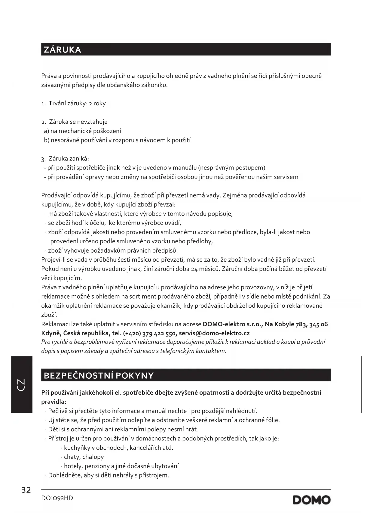 - zboží vyhovuje požadavkům právních předpisů. Projeví-li se vada v průběhu šesti měsíců od převzetí, má se za to, že zboží bylo vadné již při převzetí. Pokud není u výrobku uvedeno jinak, činí záruční doba 24 měsíců. Záruční doba počíná běžet od převzetí věci kupujícím. Práva z vadného plnění uplatňuje kupující u prodávajícího na adrese jeho provozovny, v níž je přijetí reklamace možné s ohledem na sortiment prodávaného zboží, případně i v sídle nebo místě podnikání. Za okamžik uplatnění reklamace se považuje okamžik, kdy prodávající obdržel od kupujícího reklamované zboží. Reklamaci lze také uplatnit v servisním středisku na adrese DOMO-elektro s.r.o., Na Kobyle 783, 345 06 Kdyně, Česká republika, tel. (+420) 379 422 550, servis@domo-elektro.cz Pro rychlé a bezproblémové vyřízení reklamace doporučujeme přiložit k reklamaci doklad o koupi a průvodní dopis s popisem závady a zpáteční adresou s telefonickým kontaktem.