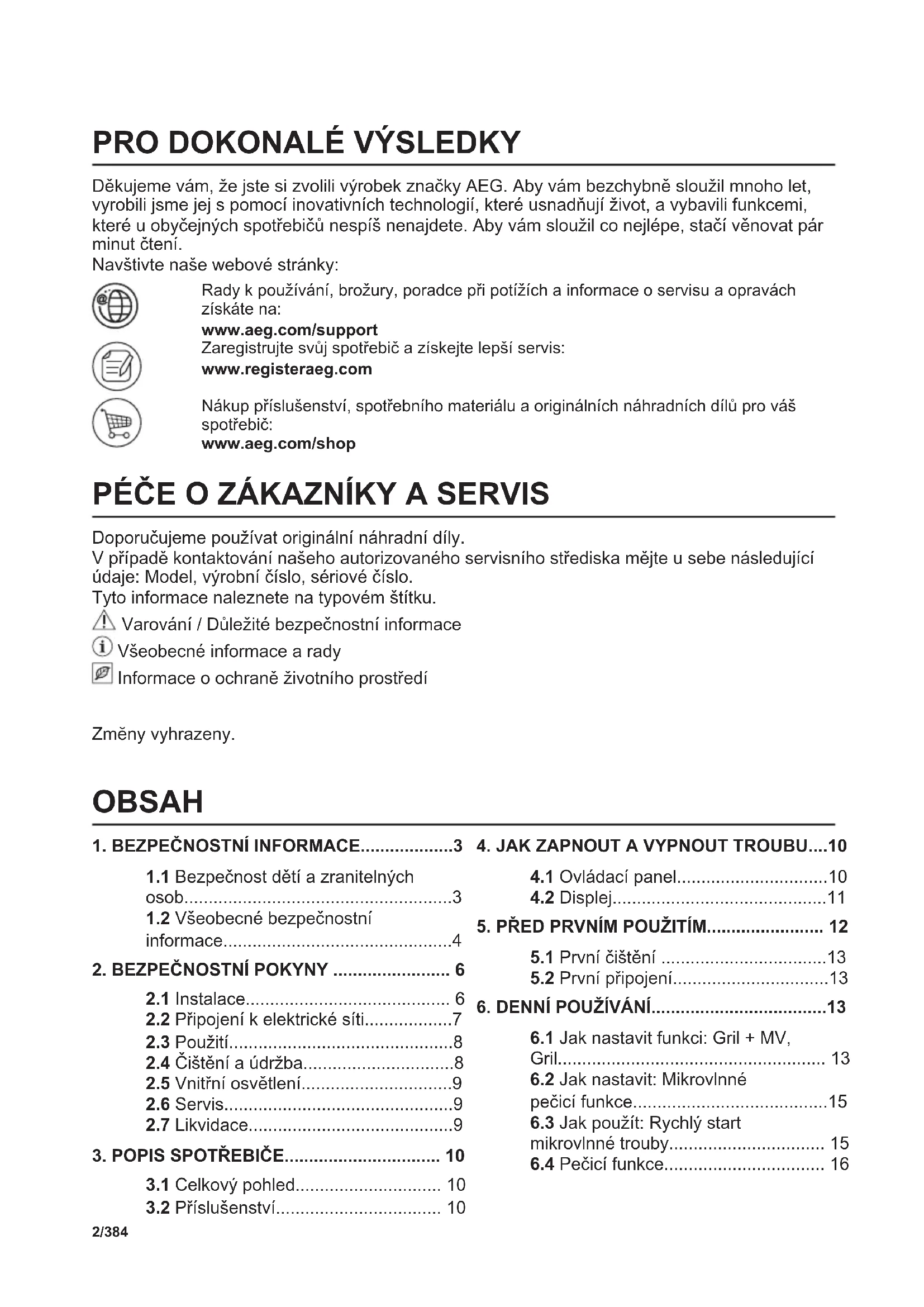 Děkujeme vám, že jste si zvolili výrobek značky AEG. Aby vám bezchybně sloužil mnoho let, vyrobili jsme jej s pomocí inovativních technologií, které usnadňují život, a vybavili funkcemi, které u obyčejných spotřebičů nespíš nenajdete. Aby vám sloužil co nejlépe, stačí věnovat pár minut čtení. Navštivte naše webové stránky: Rady k používání, brožury, poradce při potížích a informace o servisu a opravách získáte na: www.aeg.com/support Zaregistrujte svůj spotřebič a získejte lepší servis: www.registeraeg.com Nákup příslušenství, spotřebního materiálu a originálních náhradních dílů pro váš spotřebič: www.aeg.com/shop PÉČE O ZÁKAZNÍKY A SERVIS Doporučujeme používat originální náhradní díly. V případě kontaktování našeho autorizovaného servisního střediska mějte u sebe následující údaje: Model, výrobní číslo, sériové číslo. Tyto informace naleznete na typovém štítku. Varování / Důležité bezpečnostní informace Všeobecné informace a rady Informace o ochraně životního prostředí Zmĕny vyhrazeny. OBSAH