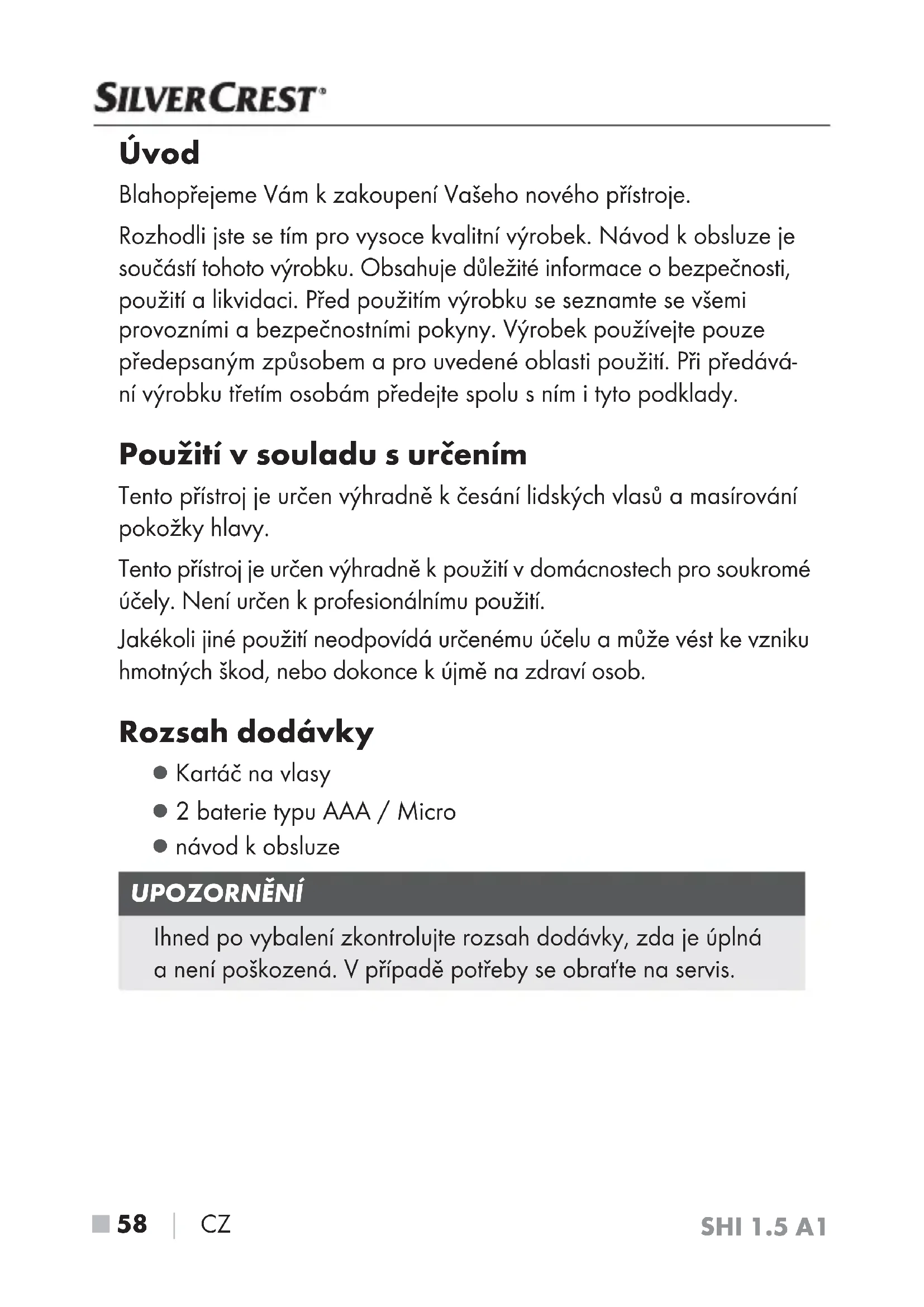 - Dovozce SHI 1.5 A1 ■ 58 │ CZ Úvod Blahopřejeme Vám kzakoupení Vašeho nového přístroje. Rozhodli jste se tím pro vysoce kvalitní výrobek. Návod kobsluze je součástí tohoto výrobku. Obsahuje důležité informace obezpečnosti, použití a likvidaci. Před použitím výrobku se seznamte se všemi provozními a bezpečnostními pokyny. Výrobek používejte pouze předepsaným způsobem a pro uvedené oblasti použití. Při předává- ní výrobku třetím osobám předejte spolu sním ityto podklady. Použití vsouladu surčením Tento přístroj je určen výhradně k česání lidských vlasů a masírování pokožky hlavy. Tento přístroj je určen výhradně kpoužití vdomácnostech pro soukromé účely. Není určen kprofesionálnímu použití. Jakékoli jiné použití neodpovídá určenému účelu a může vést ke vzniku hmotných škod, nebo dokonce k újmě na zdraví osob. Rozsah dodávky ▯ Kartáč na vlasy ▯ 2 baterie typu AAA / Micro ▯ návod k obsluze UPOZORNĚNÍ Ihned po vybalení zkontrolujte rozsah dodávky, zda je úplná a není poškozená. Vpřípadě potřeby se obraťte na servis.SHI 1.5 A1 CZ │ 59 ■ Popis přístroje kontrolka ruční část odjištění ( = zajištěno; = odjištěno) p. 70