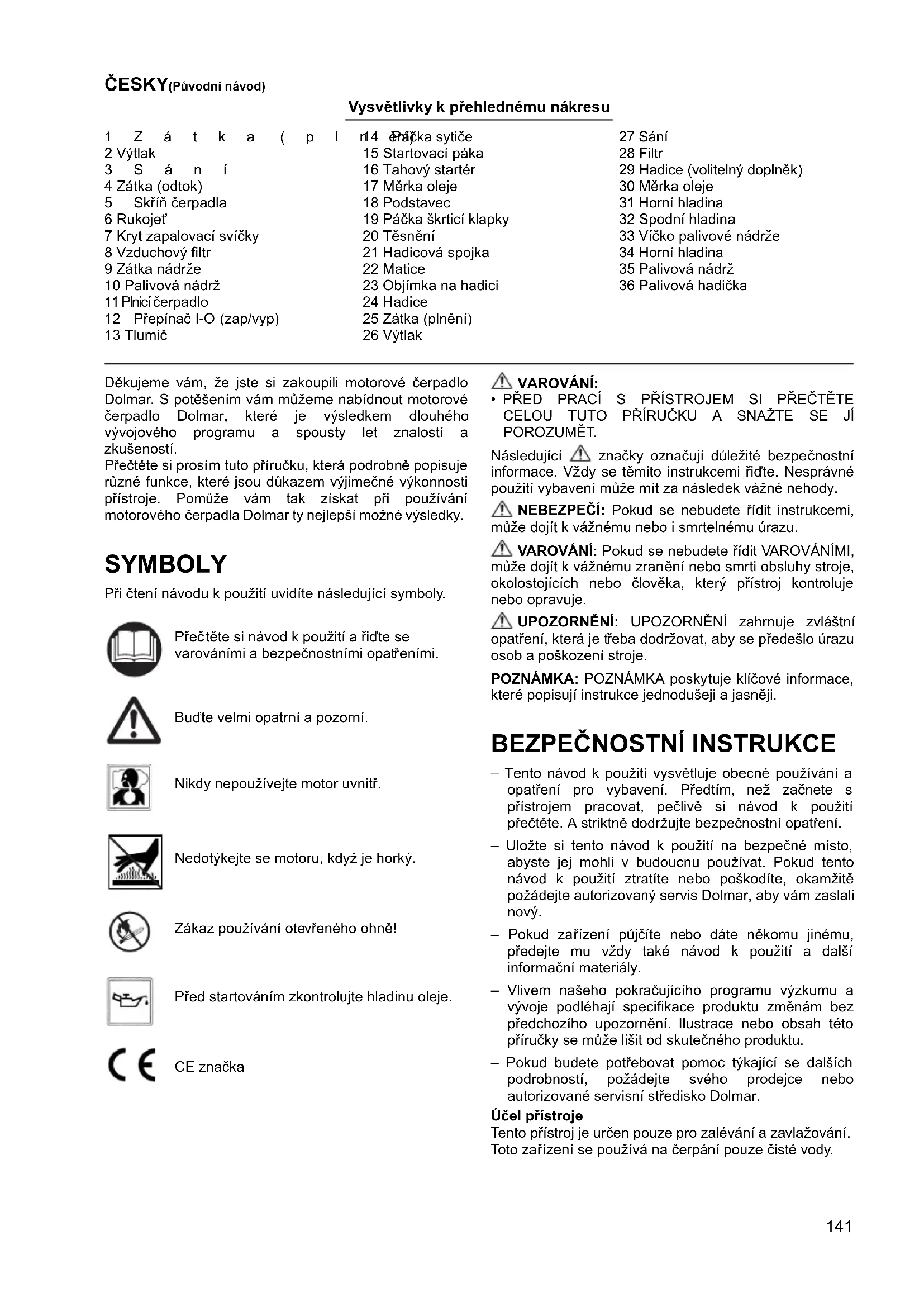 – Tento návod k použití vysvětluje obecné používání a opatření pro vybavení. Předtím, než začnete s přístrojem pracovat, pečlivě si návod k použití přečtěte. A striktně dodržujte bezpečnostní opatření. – Uložte si tento návod k použití na bezpečné místo, abyste jej mohli v budoucnu používat. Pokud tento návod k použití ztratíte nebo poškodíte, okamžitě požádejte autorizovaný servis Dolmar, aby vám zaslali nový. – Pokud zařízení půjčíte nebo dáte někomu jinému, předejte mu vždy také návod k použití a další informační materiály. – Vlivem našeho pokračujícího programu výzkumu a vývoje podléhají specifikace produktu změnám bez předchozího upozornění. Ilustrace nebo obsah této příručky se může lišit od skutečného produktu. – Pokud budete potřebovat pomoc týkající se dalších podrobností, požádejte svého prodejce nebo autorizované servisní středisko Dolmar. Účel přístroje Tento přístroj je určen pouze pro zalévání a zavlažování. Toto z a řízení se používá na čerpání pouze čisté vody. Přeč těte si návod k použití a řiďte se varováními a bezpečnostními opatřeními. Buďte velmi opatrní a pozorní. Nikdy nepoužívejte motor uvnitř. Nedotýkejte se motoru, když je horký. Zákaz používání otevřeného ohně! Před startováním zkontrolujte hladinu oleje. CE značka142 NEBEZPEČÍ: