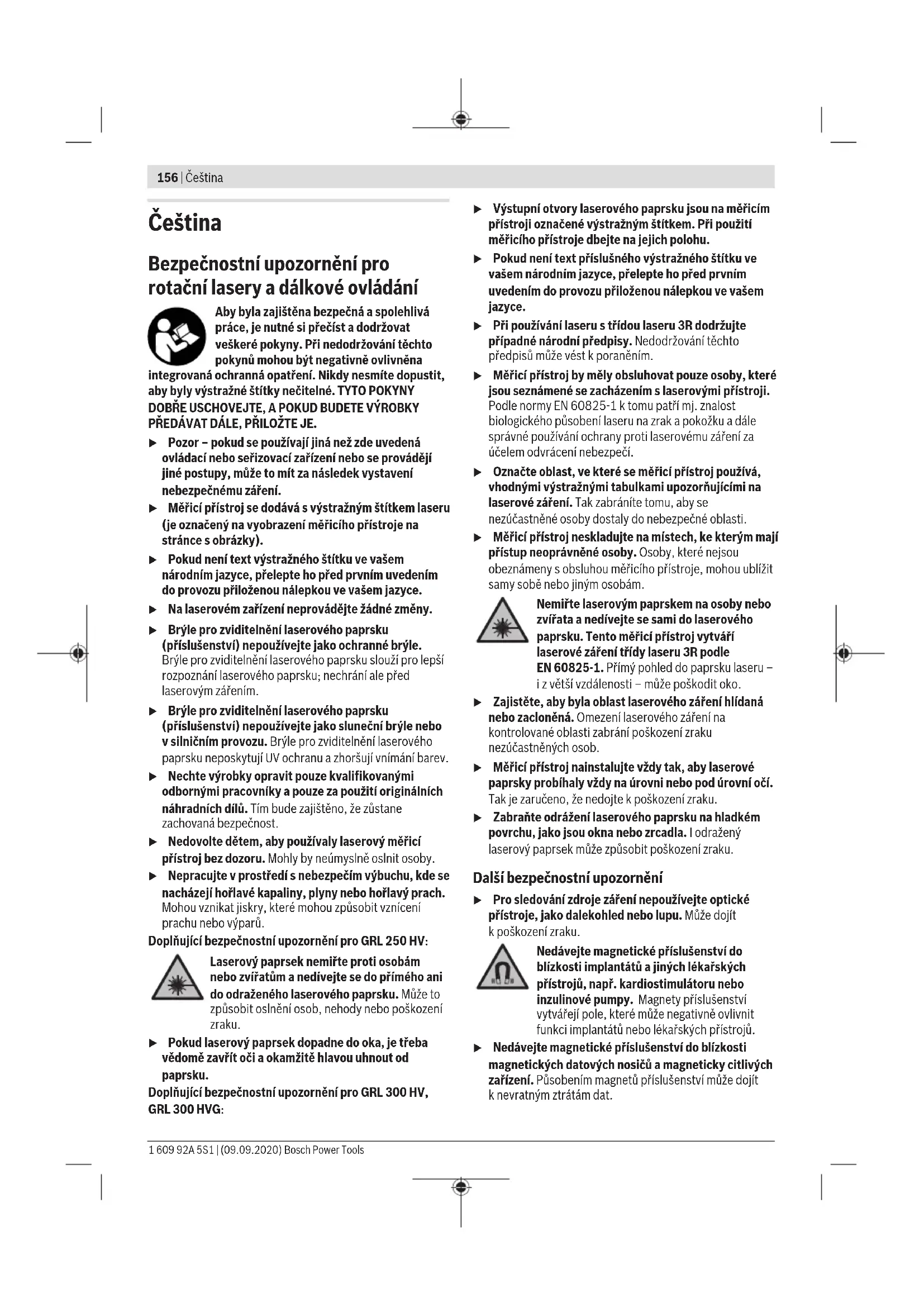 Zakres automatycznej niwelacji przekroczony 2×/s ○ ● Aktywacja funkcji ostrzegania o wstrząsach ● Zadziałanie funkcji ostrzegania o wstrząsach 2×/s ○ 2×/s Napięcie baterii/akumulatora przy pracy ≤2h 2×/s Baterie/akumulatorki puste ○ ○ ● ●:Praca ciągła 2×/s: częstotliwość migania (np. dwa razy na sekundę) ○:Funkcja wstrzymana Konserwacja i serwis Konserwacja i czyszczenie Urządzenie pomiarowe, ładowarkę i pilot należy zawsze utrzymywać w czystości. Nie należy zanurzać urządzenia pomiarowego, ładowarki i pi- lota w wodzie ani innych cieczach. Zanieczyszczenia należy usuwać za pomocą wilgotnej, mięk- kiej ściereczki. Nie stosować żadnych środków czyszczących ani rozpuszczalników. W szczególności należy regularnie czyścić powierzchnie przy otworze wyjściowym wiązki lasera, starannie usuwając kłaczki kurzu. Obsługa klienta oraz doradztwo dotyczące użytkowania Ze wszystkimi pytaniami, dotyczącymi naprawy ikonserwa- cji nabytego produktu oraz dostępu do części zamiennych, prosimy zwracać się do punktów obsługi klienta. Rysunki techniczne oraz informacje o częściach zamiennych można znaleźć pod adresem: www.bosch-pt.com Nasz zespół doradztwa dotyczącego użytkowania odpowie na wszystkie pytania związane z produktami firmy Bosch oraz ich osprzętem. Przy wszystkich zgłoszeniach oraz zamówieniach części za- miennych konieczne jest podanie 10‑cyfrowego numeru ka- talogowego, znajdującego się na tabliczce znamionowej pro- duktu. Polska Robert Bosch Sp. z o.o. Serwis Elektronarzędzi Ul. Jutrzenki 102/104 02-230 Warszawa Na www.serwisbosch.com znajdą Państwo wszystkie szcze- góły dotyczące usług serwisowych online. Tel.: 22 7154450 Faks: 22 7154440 E-Mail: bsc@pl.bosch.com www.bosch-pt.pl Pozostałe adresy serwisów znajdują się na stronie: www.bosch-pt.com/serviceaddresses Utylizacja odpadów Urządzenia elektryczne, akumulatory/baterie, osprzęt i opakowania należy doprowadzić do po- nownego przetworzenia zgodnie z przepisami ochrony środowiska. Nie wolno wyrzucać urządzeń elektrycznych i akumulatorów/baterii razem z odpadami z gospo- darstwa domowego! Tylko dla krajów UE: Zgodnie z europejską dyrektywą 2012/19/UE niezdatne do użytku urządzenia elektryczne, a zgodnie z europejską dy- rektywą 2006/66/WE uszkodzone lub zużyte akumulatory/ baterie, należy zbierać osobno i doprowadzić do ponownego przetworzenia zgodnie z przepisami ochrony środowiska. Bosch Power Tools 1 609 92A 5S1 | (09.09.2020)156 | Čeština Čeština Bezpečnostní upozornění pro rotační lasery adálkové ovládání Aby byla zajištěna bezpečná aspolehlivá práce, je nutné si přečíst adodržovat veškeré pokyny. Při nedodržování těchto pokynů mohou být negativně ovlivněna integrovaná ochranná opatření. Nikdy nesmíte dopustit, aby byly výstražné štítky nečitelné. TYTO POKYNY DOBŘE USCHOVEJTE, APOKUD BUDETE VÝROBKY PŘEDÁVAT DÁLE, PŘILOŽTE JE. u Pozor – pokud se používají jiná než zde uvedená ovládací nebo seřizovací zařízení nebo se provádějí jiné postupy, může to mít za následek vystavení nebezpečnému záření. u Měřicí přístroj se dodává svýstražným štítkem laseru (je označený na vyobrazení měřicího přístroje na stránce sobrázky). u Pokud není text výstražného štítku ve vašem národním jazyce, přelepte ho před prvním uvedením do provozu přiloženou nálepkou ve vašem jazyce. u Na laserovém zařízení neprovádějte žádné změny.u Brýle pro zviditelnění laserového paprsku (příslušenství) nepoužívejte jako ochranné brýle. Brýle pro zviditelnění laserového paprsku slouží pro lepší rozpoznání laserového paprsku; nechrání ale před laserovým zářením. u Brýle pro zviditelnění laserového paprsku (příslušenství) nepoužívejte jako sluneční brýle nebo vsilničním provozu. Brýle pro zviditelnění laserového paprsku neposkytují UV ochranu azhoršují vnímání barev. u Nechte výrobky opravit pouze kvalifikovanými odbornými pracovníky apouze za použití originálních náhradních dílů. Tím bude zajištěno, že zůstane zachovaná bezpečnost. u Nedovolte dětem, aby používaly laserový měřicí přístroj bez dozoru. Mohly by neúmyslně oslnit osoby. u Nepracujte vprostředí snebezpečím výbuchu, kde se nacházejí hořlavé kapaliny, plyny nebo hořlavý prach. Mohou vznikat jiskry, které mohou způsobit vznícení prachu nebo výparů. Doplňující bezpečnostní upozornění pro GRL250HV: Laserový paprsek nemiřte proti osobám nebo zvířatům anedívejte se do přímého ani do odraženého laserového paprsku. Může to způsobit oslnění osob, nehody nebo poškození zraku. u Pokud laserový paprsek dopadne do oka, je třeba vědomě zavřít oči aokamžitě hlavou uhnout od paprsku. Doplňující bezpečnostní upozornění pro GRL300HV, GRL300HVG: u Výstupní otvory laserového paprsku jsou na měřicím přístroji označené výstražným štítkem. Při použití měřicího přístroje dbejte na jejich polohu. u Pokud není text příslušného výstražného štítku ve vašem národním jazyce, přelepte ho před prvním uvedením do provozu přiloženou nálepkou ve vašem jazyce. u Při používání laseru střídou laseru 3R dodržujte případné národní předpisy. Nedodržování těchto předpisů může vést kporaněním. u Měřicí přístroj by měly obsluhovat pouze osoby, které jsou seznámené se zacházením slaserovými přístroji. Podle normy EN60825-1 ktomu patří mj. znalost biologického působení laseru na zrak apokožku adále správné používání ochrany proti laserovému záření za účelem odvrácení nebezpečí. u Označte oblast, ve které se měřicí přístroj používá, vhodnými výstražnými tabulkami upozorňujícími na laserové záření. Tak zabráníte tomu, aby se nezúčastněn