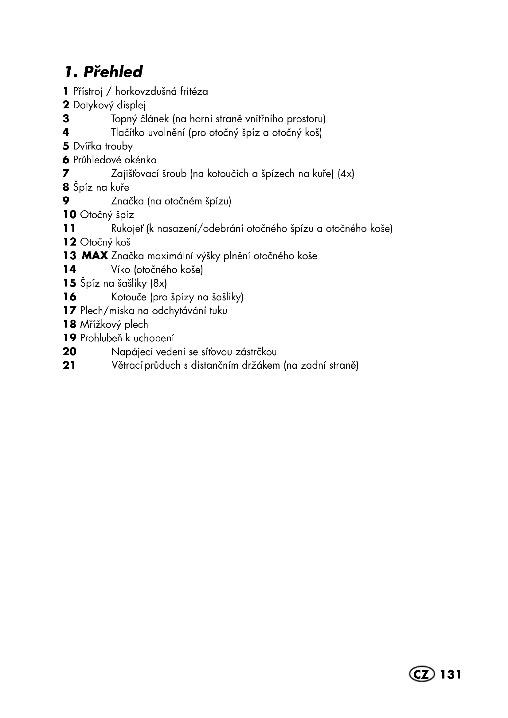 1 Přístroj / horkovzdušná fritéza 2 Dotykový displej 3 Topný článek (na horní straně vnitřního prostoru) 4 Tlačítko uvolnění (pro otočný špíz a otočný koš) 5 Dvířka trouby 6 Průhledové okénko 7 Zajišťovací šroub (na kotoučích a špízech na kuře) (4x) 8 Špíz na kuře 9 Značka (na otočném špízu) 10 Otočný špíz 11 Rukojeť (k nasazení/odebrání otočného špízu a otočného koše) 12 Otočný koš 13 MAX Značka maximální výšky plnění otočného koše 14 Víko (otočného koše) 15 Špíz na šašliky (8x) 16 Kotouče (pro špízy na šašliky) 17 Plech/miska na odchytávání tuku 18 Mřížkový plech 19 Prohlubeň k uchopení 20 Napájecí vedení se síťovou zástrčkou
