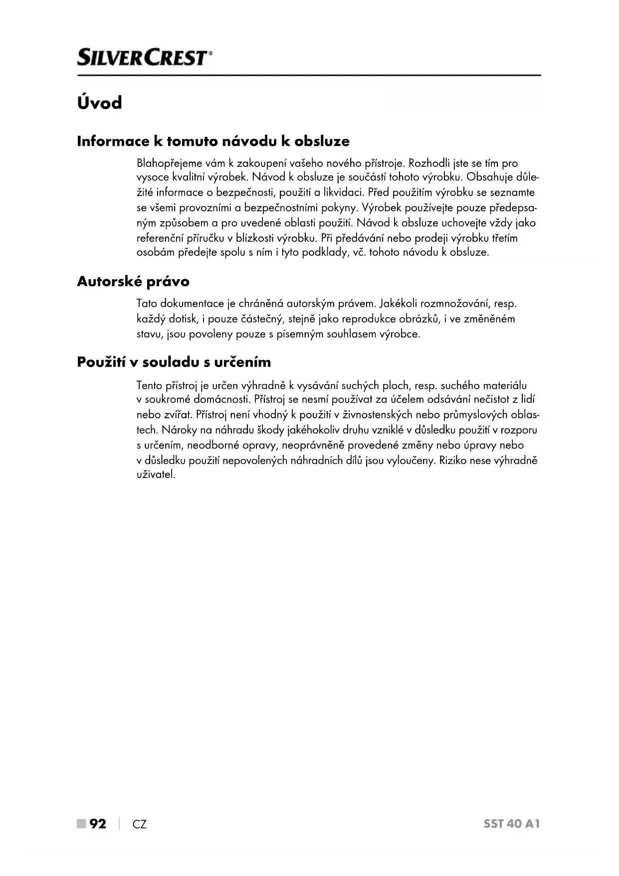 CZ SST 40 A1 Úvod Informace ktomuto návodu kobsluze Blahopřejeme vám kzakoupení vašeho nového přístroje. Rozhodli jste se tím pro vysoce kvalitní výrobek. Návod kobsluze je součástí tohoto výrobku. Obsahuje důle- žité informace obezpečnosti, použití a likvidaci. Před použitím výrobku se seznamte se všemi provozními a bezpečnostními pokyny. Výrobek používejte pouze předepsa- ným způsobem a pro uvedené oblasti použití. Návod k obsluze uchovejte vždy jako referenční příručku v blízkosti výrobku. Při předávání nebo prodeji výrobku třetím osobám předejte spolu sním ityto podklady, vč. tohoto návodu k obsluze. Autorské právo Tato dokumentace je chráněná autorským právem. Jakékoli rozmnožování, resp. každý dotisk, i pouze částečný, stejně jako reprodukce obrázků, i ve změněném stavu, jsou povoleny pouze spísemným souhlasem výrobce. Použití vsouladu surčením Tento přístroj je určen výhradně kvysávání suchých ploch, resp. suchého materiálu v soukromé domácnosti. Přístroj se nesmí používat za účelem odsávání nečistot z lidí nebo zvířat. Přístroj není vhodný kpoužití vživnostenských nebo průmyslových oblas- tech. Nároky na náhradu škody jakéhokoliv druhu vzniklé vdůsledku použití vrozporu surčením, neodborné opravy, neoprávněně provedené změny nebo úpravy nebo vdůsledku použití nepovolených náhradních dílů jsou vyloučeny. Riziko nese výhradně uživatel. IB_329834_SST40A1_LB8.indb 92 24.09.2021 08:41:28CZ