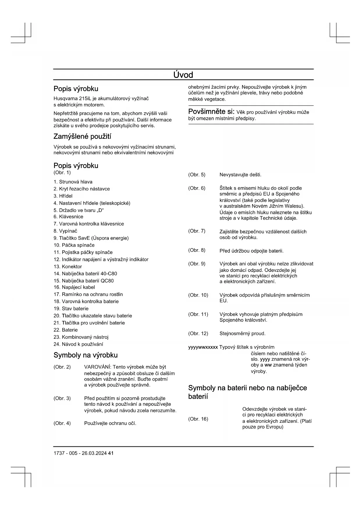 - Huskvarna, 2024-02-01 Claes Losdal, мениджър по развойна дейност, Husqvarna AB Отговорен за техническата документация Obsah Úvod p. 41