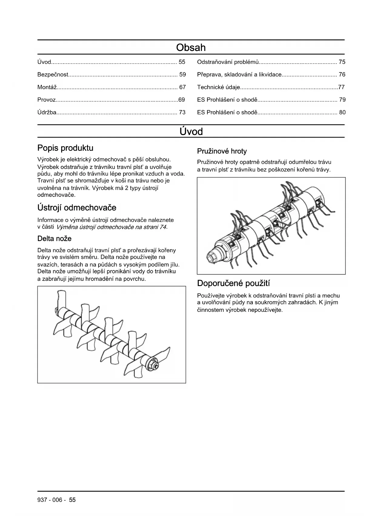 - ES Prohlášení o shodě Úvod Popis produktu Výrobek je elektrický odmechovač s pěší obsluhou. Výrobek odstraňuje z trávníku travní plsť a uvolňuje půdu, aby mohl do trávníku lépe pronikat vzduch a voda. Travní plsť se shromažďuje v koši na trávu nebo je uvolněna na trávník. Výrobek má 2 typy ústrojí odmechovače. Ústrojí odmechovače Informace o výměně ústrojí odmechovače naleznete v části Výměna ústrojí odmechovače na strani 74 p. 80