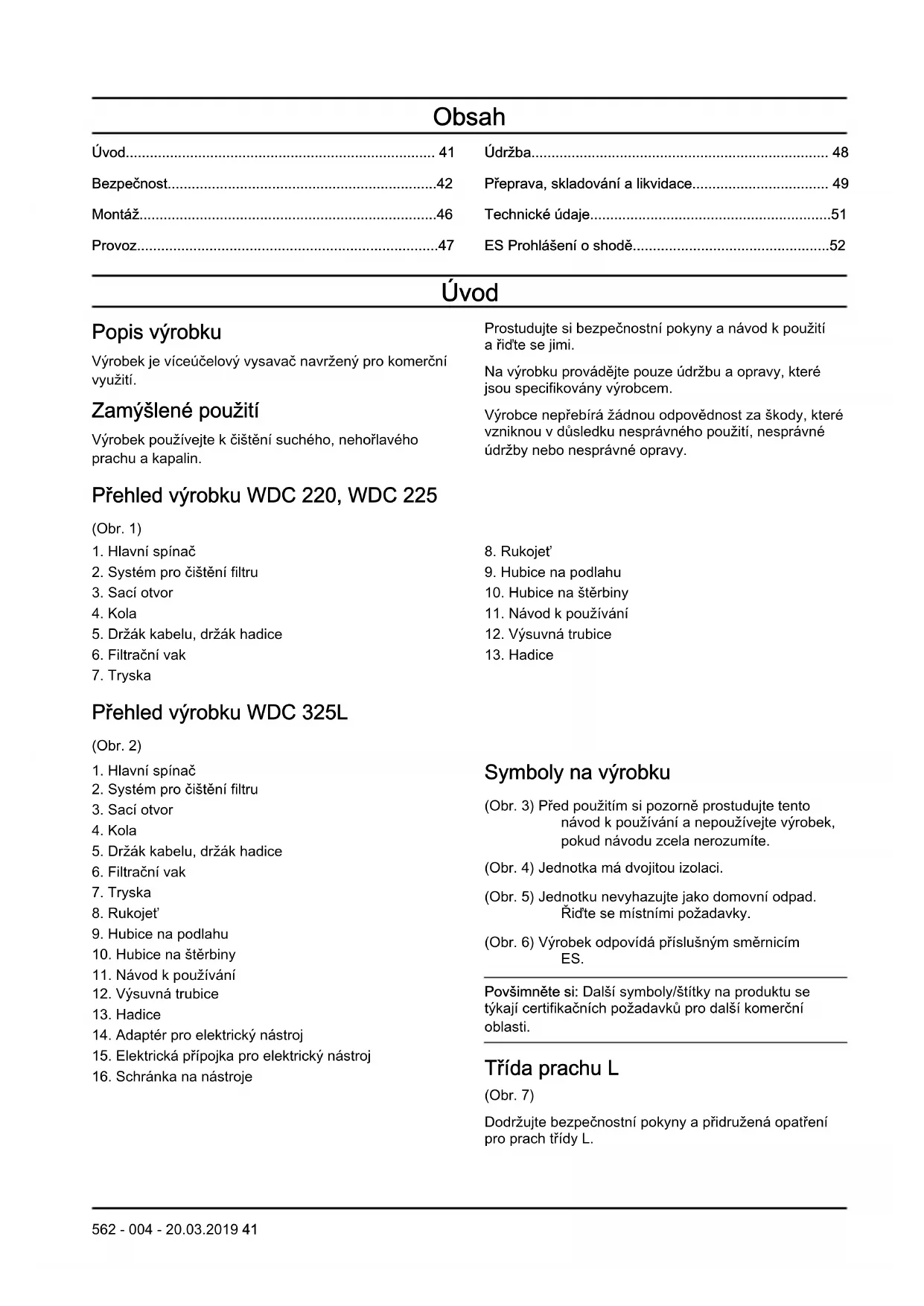 - от 26 февруари 2014 г., „свързана с електромагнитната съвместимост“ 2014/30/ЕС Приложени са следните стандарти: EN 60335-1:2012+A11:2014, EN 60335-2-69:2012, EN 55014-1:2006+A1:2009+A2:2011, EN 55014-2:2015, EN 61000-3-2:2014, EN 61000-3-3:2013 Ако не е указано друго, посочените по-горе стандарти са последните публикувани версии. Huskvarna, 2018-08-01 Корнелия Екблад, директор продуктово управление 40 562 - 004 - 20.03.2019Obsah Úvod............................................................................. 41 Bezpečnost...................................................................42 Montáž..........................................................................46 Provoz...........................................................................47 Údržba.......................................................................... 48 Přeprava, skladování a likvidace.................................. 49 Technické údaje............................................................51 ES Prohlášení o shodě.................................................52 Úvod Popis výrobku Výrobek je víceúčelový vysavač navržený pro komerční využití. Zamýšlené použití Výrobek používejte k čištění suchého, nehořlavého prachu a kapalin. Prostudujte si bezpečnostní pokyny a návod k použití a řiďte se jimi. Na výrobku provádějte pouze údržbu a opravy, které jsou specifikovány výrobcem. Výrobce nepřebírá žádnou odpovědnost za škody, které vzniknou v důsledku nesprávného použití, nesprávné údržby nebo nesprávné opravy. Přehled výrobku WDC 220, WDC 225 (Obr. 1)