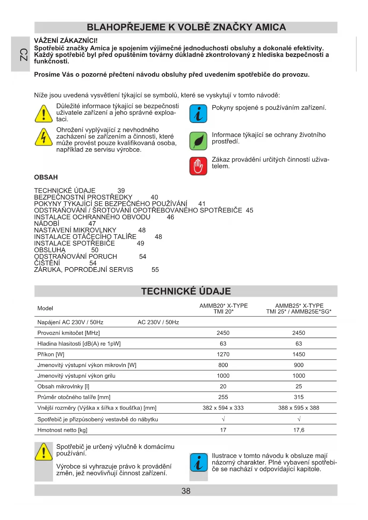ModelAMMB20* X-TYPETMI 20*AMMB25* X-TYPETMI 25* / AMMB25E*SG*Napájení AC 230V / 50Hz AC 230V / 50HzProvozní kmitočet [MHz] 2450 2450Hladina hlasitosti [dB(A) re 1pW] 63 63Příkon [W] 1270 1450 Jmenovitý výstupní výkon mikrovln [W] 800 900 Jmenovitý výstupní výkon grilu 1000 1000Obsah mikrovlnky [l] 20 25Průměr otočného talíře [mm] 255 315 Vnější rozměry (Výška x šířka x tloušťka) [mm] 382 x 594 x 333 388 x 595 x 388 Spotřebič je přizpůsobený vestavbě do nábytku √ √Hmotnost netto [kg] 17 17,639