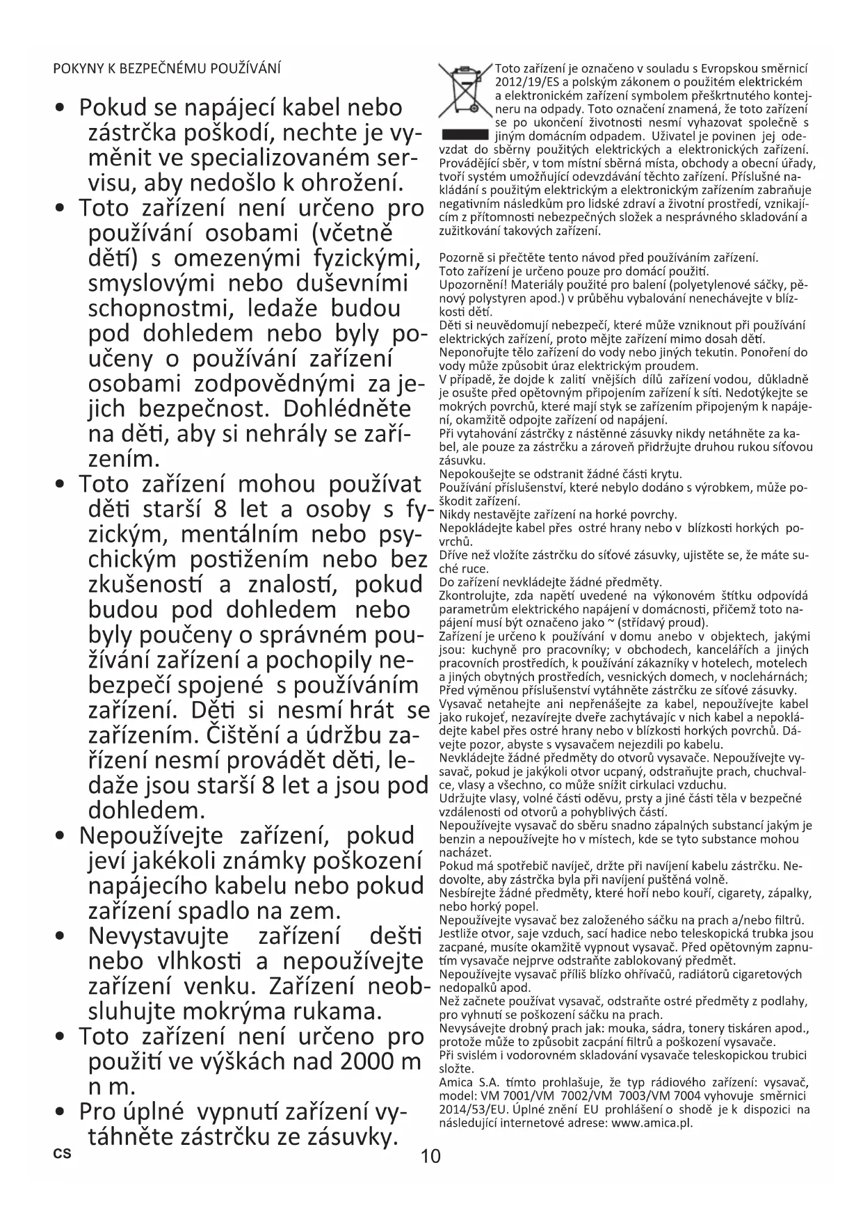 power of the vacu- um cleaner Dust bag full indicator You need to re- place the dust bag Vacuum cleaner hose clogged Remove dust, hair, and other obstruc- ons that may reduce airow. If the problem is not solved, unplug the appliance from power and report the fault to the nearest service centre. Note! All repairs must be performed by qualied service technicians.10 Toto zařízení je označeno v souladu s Evropskou směrnicí 2012/19/ES a polským zákonem o použitém elektrickém a elektronickém zařízení symbolem přeškrtnutého kontej- neru na odpady. Toto označení znamená, že toto zařízení se po ukončení životnos nesmí vyhazovat společně s jiným domácním odpadem. Uživatel je povinen jej ode- vzdat do sběrny použitých elektrických a elektronických zařízení. Provádějící sběr, v tom místní sběrná místa, obchody a obecní úřady, tvoří systém umožňující odevzdávání těchto zařízení. Příslušné na- kládání s použitým elektrickým a elektronickým zařízením zabraňuje negavním následkům pro lidské zdraví a životní prostředí, vznikají- cím z přítomnos nebezpečných složek a nesprávného skladování a zužitkování takových zařízení. Pozorně si přečtěte tento návod před používáním zařízení. Toto zařízení je určeno pouze pro domácí použi. Upozornění! Materiály použité pro balení (polyetylenové sáčky, pě- nový polystyren apod.) v průběhu vybalování nenechávejte v blíz- kos dě. Dě si neuvědomují nebezpečí, které může vzniknout při používání elektrických zařízení, proto mějte zařízení mimo dosah dě. Neponořujte tělo zařízení do vody nebo jiných tekun. Ponoření do vody může způsobit úraz elektrickým proudem. V případě, že dojde k zali vnějších dílů zařízení vodou, důkladně je osušte před opětovným připojením zařízení k sí. Nedotýkejte se mokrých povrchů, které mají styk se zařízením připojeným k napáje- ní, okamžitě odpojte zařízení od napájení. Při vytahování zástrčky z nástěnné zásuvky nikdy netáhněte za ka- bel, ale pouze za zástrčku a zároveň přidržujte druhou rukou síťovou zásuvku. Nepokoušejte se odstranit žádné čás krytu. Používání příslušenství, které nebylo dodáno s výrobkem, může po- škodit zařízení. Nikdy nestavějte zařízení na horké povrchy. Nepokládejte kabel přes ostré hrany nebo v blízkos horkých po- vrchů. Dříve než vložíte zástrčku do síťové zásuvky, ujistěte se, že máte su- ché ruce. Do zařízení nevkládejte žádné předměty. Zkontrolujte, zda napě uvedené na výkonovém štku odpovídá parametrům elektrického napájení v domácnos, přičemž toto na- pájení musí být označeno jako ~ (střídavý proud). Zařízení je určeno k používání v domu anebo v objektech, jakými jsou: kuchyně pro pracovníky; v obchodech, kancelářích a jiných pracovních prostředích, k používání zákazníky v hotelech, motelech a jiných obytných prostředích, vesnických domech, v noclehárnách; Před výměnou příslušenství vytáhněte zástrčku ze síťové zásuvky. Vysavač netahejte ani nepřenášejte za kabel, nepoužívejte kabel jako rukojeť, nezavírejte dveře zachytávajíc v nich kabel a nepoklá- dejte kabel přes ostré hrany nebo v blízkos horkých povrchů. Dá- vejte pozor, abyste s vysavačem nejezdili po kabelu. Nevkládejte žádné předměty do otvorů vysavače. Nepoužívejte vy- savač, pokud je jakýkoli otvor ucpaný, odstraňujte prach, chuchval- ce, vlasy a všechno, co může snížit cirkulaci vzduchu. Udržujte vlasy, volné čás oděvu, prsty a jiné čás těla v bezpečné vzdálenos od otvorů a pohyblivých čás. Nepoužívejte vysavač do sběru snadno zápalných substancí jakým je benzin a nepoužívejte ho v místech, kde se tyto substance mohou nacházet. Pokud má spotřebič navíječ, držte při navíjení kabelu zástrčku. Ne- dovolte, aby zástrčka byla při navíjení puštěná volně. Nesbírejte žádné předměty, které hoří nebo kouří, cigarety, zápalky, nebo horký popel. Nepoužívejte vysavač bez založeného sáčku na prach a/nebo ltrů. Jestliže otvor, saje vzduch, sací hadice nebo teleskopická trubka jsou zacpané, musíte okamžitě vypnout vysavač. Před opětovným zapnu- m vysavače nejprve odstraňte zablokovaný předmět. Nepoužívejte vysavač příliš blízko ohřívačů, radiátorů cigaretových nedopalků apod. Než začnete používat vysavač, odstraňte ostré předměty z podlahy, pro vyhnu se poškození sáčku na prach. Nevysávejte drobný prach jak: mouka, sádra, tonery skáren apod., protože může to způsobit zacpání ltrů a poškození vysavače. Při svislém i vodorovném skladování vysavače teleskopickou trubici složte. Amica S.A. mto prohlašuje, že typ rádiového zařízení: vysavač, model: VM 7001/VM 7002/VM 7003/VM 7004 vyhovuje směrnici 2014/53/EU. Úplné znění EU prohlášení o shodě je k dispozici na následující internetové adrese: www.amica.pl.