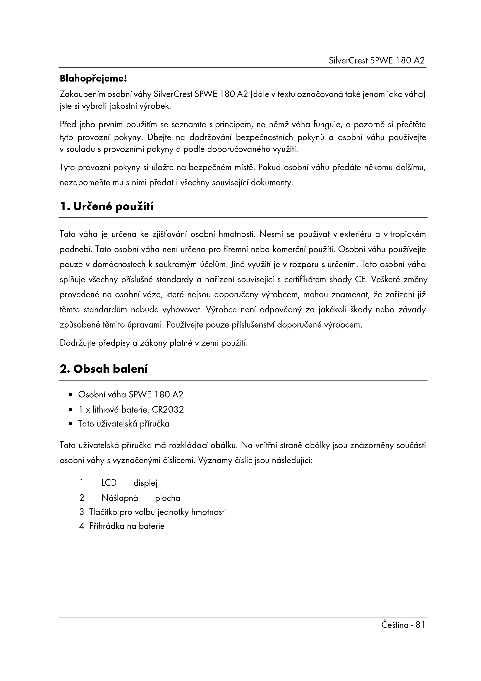 - Tato uživatelská příručka Tato uživatelská příručka má rozkládací obálku. Na vnitřní straně obálky jsou znázorněny součásti osobní váhy s vyznačenými číslicemi. Významy číslic jsou následující: 1 LCD displej 2 Nášlapná plocha 3 Tlačítko pro volbu jednotky hmotnosti 4 Přihrádka na baterieSilverCrest SPWE 180 A2