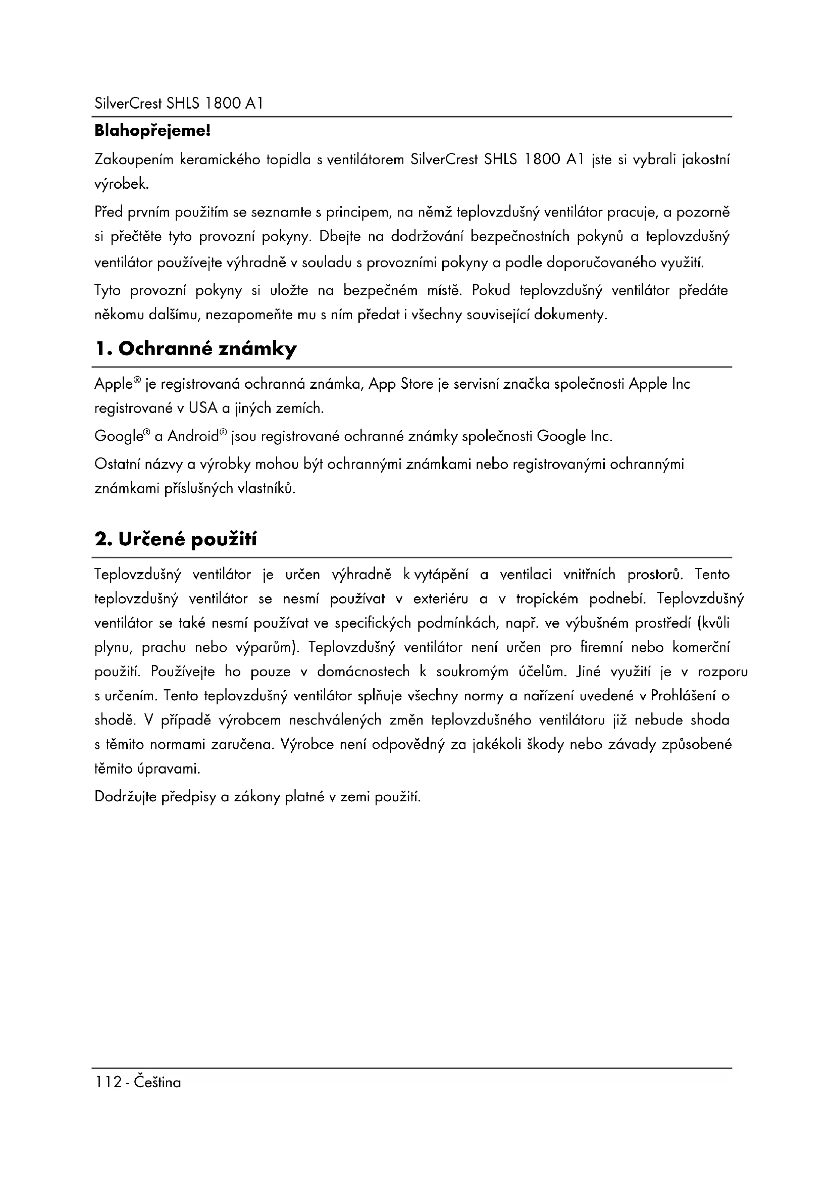 Blahopřejeme! Zakoupením keramického topidla s ventilátorem SilverCrest SHLS 1800 A1 jste si vybrali jakostní výrobek. Před prvním použitím se seznamte s principem, na němž teplovzdušný ventilátor pracuje, a pozorně si přečtěte tyto provozní pokyny. Dbejte na dodržování bezpečnostních pokynů a teplovzdušný ventilátor používejte výhradně v souladu s provozními pokyny a podle doporučovaného využití. Tyto provozní pokyny si uložte na bezpečném místě. Pokud teplovzdušný ventilátor předáte někomu dalšímu, nezapomeňte mu s ním předat i všechny související dokumenty.