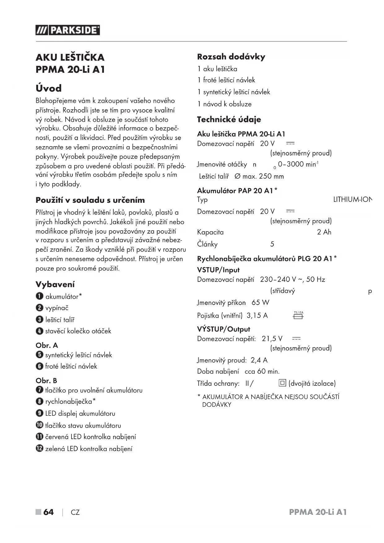 PPMA 20-Li A1 Úvod Blahopřejeme vám kzakoupení vašeho nového přístroje. Rozhodli jste se tím pro vysoce kvalitní vý robek. Návod kobsluze je součástí tohoto výrobku. Obsahuje důležité informace obezpeč- nosti, použití a likvidaci. Před použitím výrobku se seznamte se všemi provozními a bezpečnostními pokyny. Výrobek používejte pouze předepsaným způsobem a pro uvedené oblasti použití. Při předá- vání výrobku třetím osobám předejte spolu sním ityto podklady. Použití vsouladu surčením Přístroj je vhodný k leštění laků, povlaků, plastů a jiných hladkých povrchů. Jakékoli jiné použití nebo modifikace přístroje jsou považovány za použití vrozporu surčením a představují závažné nebez- pečí zranění. Za škody vzniklé při použití vrozporu surčením neneseme odpovědnost. Přístroj je určen pouze pro soukromé použití. Vybavení akumulátor* vypínač lešticí talíř stavěcí kolečko otáček Obr.A syntetický lešticí návlek froté lešticí návlek Obr.B tlačítko pro uvolnění akumulátoru rychlonabíječka* LED displej akumulátoru tlačítko stavu akumulátoru červená LED kontrolka nabíjení zelená LED kontrolka nabíjení Rozsah dodávky 1 aku leštička 1 froté lešticí návlek 1 syntetický lešticí návlek 1návod kobsluze Technické údaje Aku leštička PPMA 20-Li A1 Domezovací napětí 20V (stejnosměrný proud) Jmenovité otáčky n