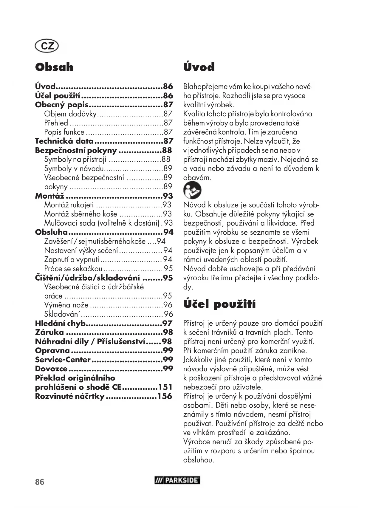 - Úvod Blahopřejeme vám ke koupi vašeho nové- ho přístroje. Rozhodli jste se pro vysoce kvalitní výrobek. Kvalita tohoto přístroje byla kontrolována během výroby a byla provedena také závěrečná kontrola. Tím je zaručena funkčnost přístroje. Nelze vyloučit, že v jednotlivých případech se na nebo v přístroji nachází zbytky maziv. Nejedná se o vadu nebo závadu a není to důvodem k obavám. Návod k obsluze je součástí tohoto výrob- ku. Obsahuje důležité pokyny týkající se bezpečnosti, používání a likvidace. Před použitím výrobku se seznamte se všemi pokyny k obsluze a bezpečnosti. Výrobek používejte jen k popsaným účelům a v rámci uvedených oblastí použití. Návod dobře uschovejte a při předávání výrobku třetímu předejte i všechny podkla- dy. Účel použití Přístroj je určený pouze pro domácí použití ksečení trávníků a travních ploch. Tento přístroj není určený pro komerční využití. Při komerčním použití záruka zanikne. Jakékoliv jiné použití, které není vtomto návodu výslovně připuštěné, může vést kpoškození přístroje a představovat vážné nebezpečí pro uživatele. Přístroj je určený kpoužívání dospělými osobami. Děti nebo osoby, které se nese- známily stímto návodem, nesmí přístroj používat. Používání přístroje za deště nebo ve vlhkém prostředí je zakázáno. Výrobce neručí za škody způsobené po- užitím vrozporu surčením nebo špatnou obsluhou. Překlad originálního prohlášení o shodě CE p. 151